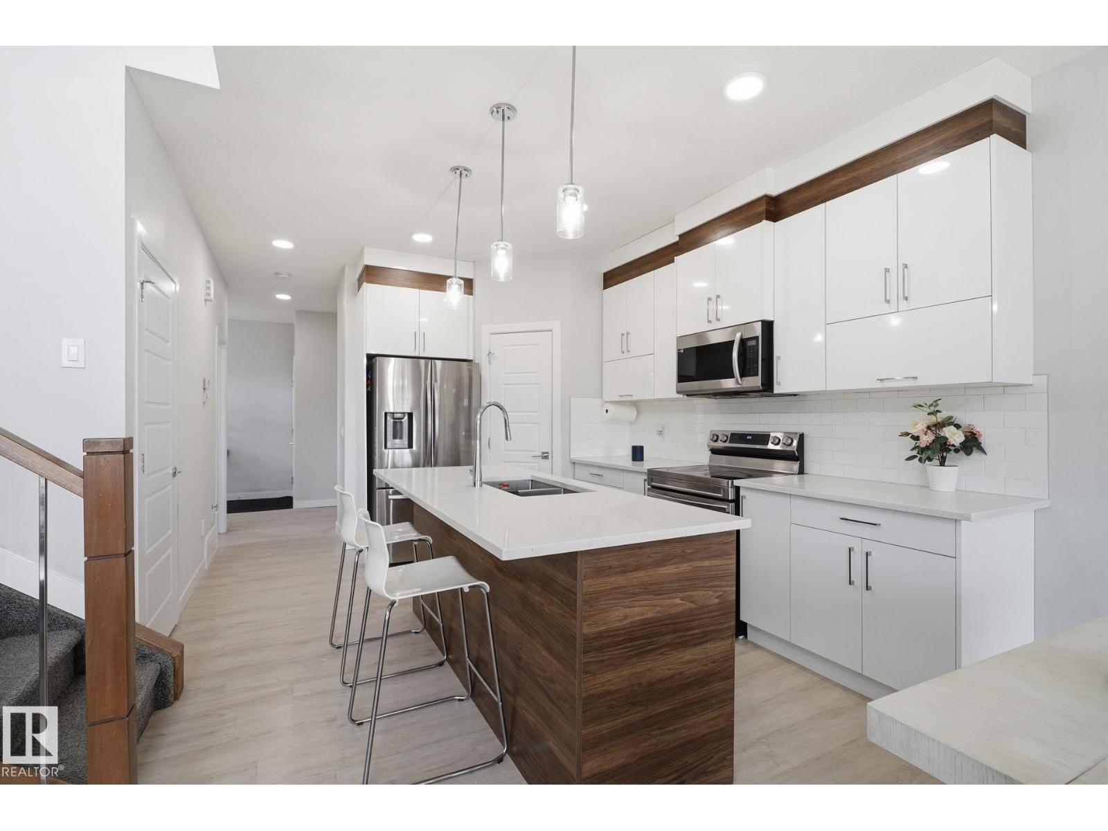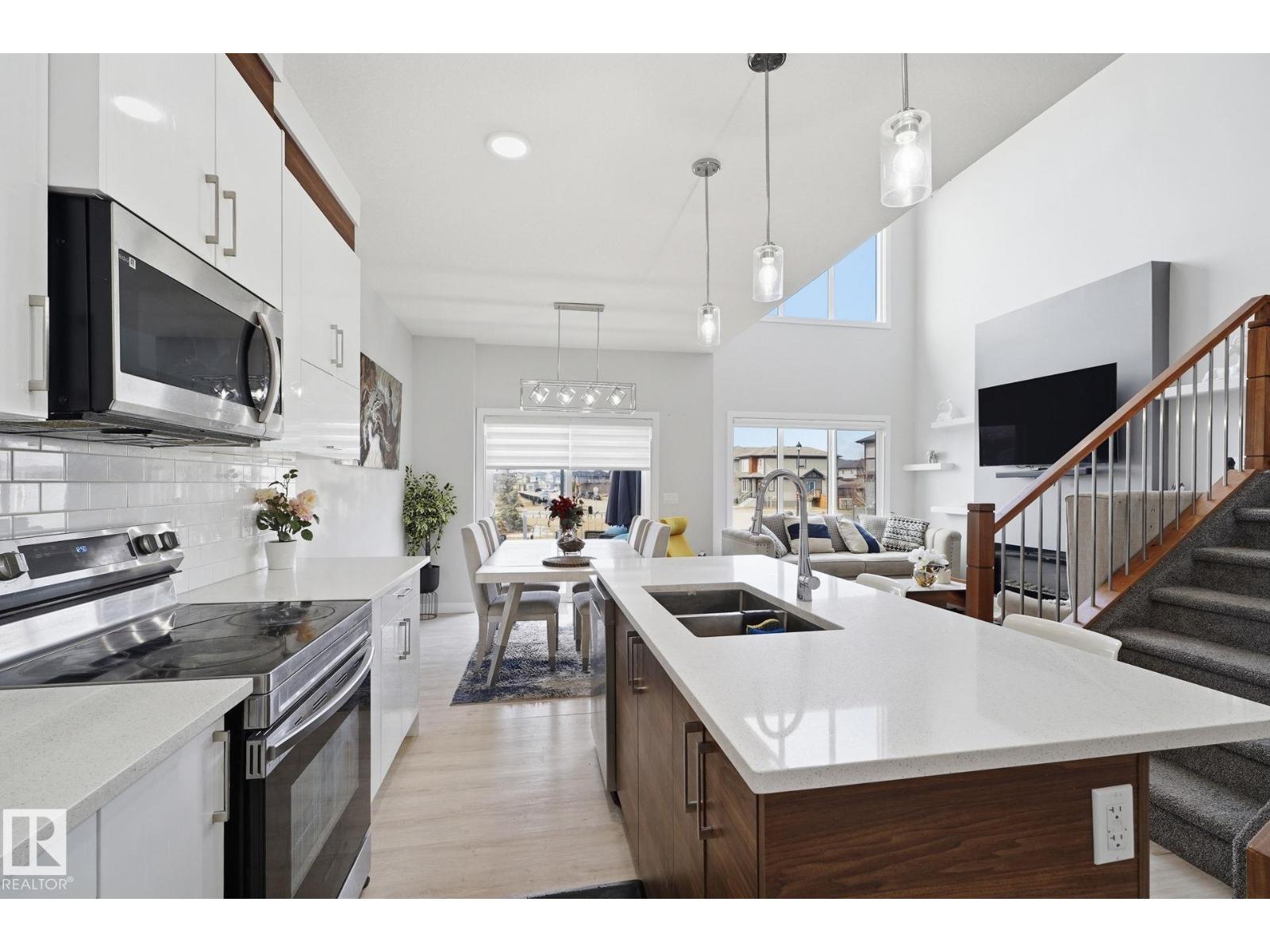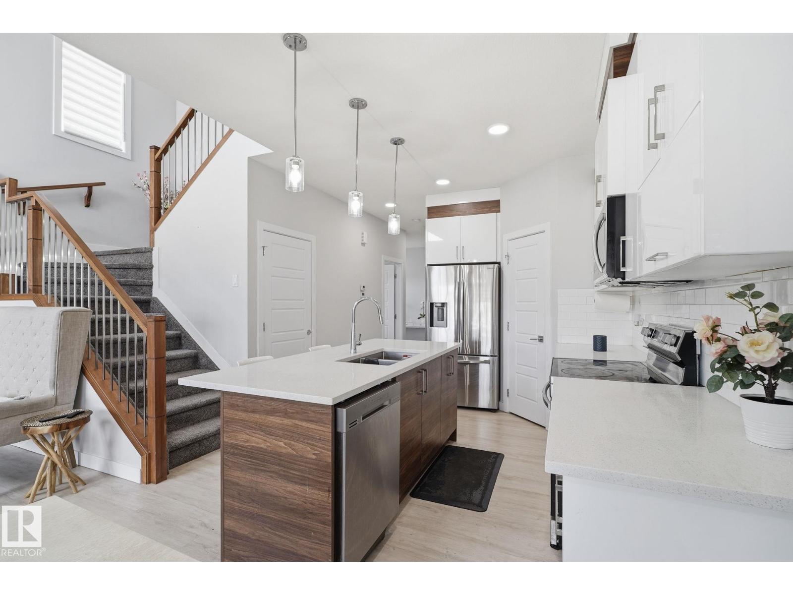 Welcome to this well maintained half duplex located in the community of West heaven in Leduc. This 2 story home features deck, fully landscaped, double attached garage, backs onto green space & school and a developed basement for additional living space. The main floor features 9ft ceilings, open to above Great room w/ fireplace, kitchen w/ plenty of cabinets, corner pantry and stainless steel appliances, office/den & 2 pc bath complete this level. Upstairs you will find the primary bedroom w/ walk in closet and 4pc ensuite, 2 more good sized bedrooms, 4pc bath and laundry room. The developed basement w/ separate side entrance has 2 bedrooms, partial kitchen, 2nd laundry and recreation space. (id:63190)