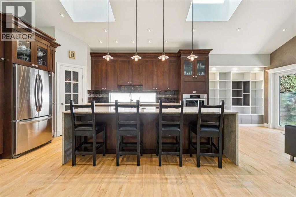 UNPARALLELED LUXURY BUNGALOW IN DISCOVERY RIDGE BACKING ONTO GREENSPACE WITH DESIGNER FINISHES & SMART HOME LIVING! This stunning 1400+ sqft bungalow with an additional 1300+ sqft of fully finished basement space offers an open-concept layout enhanced by soaring vaulted ceilings, skylights, and maple flooring throughout. The chef-inspired kitchen is a true showpiece, featuring cherry cabinetry, built-ins, instant hot water, and a waterfall marble island with cooktop and eat-up seating. Entertain in the elegant formal dining room or relax in the inviting living room with a cozy fireplace. The primary retreat boasts a luxurious 5PC ensuite and walk-in closet, while a second bedroom, 3PC bath, and convenient main floor laundry complete the level. The fully finished basement features cork flooring, a dry bar with wine fridge, spacious rec room and second living area with fireplace, plus 2 additional bedrooms and a 4PC bath. Enjoy the professionally landscaped yard backing onto greenspace with a massive deck, all tucked away on a quiet cul-de-sac surrounded by nature. Located in the highly sought-after Discovery Ridge, a prestigious west Calgary community known for its direct access to Griffith Woods Park, scenic forested pathways, Elbow River valley, and an unmatched nature-filled lifestyle just minutes from the city. (id:63190)