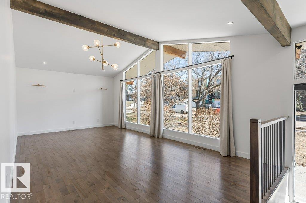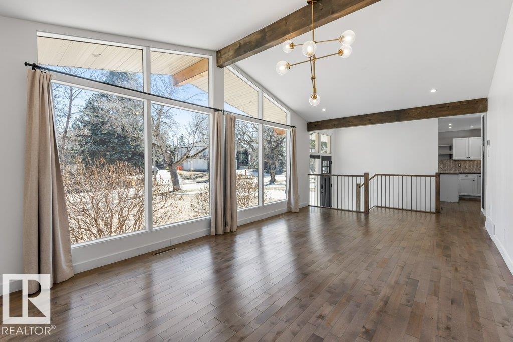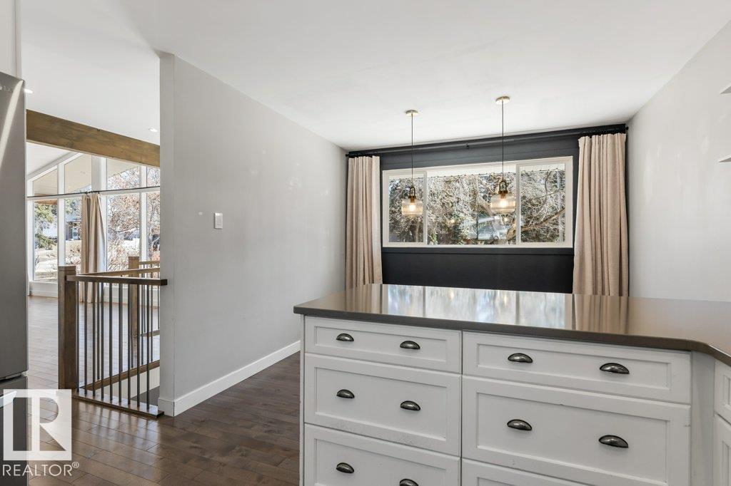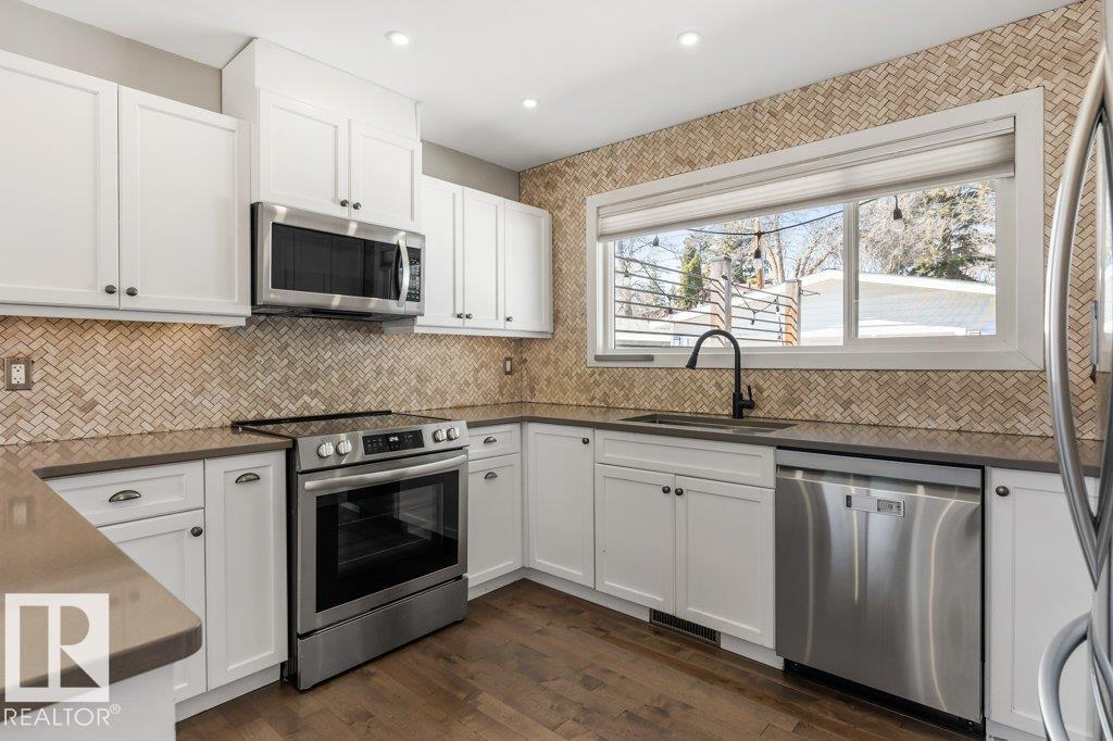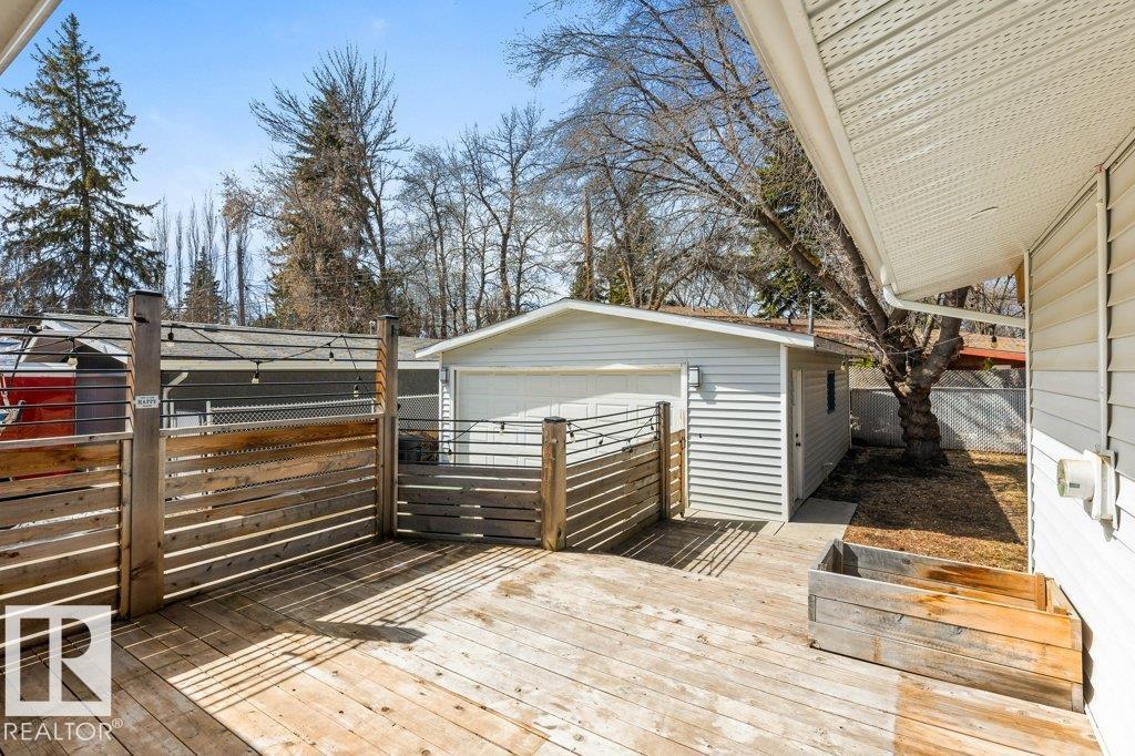 Welcome to this beautifully maintained 1,216 sq ft bungalow in the sought-after Gardens neighborhood of St. Albert. This home offers three spacious bedrooms on the main floor, including a primary suite with its own 3-piece ensuite, plus a full 4-piece main bath. The bright and inviting living room features vaulted ceilings, open beams, and large banks of windows that flood the space with natural light. The updated kitchen boasts quartz countertops and stainless steel appliances, with a separate dining area ideal for family meals and entertaining. Downstairs, the fully finished basement provides a large recreation room, versatile flex space, and ample storage with a dedicated laundry area and additional room for future development. Outside, enjoy a private deck with a built-in privacy screen, perfect for relaxing or hosting guests, along with a double detached garage. Located in a fantastic neighborhood close to downtown, Lions Park, the farmers’ market, schools, and all amenities. (id:63190)