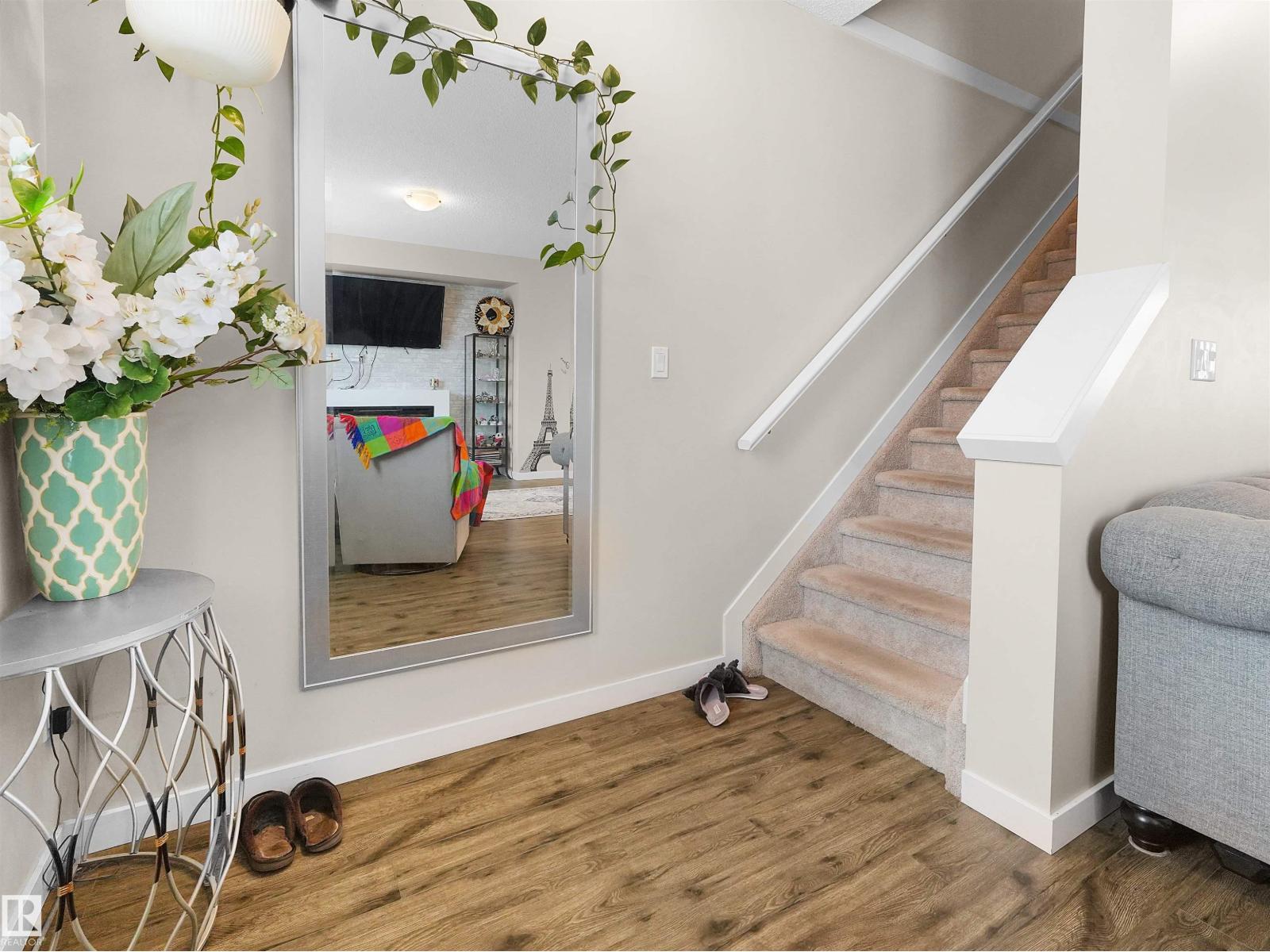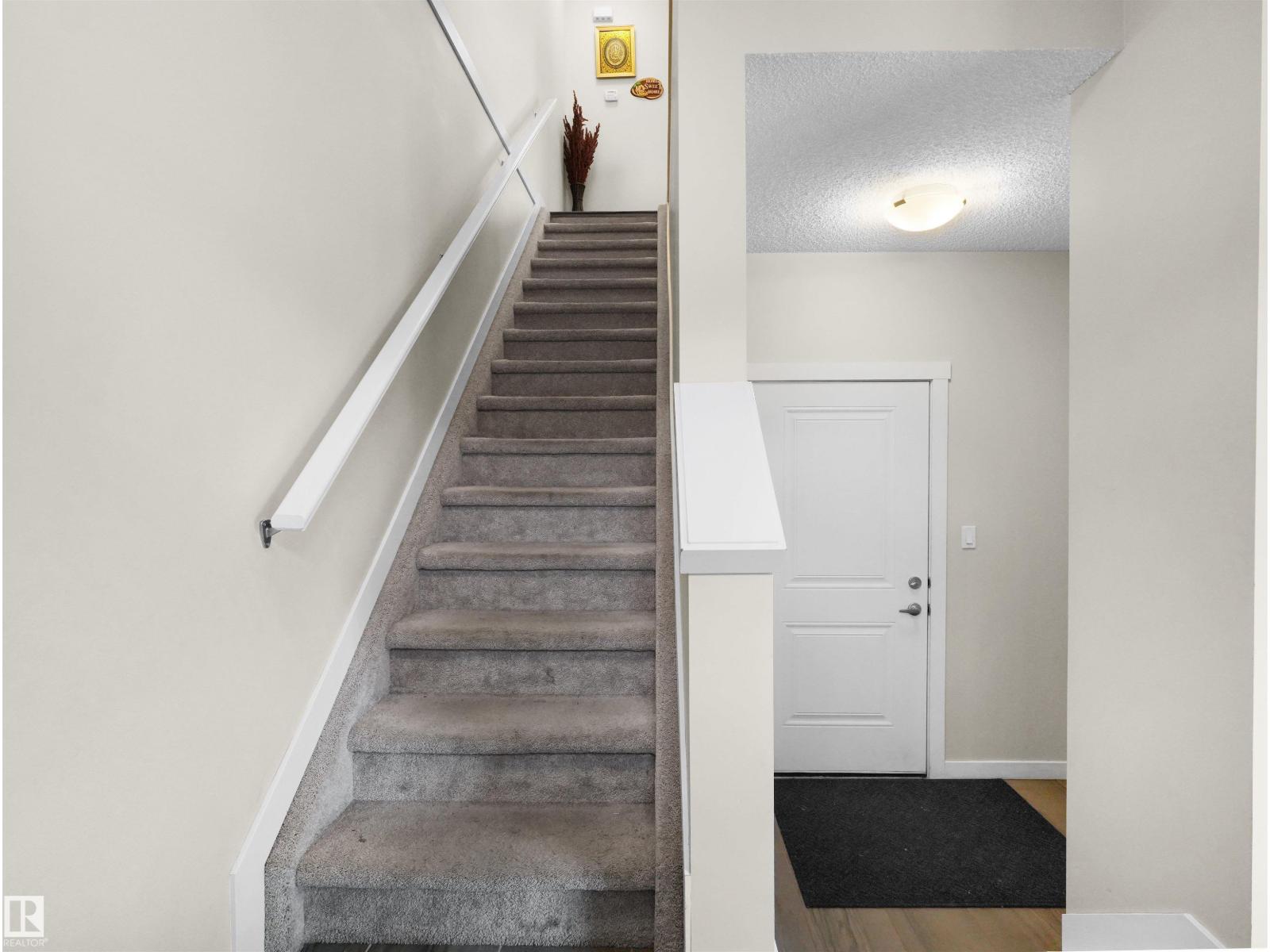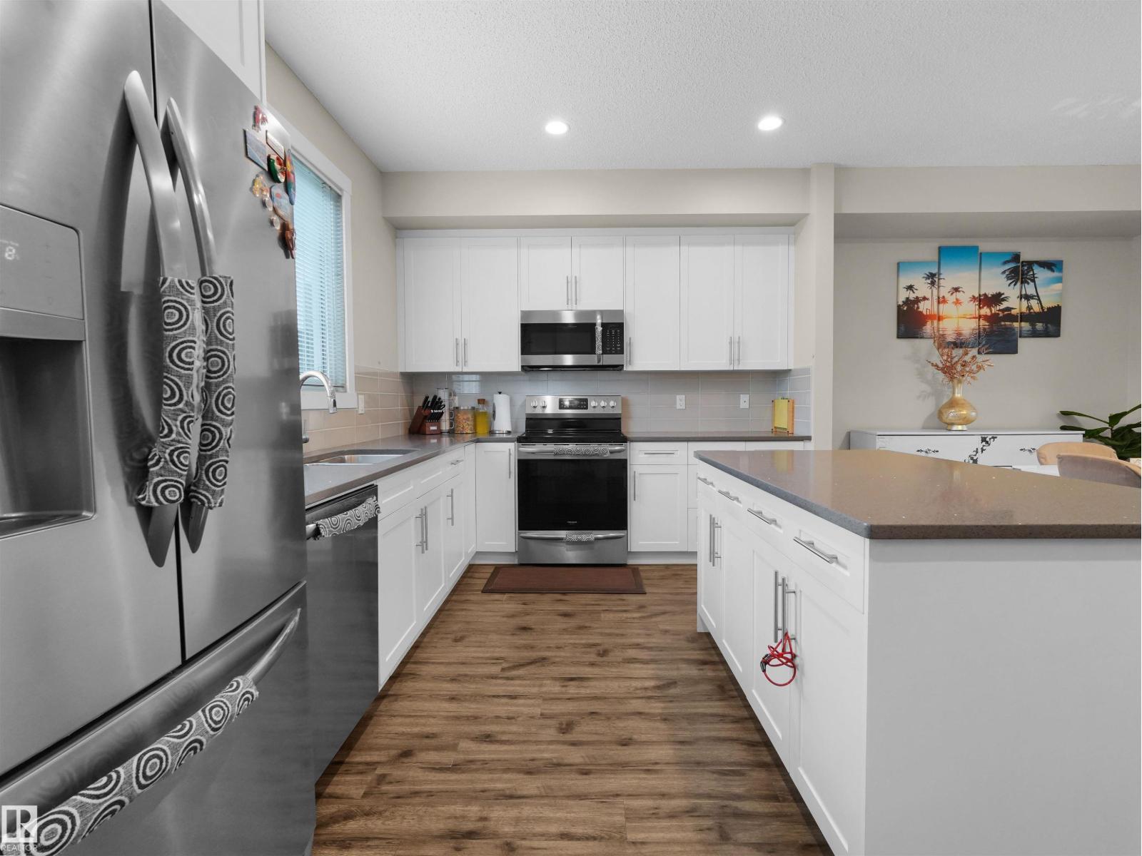 In the beautiful community of Allard, this 3-storey townhouse is a former showhome featuring a modern & open-concept with premium upgrades throughout. Built in 2018, this luxurious home offers 1693 sqft of living space. The main level includes attached double garage & a office space. The second level has 9-foot ceilings, bright & spacious living area, gorgeous kitchen complete with S/S appliances, quartz countertops, tiled backsplash, soft-close cabinetry & vinyl plank flooring. Large windows fill the home with natural light and the Balcony deck is perfect for summer BBQ. Upstairs you will find a spacious primary suite with a private ensuite bathroom, along with 2 additional bedrooms and a full bathroom. the laundry is also located on the upper level for convinience. This maintained complex is within walking distance to all amenities, including K–9 & high school, and future access to the South Hospital and LRT expansion. With low condo fees, this home is ideal for first-time buyers with low monthly cost. (id:63190)