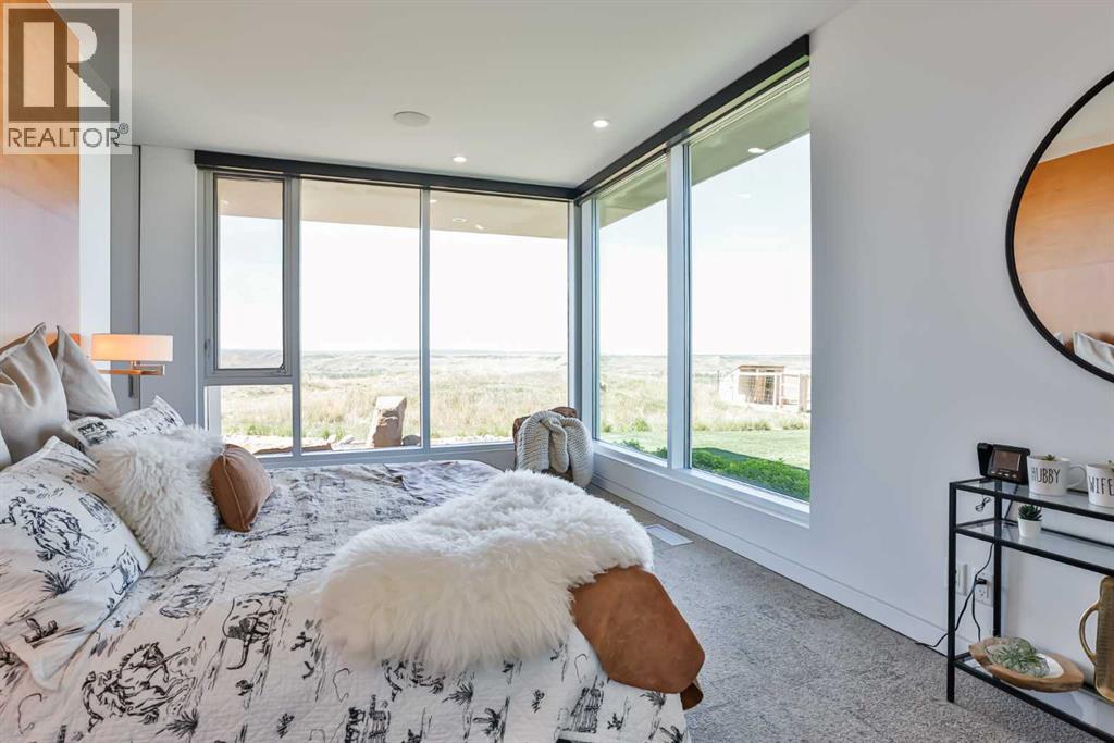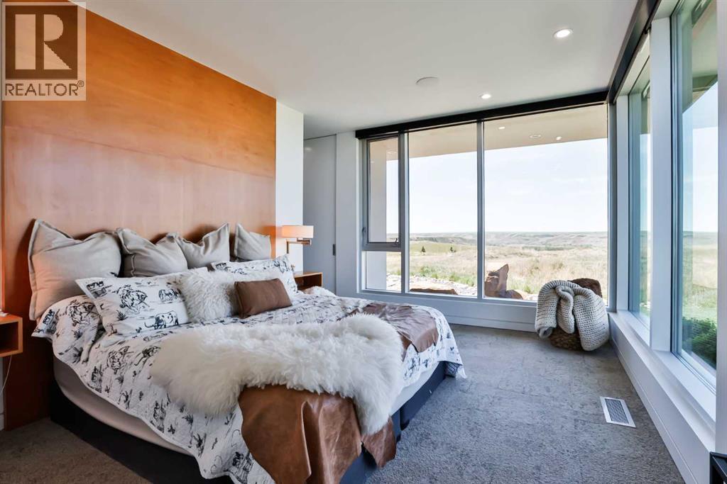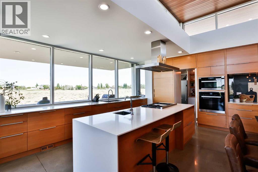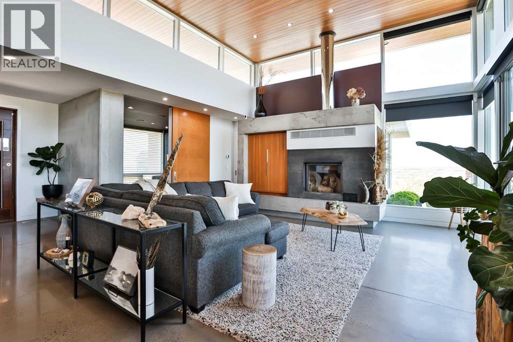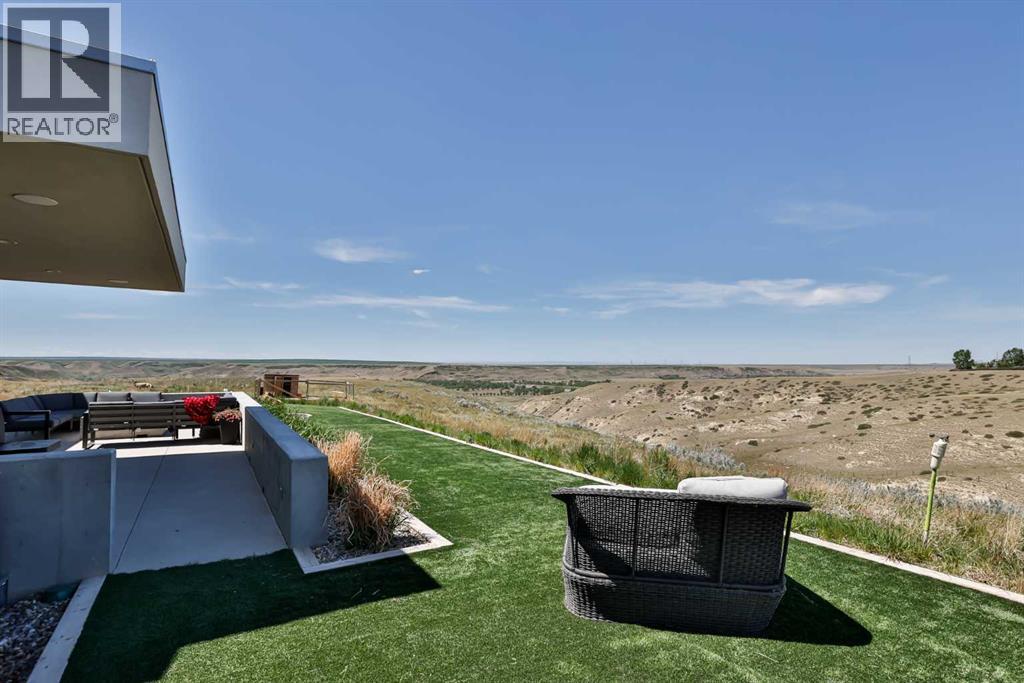 This property is as close to *Selling Sunset* as you'll find in Southern Alberta! This sprawling modern bungalow will capture your attention with the breathtaking view of the coulee in the distance. Stepping through the impressive wood pivot door, you know you're in for a treat. The main floor features 14-foot ceilings, complemented by floor-to-ceiling triple-pane commercial glass windows that will leave you speechless! The open-concept layout seamlessly combines the dining, living, and kitchen areas, with polished concrete floors being warmed by light wood cabinetry. The sleek white, quartz countertops, showcase your kitchen and island area, with windows that create a delightful connection between your indoor and outdoor spaces. The impressive appliance package, featuring a gas cooktop, a cabinet-paneled oversized fridge, a built-in microwave and oven, and a wine fridge. A coffee lover's dream, a built-in Miele espresso machine rivals even the best cafés. A cleverly hidden pantry door adds an extra touch of seamlessness! The living room is anchored by an oversized wood-burning fireplace, transom windows fill the space with natural light. There is an office with stylish floating shelves sits off of the Living room. The primary suite, features floor-to-ceiling windows that wrap the corner, providing spectacular morning & sunset views right from your bed. The walk-around closet is a shopper's dream, while the bright and airy ensuite features double vanities and a luxurious steam shower. Off the kitchen lies a spacious laundry/all-purpose room perfect for sewing or supervising homework while you prepare dinner. In the east wing, you’ll find three spare bedrooms. One has its own ensuite bathroom, while the other two share a Jack and Jill bathroom with a beautifully tiled shower, double vanities, and a skylight that invites natural light. Continuing down the hallway, another floor-to-ceiling glass panel reveals your very own gymnasium, measuring an impressive 32 x 40 fee t with 20-foot ceilings, complete with built-in basketball hoops, pickleball court & 3 wide closet for organizing all your sports gear. Floating wood stairs with striking black railings lead you to the basement living room, perfect for movie nights, and entertaining with your side bar. With large windows typical of a walkout basement, this space feels open and bright, completed by a half bath. Outside the gym exit, is a newly installed large sunken patio that blends with the home’s aesthetic. Complete with double gas fireplaces, a pergola, and oversized hot tub. The main patio off the kitchen features a covered deck, built-in speakers, a gas fire pit, and views that are unmatched in all of Southern Alberta. Equipped with cutting-edge technology, most lights, blinds, heating, cooling, and music can be controlled via a control panel or your phone—an upgrade valued at $100,000! The home also offers both forced air and indulgent in-floor heating. Call your REALTOR® for a private viewing today! (id:63190)