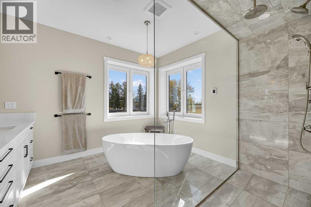 THIS COULD BE YOUR NEXT HOME! And what an EXCEPTIONAL home this is!! This property has 2.94 acres and is located just north of Didsbury so it has GOOD PROXIMITY TO TOWN. NO EXPENSE WAS SPARED while building this since the owners meant to stay here long term-MANY HIGH END UPGRADES. Let's start in the house; you will immediately realize how special it is when you step inside. You will notice the SOARING VAULTED CEILINGS, open floor plan and HUGE WINDOWS allowing in lots of natural light and giving you INCREDIBLE, PEACEFUL VIEWS. The kitchen is a CHEFS DREAM with a huge dual surface island (quartz/butcher block) w eating bar, gas stove, large pantry, copious amounts of cabinets, plenty of workspace and a breakfast nook with access out to the covered, glass enclosed, concrete deck. This kitchen has enough space for the whole family to be in and is a great area for entertaining. There is a formal dining room with custom built in cabinets and the living room has a gas fireplace. And remember those views!! There is an expansive primary bedroom with access out to that deck, gas fireplace and it has an impressively large walk in closet. The ensuite has a large walk in shower, separate tub and double vanity with lots of drawers/storage. There is also in-floor AND electric heat, making it a comfortably luxurious place to get ready for the day. There is a secondary bedroom, a large office with custom built ins (which could serve as a third bedroom if need be), main floor laundry with sink/lots of storage cabinets, a boot/mud room with bench seating, main bathroom and an inviting entryway. Head down the spiral staircase into the fully developed basement and you will find MORE EXCEPTIONAL SPACE for the whole family. There is a huge family room with gas fireplace, a gym with mirror wall, a large modified jack & jill bathroom with water closet and shower room, 2 OF THE LARGEST BEDROOMS YOU HAVE EVER SEEN, a large secured hobby room and a massive utility/mechanical room big enough t o hold all of your food prep items. The basement has a walk out to the covered patio (w/rough in for future hot tub) and there is even consideration for a future elevator. This home has TRIPLE GLAZE TILT n TURN windows making them a breeze to clean and maintain. There is CENTRAL AIR, in floor heat on BOTH levels and there are MULTIPLE WAYS TO HEAT THIS HOME (gas, wood boiler, solar). There is EXTRA R VALUE and WALL ARE EXTRA THICK making this home very tight and VERY COMFORTABLE IN EXTREME TEMPERATURES. Head out to THE BIGGEST ATTACHED GARAGE YOU HAVE EVER SEEN and you will notice that you could easily park your 5th wheel inside (14' door) with all of your other vehicles. There is also IN FLOOR HEAT IN THE GARAGE and this is where the wood boiler is. You will have plenty of storage and workspace here to appeal to those who think a garage is more important than the house! There is a solar system that can stay or go. THIS HOME WILL TAKE YOUR BREATHE AWAY-CALL TODAY TO VIEW!! (id:63190)