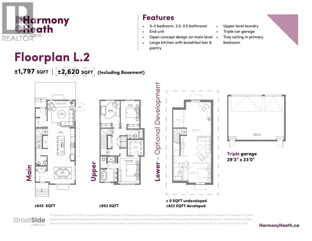 Welcome to 1125 Sailfin Heath — Streetside’s Dreamiest Opportunity! And we are closing in on builder completion. Do not miss the opportunity to learn more. This stunning 1,797 sq ft home, featuring a triple-car garage, sits on one of the most coveted lots in the development. This large 76-foot-wide private side yard stretches 130 feet deep, offering endless opportunities to create the outdoor haven you’ve been dreaming of. Whether it’s a gourmet outdoor kitchen, a serene pool, jungle gym for the kids, a workshop or a combination of it all - this space is ready to bring your dreams to life!Nestled in the heart of Harmony (An eight-time “Community of the Year” award winner), home offers more than just incredible design; it’s a gateway to an extraordinary lifestyle. Enjoy exclusive perks at Mickelson National Golf Club, practice your swing at the Launch Pad’s interactive driving range, unwind at the beach, or paddle across the stunning 40-acre lake. The community offers something for every pace of life, from fly fishing and community gardening to 17kms of paved pathways, a skate park, or beach volleyball! And there’s even more on the horizon. Harmony will soon welcome: a second 100-acre lake, Phase 2 of the Adventure Park (hello tennis/pickle ball courts!), and the highly anticipated village core filled with boutique shops, restaurants, salons, galleries, and even a Nordic Spa! But if you’re craving a change of scenery, the Rocky Mountains are just a short 45-minute drive away. Inside, this 3-bedroom, 2.5-bathroom home is designed to impress. With 8’ and 9’ knockdown ceilings, triple-pane windows, and a durable Hardie board exterior, this home combines comfort and efficiency. Luxury vinyl plank flooring is featured throughout the upper two levels, while the gourmet kitchen boasts Bosch appliances, a stylish wine bar, and elegant finishes. The open-concept living area features a cozy gas fireplace with ribbed tile detailing, creating a warm, inviting space. Upstair s, the primary suite boasts a spa-like 5-piece ensuite with a freestanding tub, and the upper-floor laundry room is thoughtfully designed for convenience and function.We look forward to seeing you at our Showhome located at 1176 Sailfin Heath during opening hours. (id:63190)