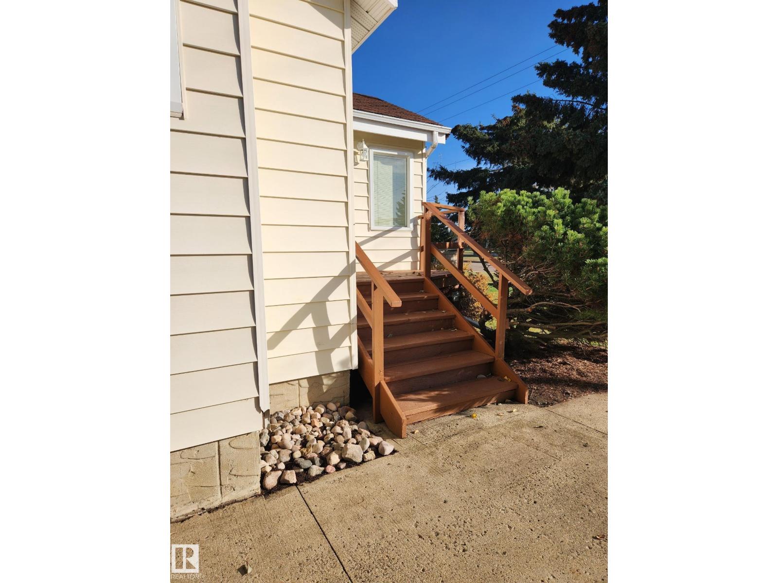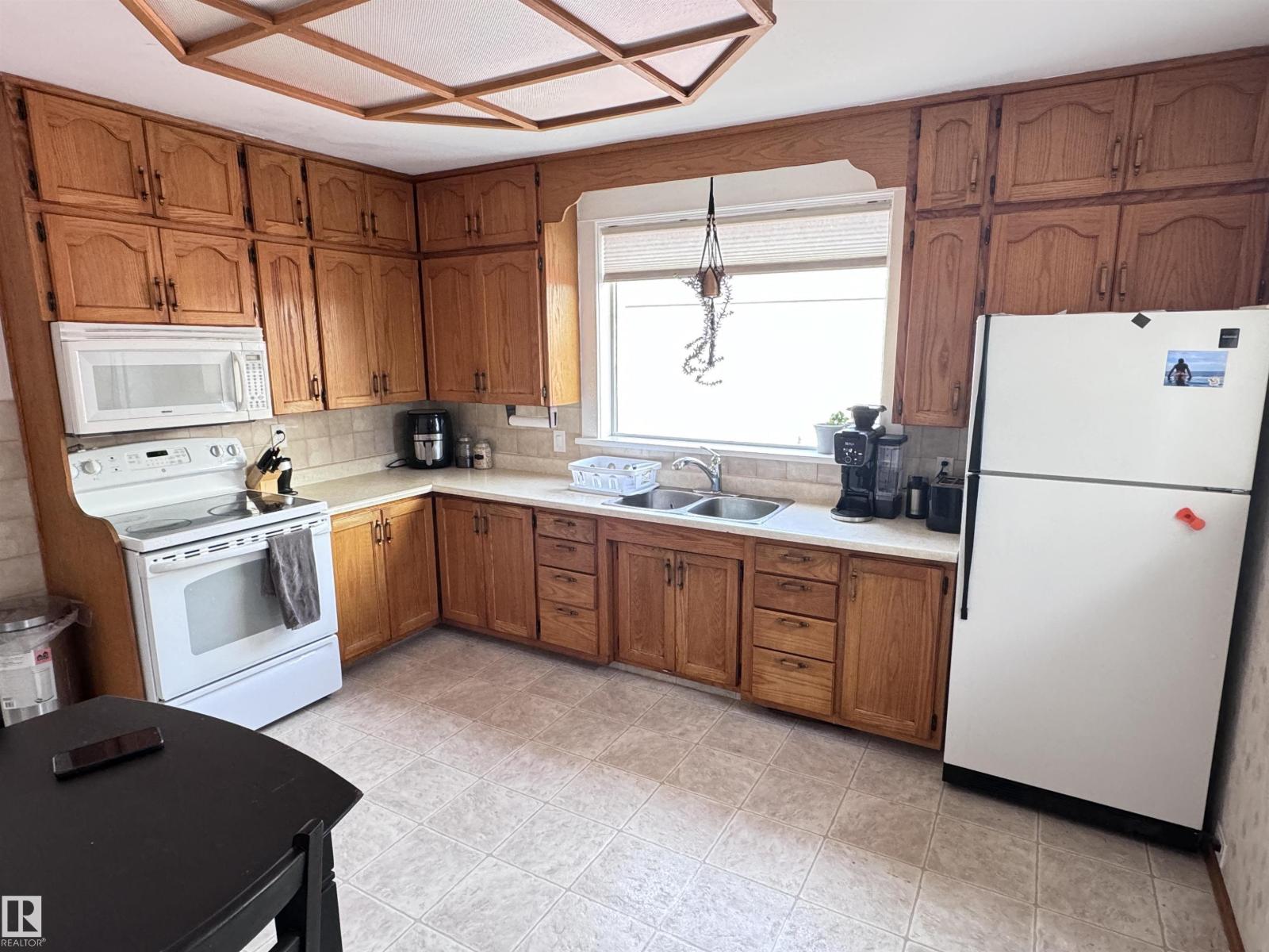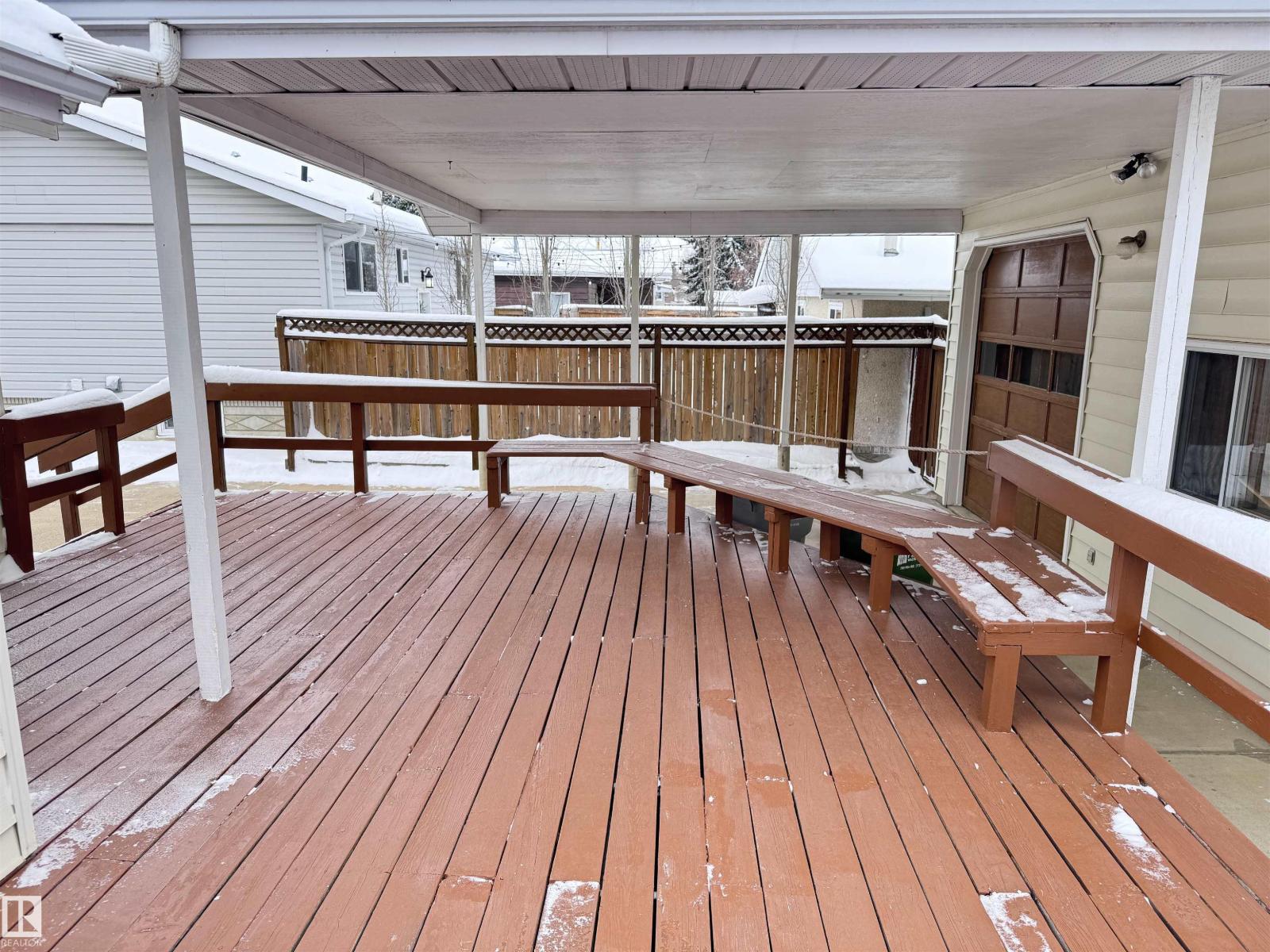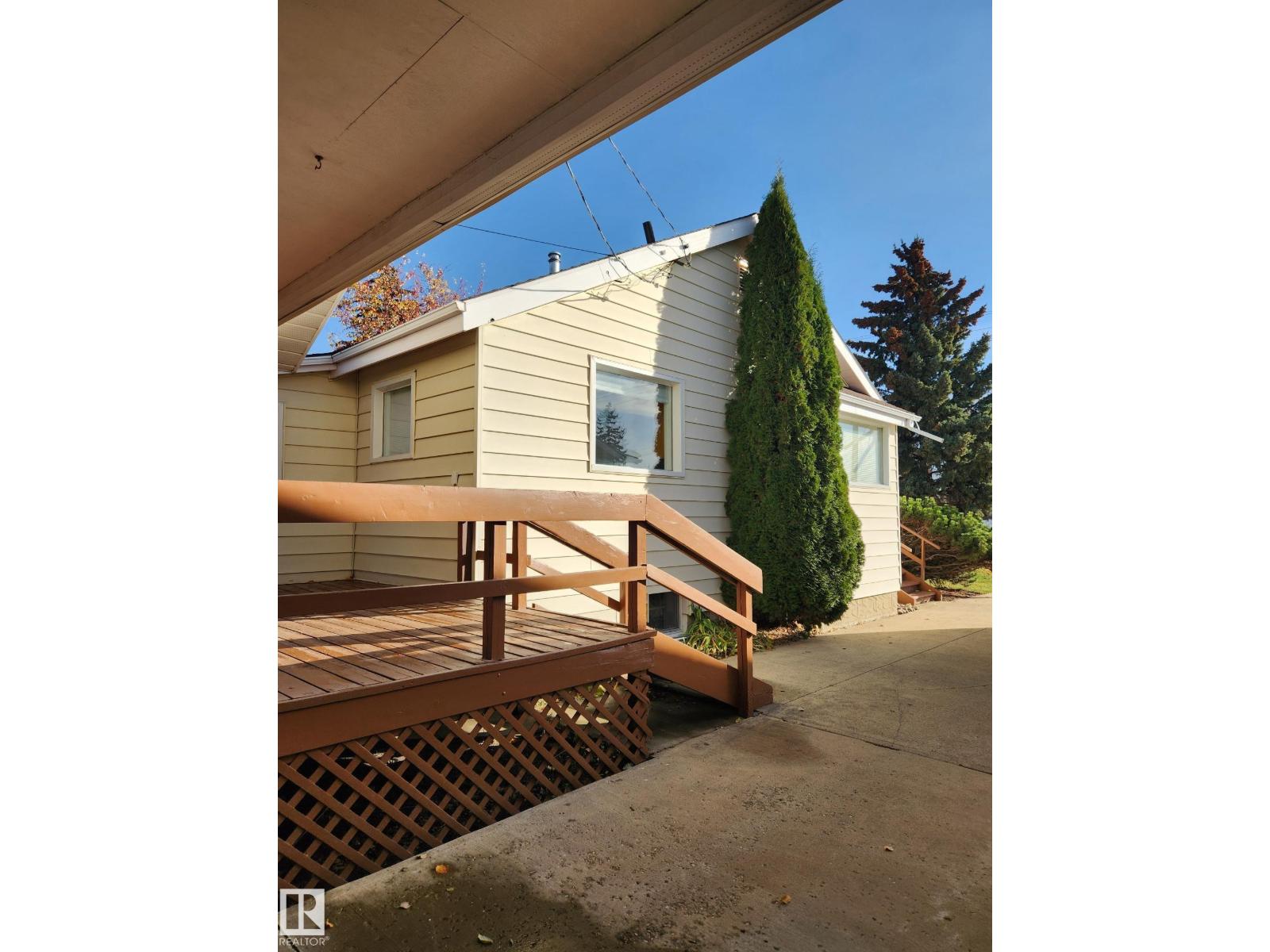 Tidy and full of character is this 900 sq.ft. bungalow in the fabulous Southview area of Westlock. Oak kitchen cabinets with sunshine box light & built-in microwave. Bright living room is right-sized & has a garden window. 2+2 bedrooms. Bright front den. Main floor laundry at rear entrance. Full bathroom is attractively appointed & has a jet-soaker tub. Basement features a 3-piece bathroom, rumpus room, 2 bedrooms & storage. Massive 26x24 heated, lined, 12' high wall, 10' high doors garage with carport on the front of it. Overhead doors on front and rear of garage (drive right through). Covered deck is large and will be repaired to ensure the next summer BBQ is enjoyable. Super-sized driveway in front, plus double parkpad at rear. 2 blocks to downtown core. 2 blocks to Westlock Rotary Spirit Centre (multi-plex sports facility). Close to schools, playground & grocery store. 2012 Hot Water Tank, Newer HE furnace. (id:63190)