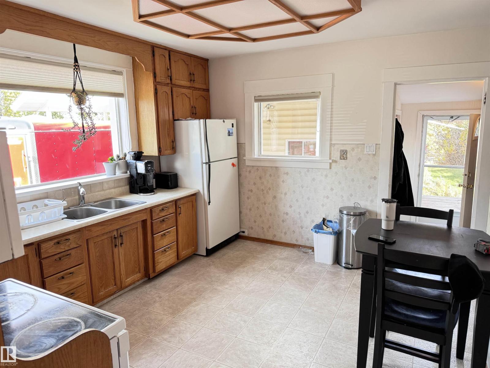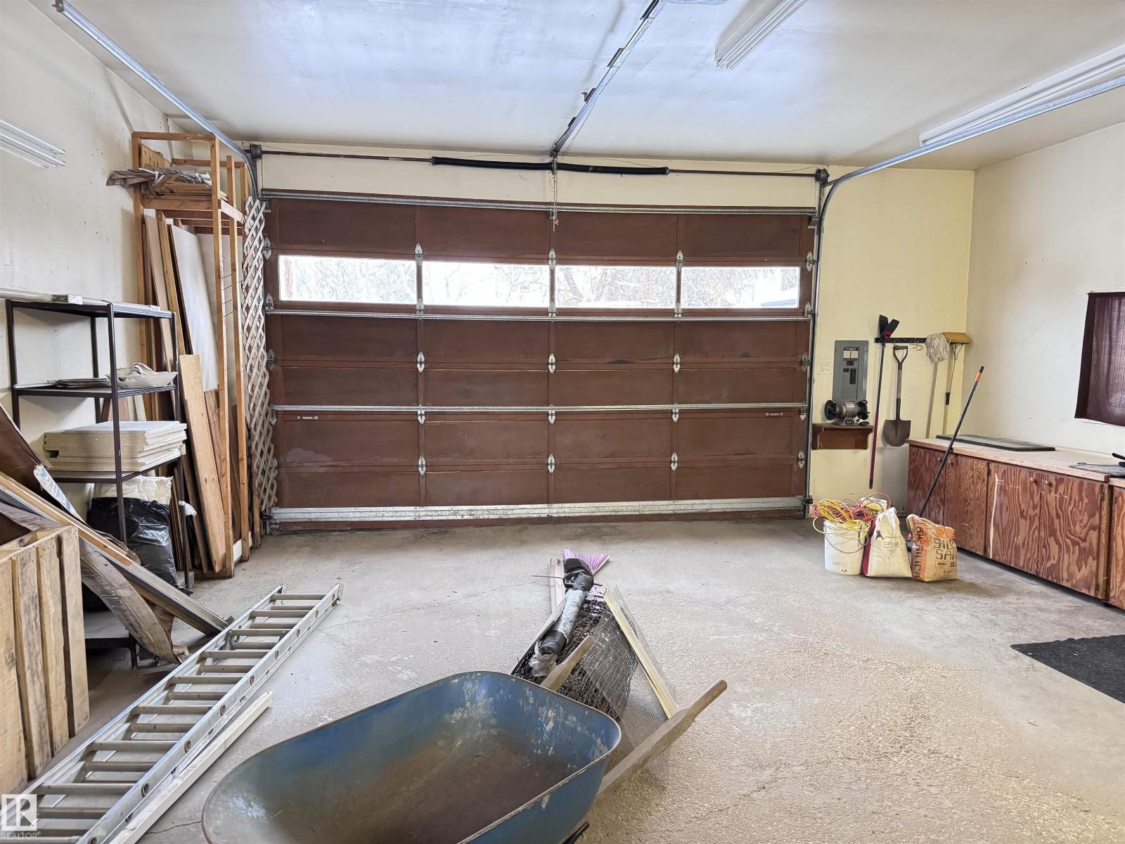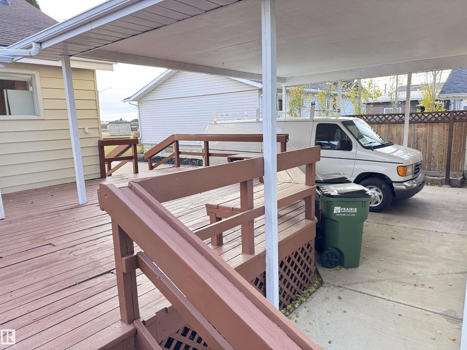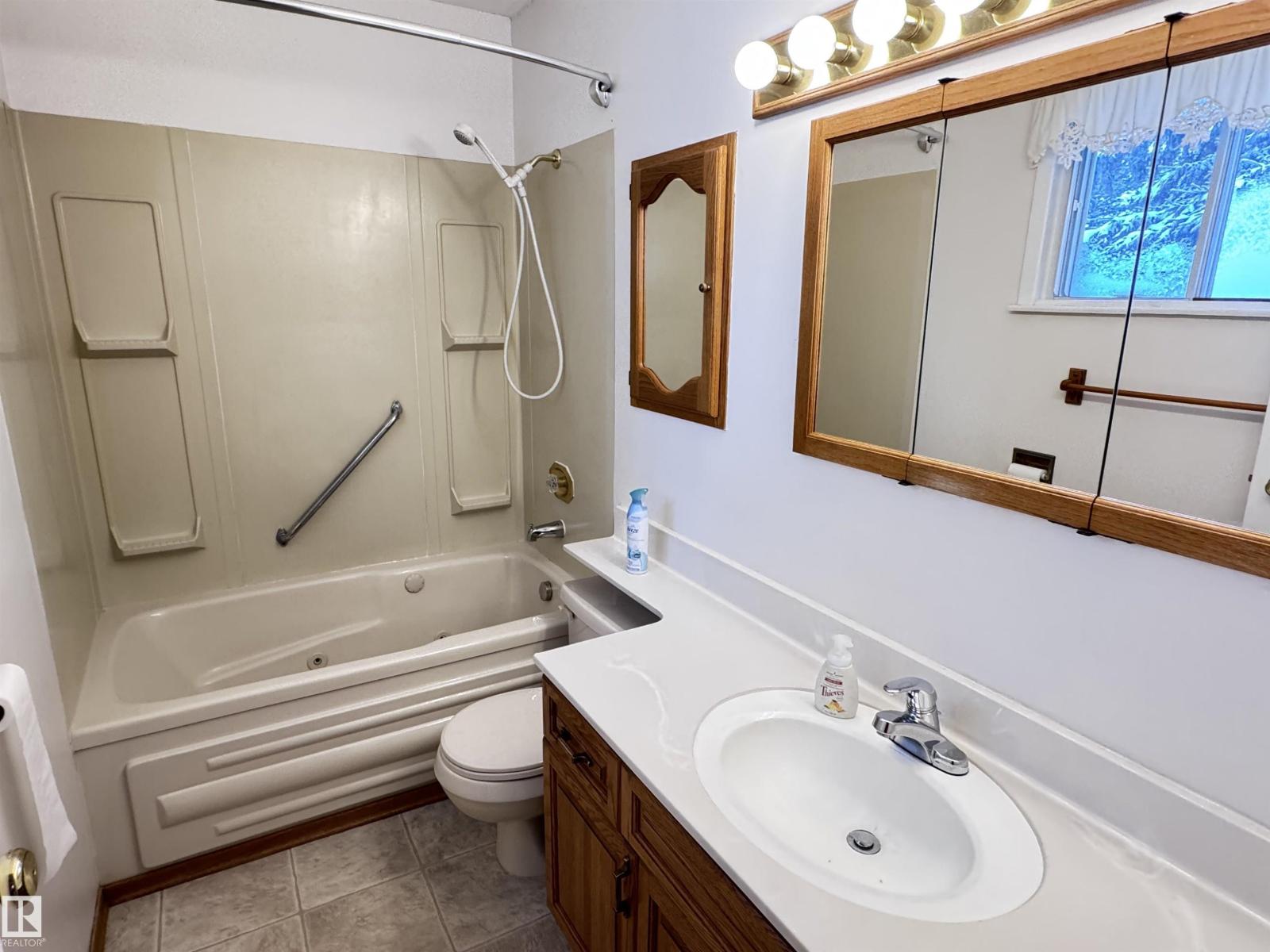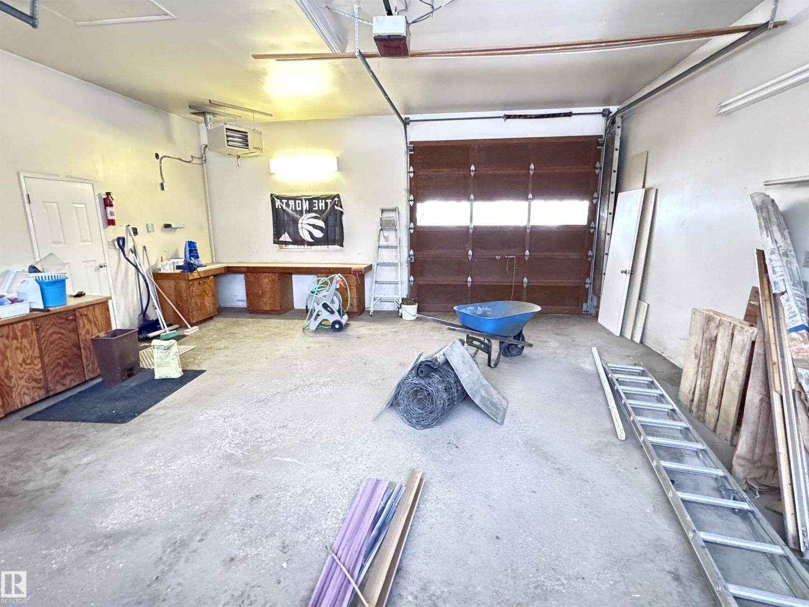 Tidy and full of character is this 900 sq.ft. bungalow in the fabulous Southview area of Westlock. Oak kitchen cabinets with sunshine box light & built-in microwave. Bright living room is right-sized & has a garden window. 2+2 bedrooms. Bright front den. Main floor laundry at rear entrance. Full bathroom is attractively appointed & has a jet-soaker tub. Basement features a 3-piece bathroom, rumpus room, 2 bedrooms & storage. Massive 26x24 heated, lined, 12' high wall, 10' high doors garage with carport on the front of it. Overhead doors on front and rear of garage (drive right through). Covered deck is large and will be repaired to ensure the next summer BBQ is enjoyable. Super-sized driveway in front, plus double parkpad at rear. 2 blocks to downtown core. 2 blocks to Westlock Rotary Spirit Centre (multi-plex sports facility). Close to schools, playground & grocery store. 2012 Hot Water Tank, Newer HE furnace. (id:63190)