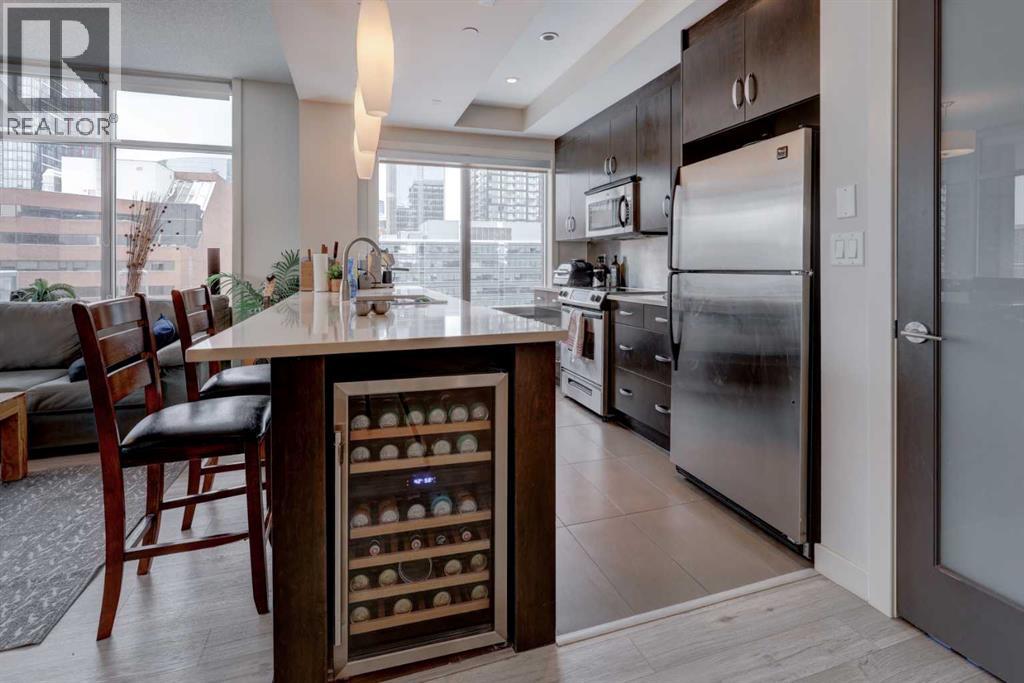 Welcome to this beautiful, modern 2 bedroom, 2 bathroom Premium Beltline condo featuring panoramic views to the north & west and titled parking stall and storage unit. Spanning 1,116 sqft, the sophisticated corner layout is framed by floor-to-ceiling windows capturing sweeping sunset, mountain and city skyline views. A huge, almost 300 sqft patio, is an entertainer’s dream, ideal for summer barbeques, morning coffee or evening cocktails under Calgary’s glowing skies. Inside we have a sleek open-floorplan with luxury vinyl plank and tile flooring throughout, quartz kitchen countertops, 9 ft ceilings, stainless steel appliances, a wine fridge and convenient office/study corner with built-in desk and cabinets. The kitchen overlooks the living area with spacious countertop and cabinet space, pantry and stainless steel appliances. The serene primary suite features a generous walk-in closet and spa-inspired ensuite with dual sinks, while the second bedroom offers ideal flexibility for guests, roommates or a home office with its own access to a full bathroom. In-suite laundry and central A/C are an added bonus. Castello is one of Calgary’s premier executive buildings, offering residents a fitness centre, guest suite, concierge services, car wash, bike rack area and pets are welcome (with restrictions). Perfectly located in the heart of the Beltline, you’re steps from 17th Ave and 4th Street restaurants, shops and vibrant nightlife. (id:63190)