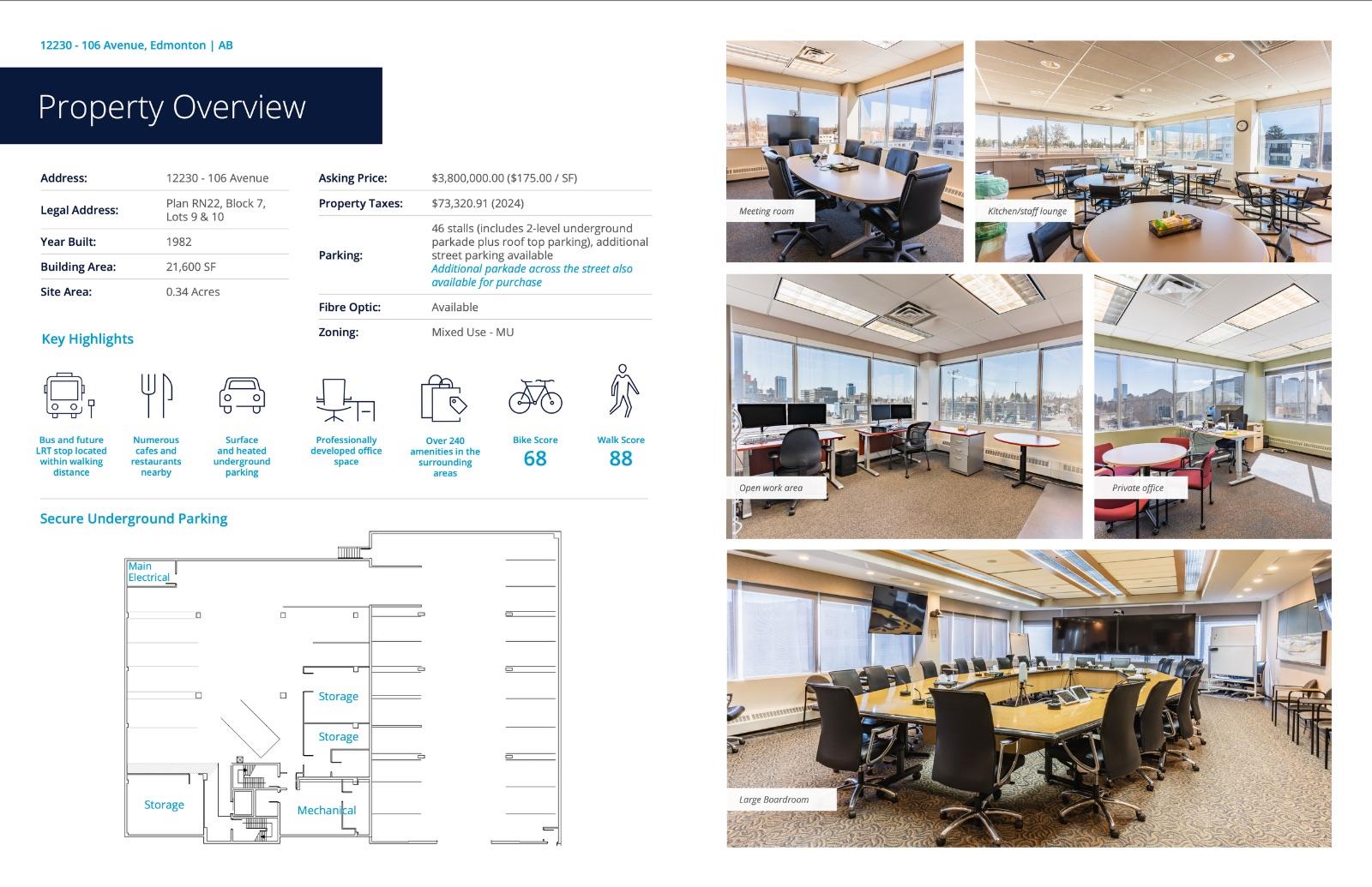 Visit the Listing Brokerage (and/or listing REALTOR®) website to obtain additional information. Opportunity to purchase a 21,600 square foot building near 124th Street and minutes away from downtown Edmonton. The AMA Building offers four floors of professional developed office space featuring multiple private offices, boardrooms, meeting rooms, and open work areas in addition to an underground heated parkade. The AMA Building is situated in the heart of the 124th Street district, just steps away from the iconic 124th Street, renowned for its eclectic mix of boutique shops, art galleries, restaurants, and more. Everything you need is within walking distance. Just one block away is Manchester Square, a unique retail redevelopment that brings European architecture and atmosphere to the area. It is home to 19 locally owned shops and businesses. The trendy Brewery District is also nearby, offering a variety of cafés, restaurants, grocery stores, fitness centers, personal services, and more.Other Property Types: OfficeSubject Space Width: 78Ownership Interest: PrivateSite Services: Fiber Optics,See RemarksSite Influences: Shopping Nearby,Public Transportation,See Remarks,View DowntownTitle to Land: Fee SimpleRPR Survey Available: NoSeller Rights: YesAppointment Name: Courtney WealeAppointment Phone: 780-917-4156Paragon Listing ID: E4460523 (id:63190)