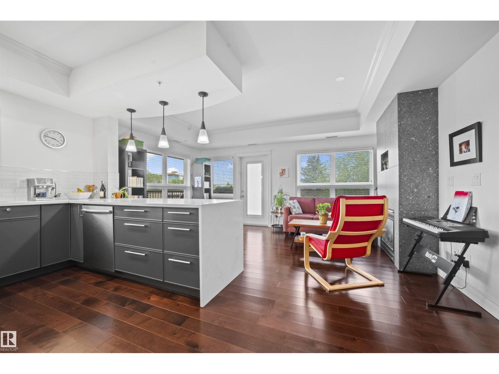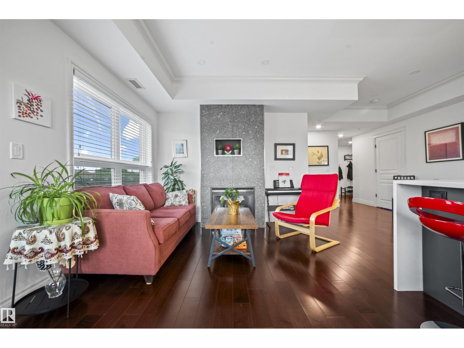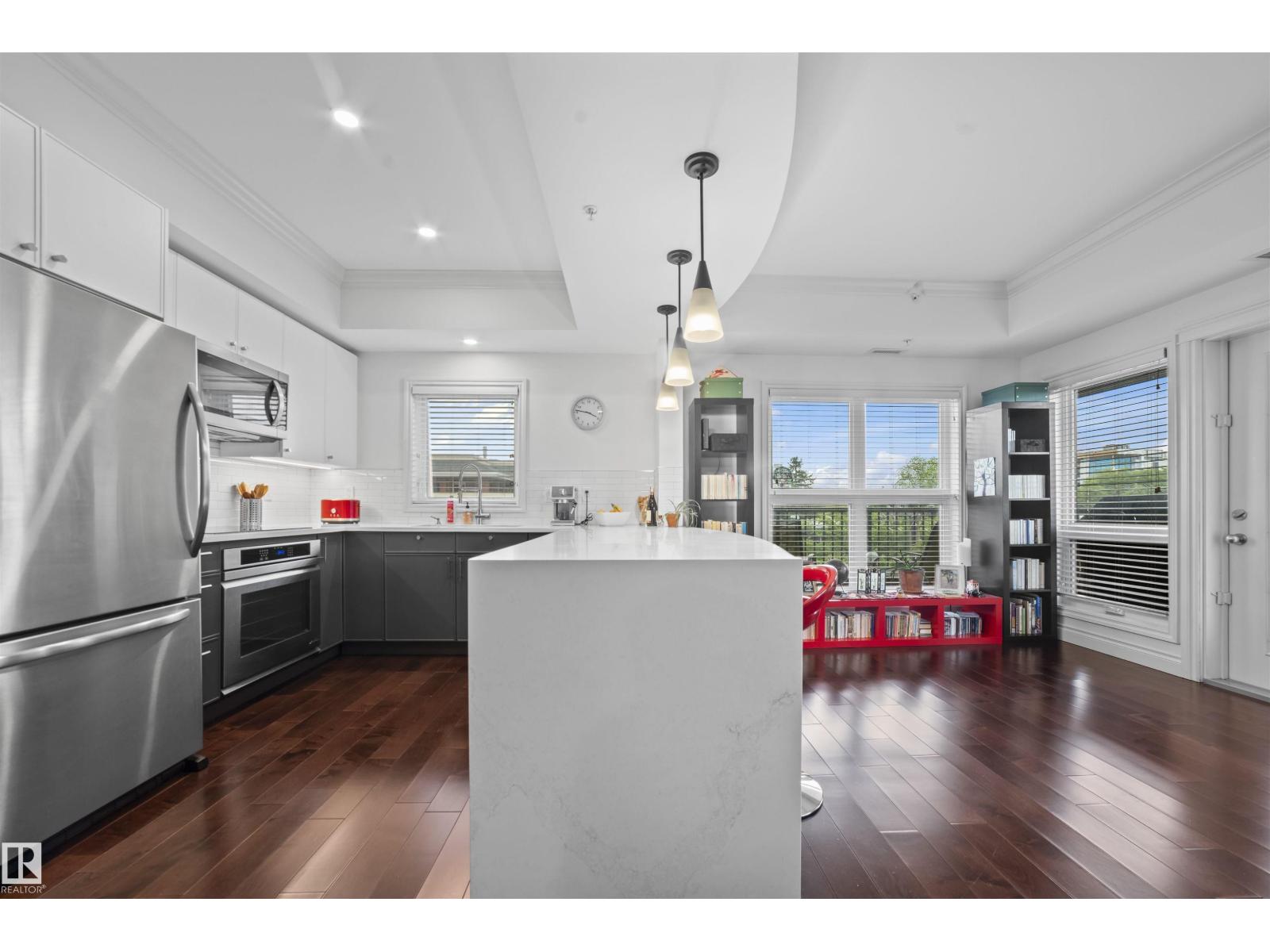 Live in the heart of the city in this modern and stylish 2-bedroom, 2-bath condo located on the top floor of a secure, elevator-equipped building. Enjoy open-concept living with oversized windows that fill the space with natural light. The contemporary kitchen features custom soft- close high end cabinets, stainless steel appliances, quartz counter tops, Dacor induction cooktop and a large island perfect for entertaining. The spacious living room has a custom gas fireplace for ambiance or cosy evenings. The dining area opens to a private wrap around balcony with gas hookup for BBQ and ideal for morning coffee or evening sunsets. The large primary bedroom boasts a walk-in closet and en-suite bathroom with a glass-enclosed shower. The second bedroom has a full en-suite that provides flexible space for guests or a home office. One parking spot in the heated underground parkade with a large adjacent enclosed storage unit complete this executive Oliver condominium. (id:63190)