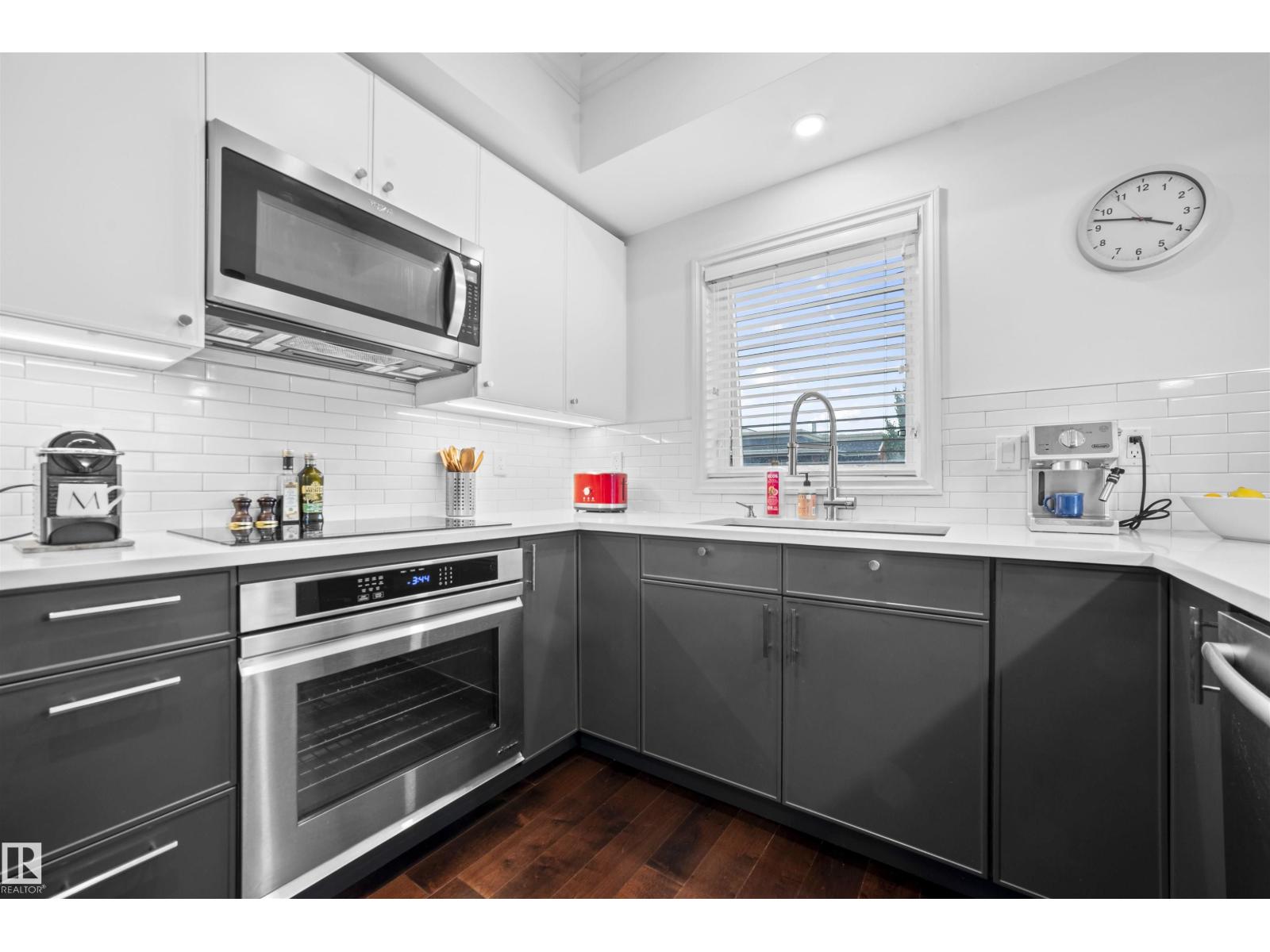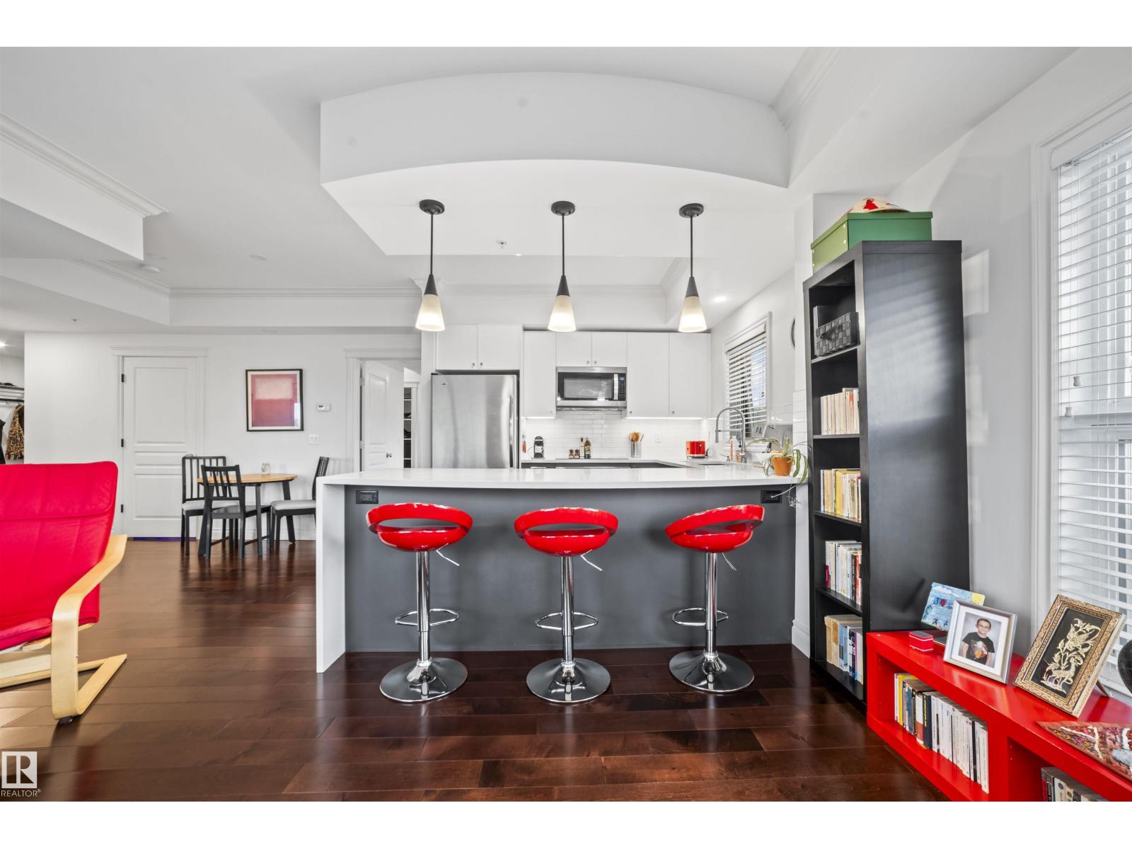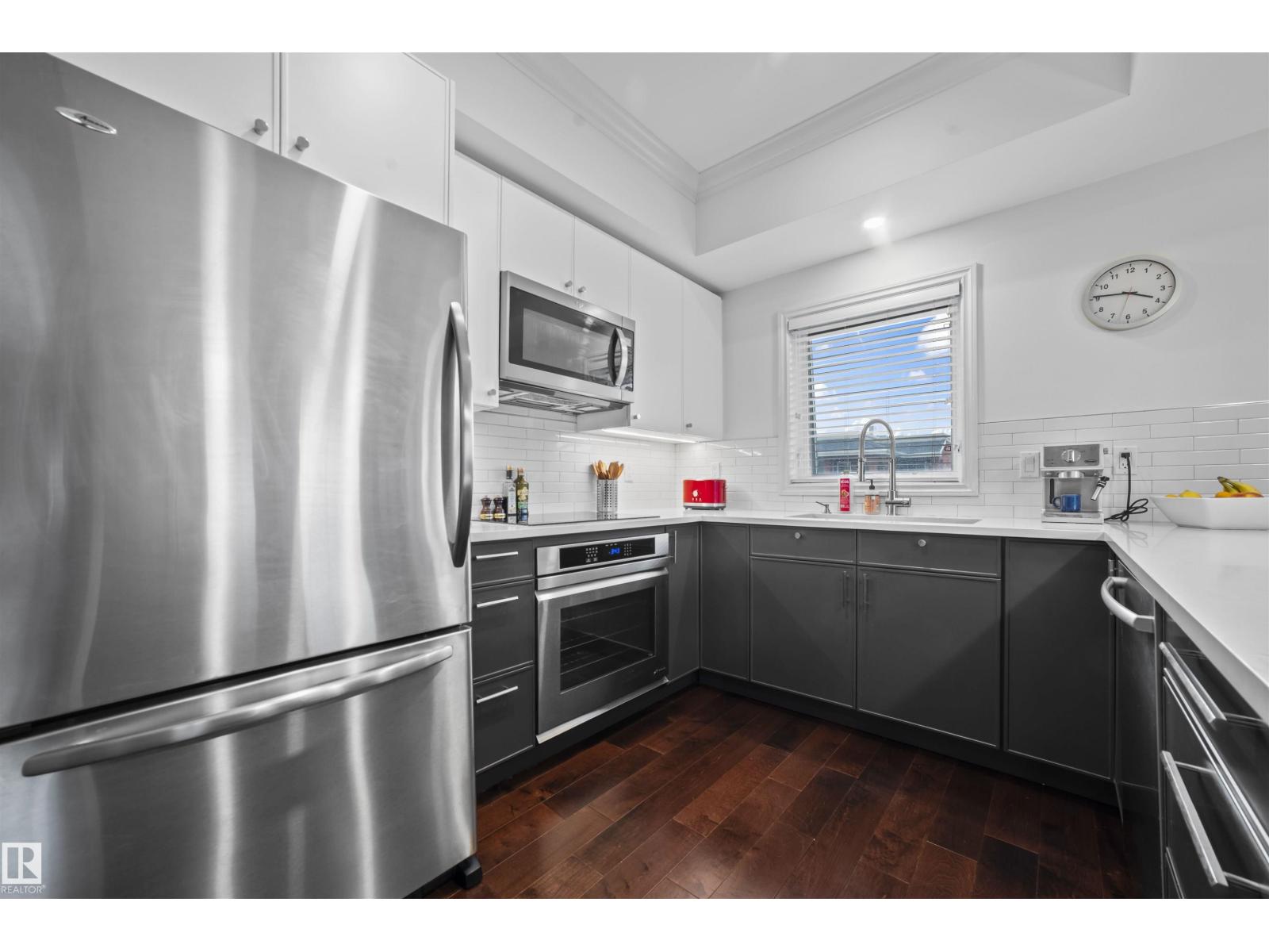 Live in the heart of the city in this modern and stylish 2-bedroom, 2-bath condo located on the top floor of a secure, elevator-equipped building. Enjoy open-concept living with oversized windows that fill the space with natural light. The contemporary kitchen features custom soft- close high end cabinets, stainless steel appliances, quartz counter tops, Dacor induction cooktop and a large island perfect for entertaining. The spacious living room has a custom gas fireplace for ambiance or cosy evenings. The dining area opens to a private wrap around balcony with gas hookup for BBQ and ideal for morning coffee or evening sunsets. The large primary bedroom boasts a walk-in closet and en-suite bathroom with a glass-enclosed shower. The second bedroom has a full en-suite that provides flexible space for guests or a home office. One parking spot in the heated underground parkade with a large adjacent enclosed storage unit complete this executive Oliver condominium. (id:63190)