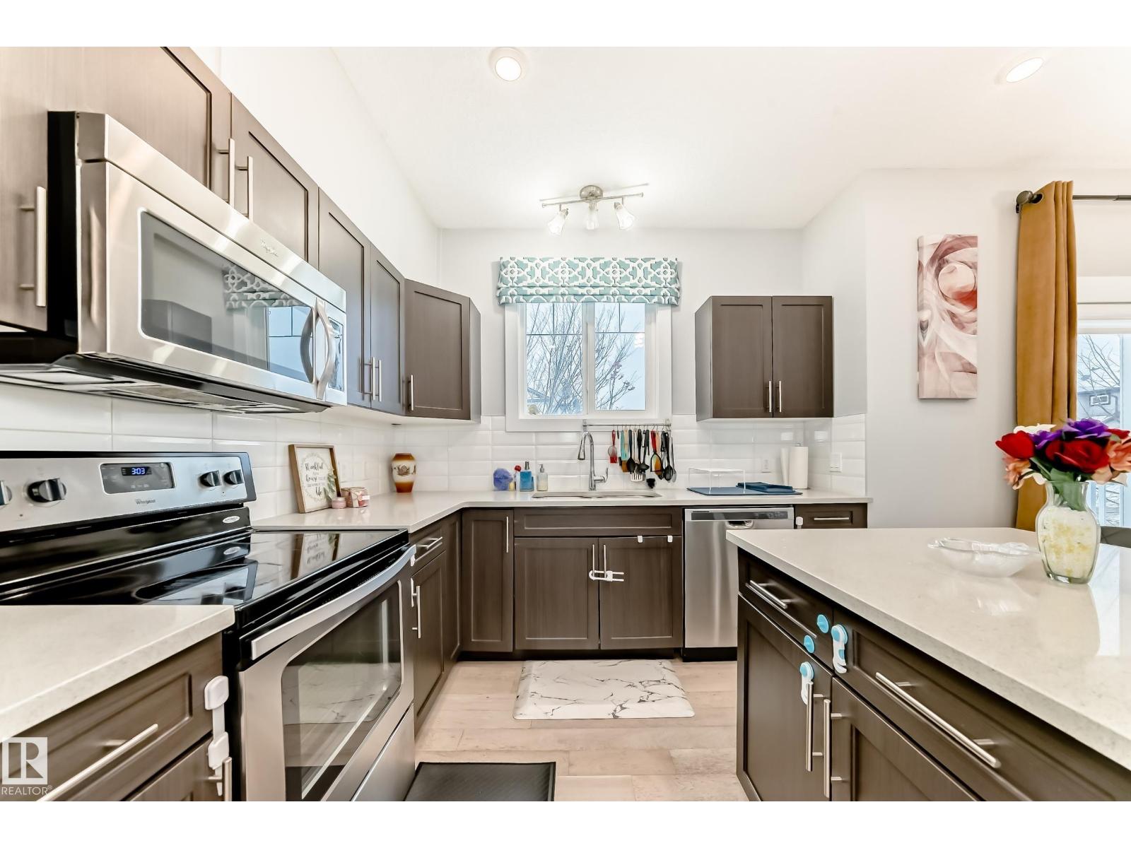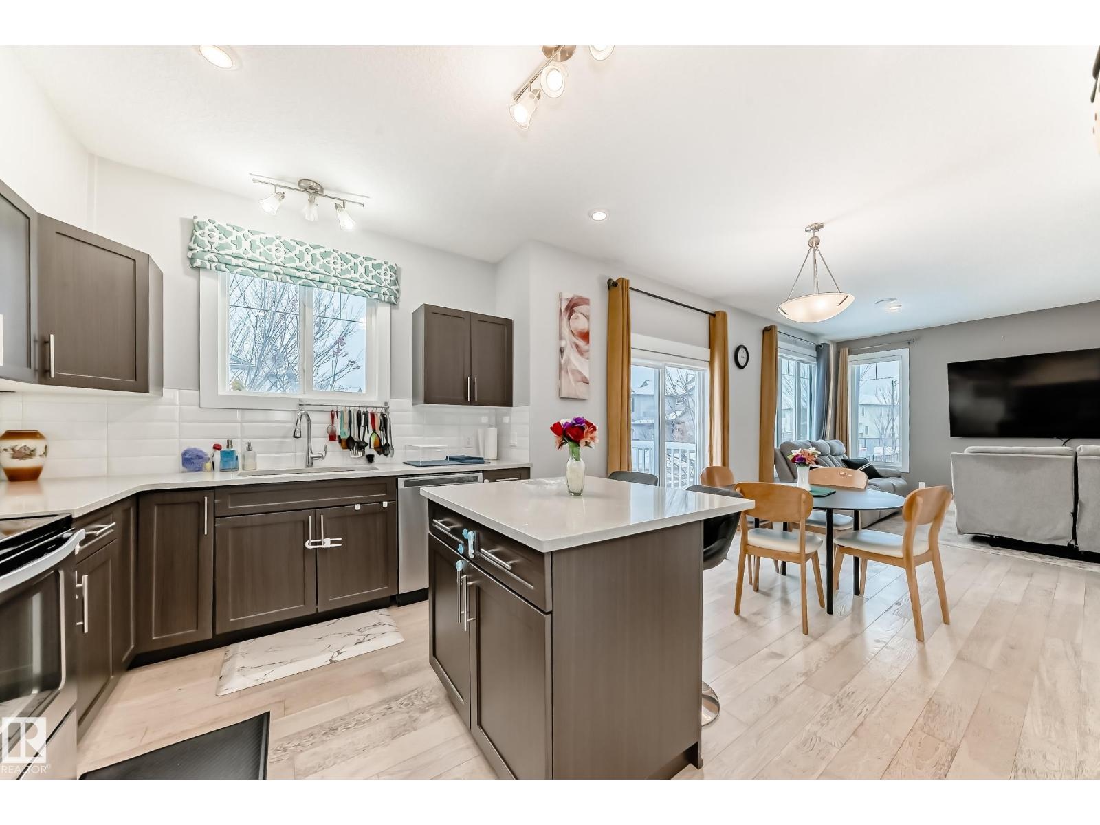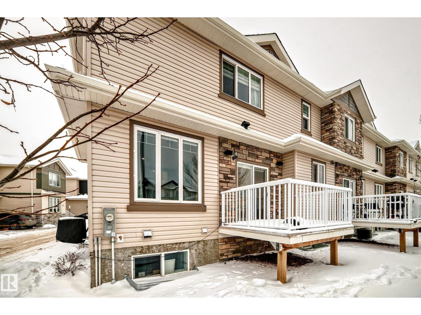 Former showhome END UNIT with a FULLY FINISHED BASEMENT, central air conditioning, and a heated double attached garage, ideally located in Windermere! This upgraded home features an open-to-above foyer and a bright open-concept main floor with engineered hardwood, quartz countertops, stainless steel appliances, a large island with breakfast bar, a walk-in pantry, and built-in speakers that make entertaining so much easier! The dining area opens to the rear deck with beautiful sunset and pond views. Upstairs offers three spacious bedrooms, including a primary suite with a walk-in closet and a five-piece ensuite washroom. The finished basement adds an extra living space. It comes with a family room and another three-piece bathroom, perfect for guests, or extended family. Close to river valley trails, shopping, restaurants, schools, transit, and minutes to Anthony Henday and Whitemud. (id:63190)