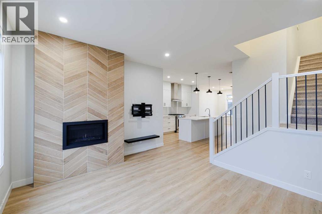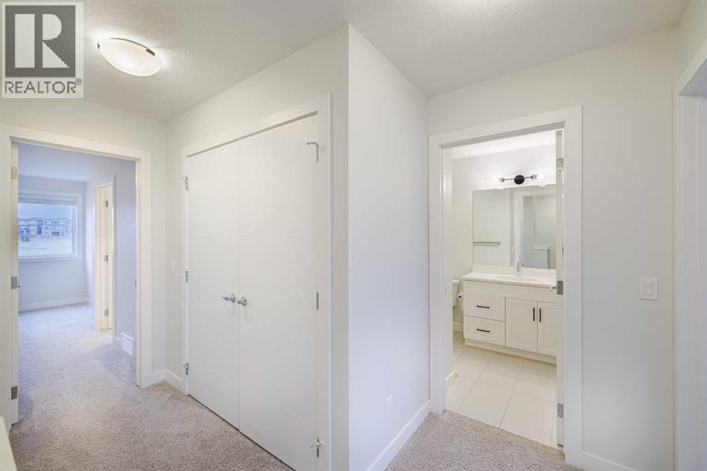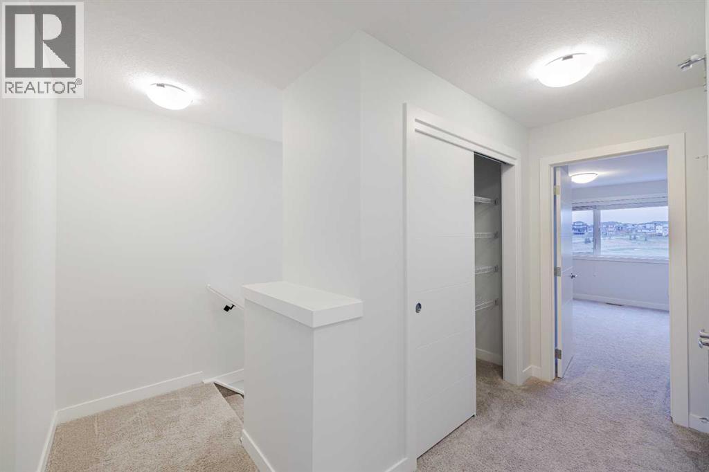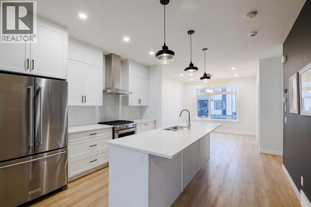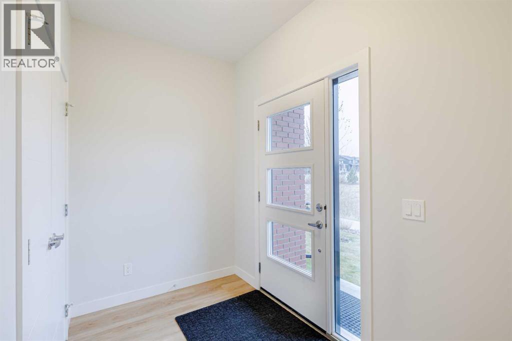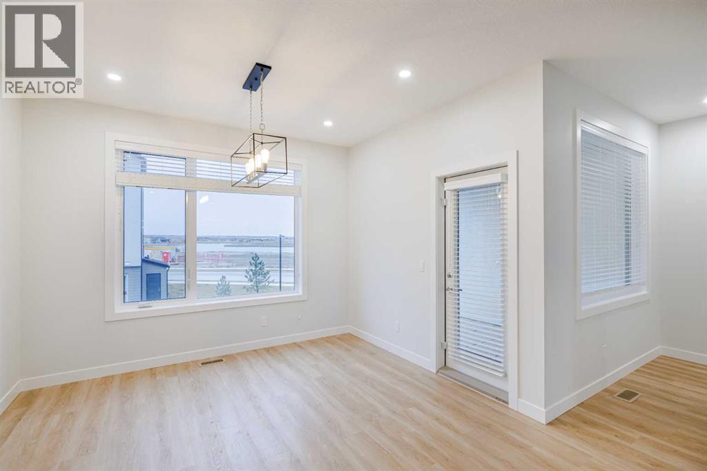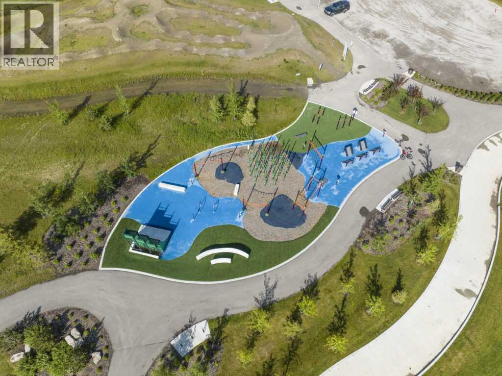 Welcome to this exquisite townhome that epitomizes the perfect blend of luxury, functionality, and natural beauty. Nestled in Harmony—an award-winning community that has proudly earned “Community of the Year – Calgary Region” eight times—this residence stands out with a plethora of upgrades, meticulous maintenance, and thoughtful design. Harmony offers an unmatched lifestyle, combining lake and golf living, walkable amenities, and stunning mountain views. As a resident, you’ll enjoy social membership at the renowned Mickelson National Golf Club, giving you access to world-class golfing right in your backyard. Families will appreciate the proximity to sought-after schools including Springbank Middle School, Springbank Community High School, and the prestigious Edge School for athletes and academics. As you step inside, you are greeted by a spacious den off the front entrance, just steps from the oversized double-car garage featuring a forward-thinking 40-amp EV connection, a true testament to modern living. Ascending to the main level, the kitchen immediately captivates with its elegant finishes—quartz countertops, a large island with breakfast bar seating, ceiling-height white cabinetry, and upgraded stainless steel appliances including a gas range for the culinary enthusiast. A massive pantry with extensive shelving ensures optimal organization. Adjacent to the kitchen is a charming eating nook with access to the front deck, where you can enjoy peaceful lake views. The sunlit living room offers a bright and inviting atmosphere, with panoramic mountain vistas framed by large windows, and a stylish fireplace with custom tile surround adding warmth and sophistication. The upper level showcases the primary suite, complete with a custom California Closet system and a spa-like ensuite featuring in-floor heating, a private water closet, standalone shower, and dual vanity. An upgraded laundry area with quartz countertop, additional shelving, and a large linen closet adds c onvenience. Two additional generously sized bedrooms and a 4-piece bathroom complete this floor. Outside of the home, Harmony’s amenities enrich everyday living—a 5-minute drive to Calaway Park, and the upcoming Bingham Crossing development with a future Costco and numerous shops and services. Residents also enjoy walking access to the community lake, miles of pathways, and future commercial amenities including the Nordic Spa.This townhome goes beyond ordinary, delivering a lock-and-leave lifestyle with maintenance-free living—no snow shoveling or yard work required—and four parking spots between the garage and driveway. With air conditioning, thoughtful upgrades, breathtaking surroundings, and pride of ownership throughout, this home offers not just a residence, but a lifestyle of elegance and harmony. (id:63190)