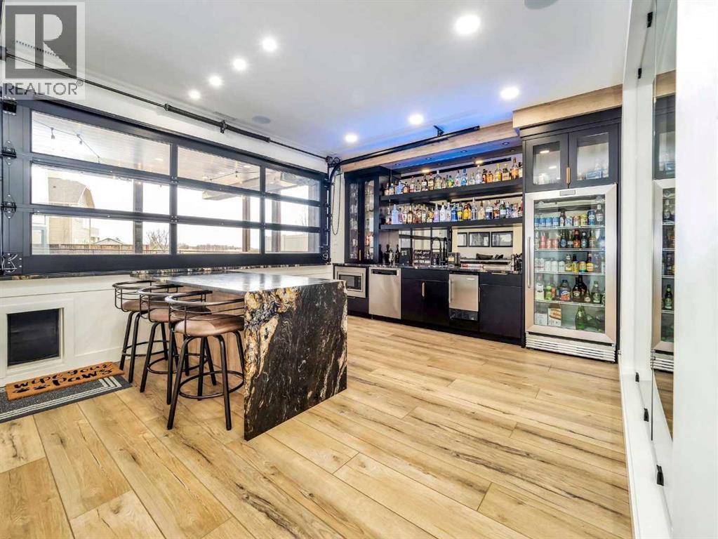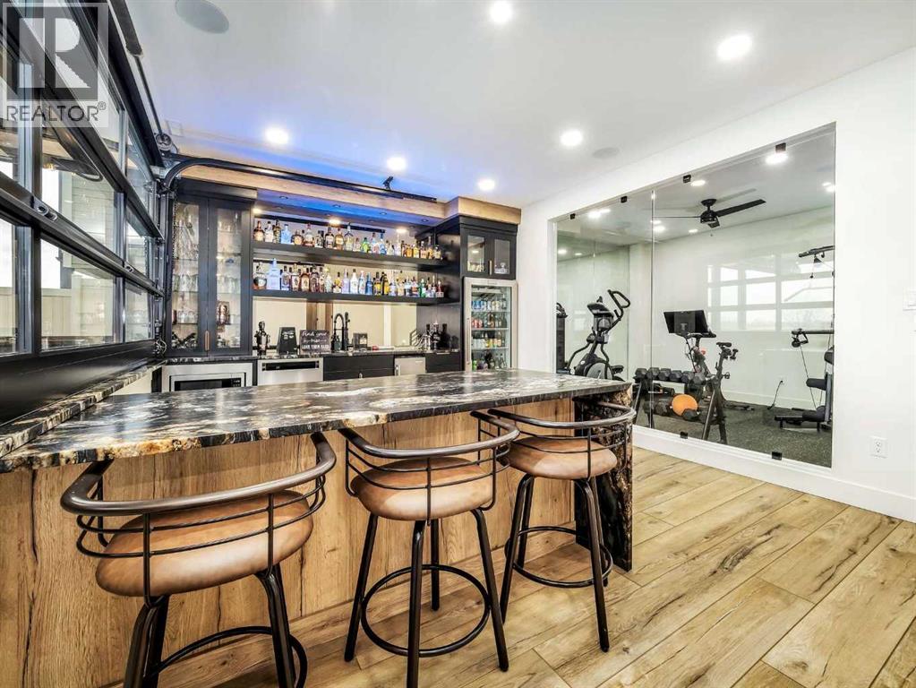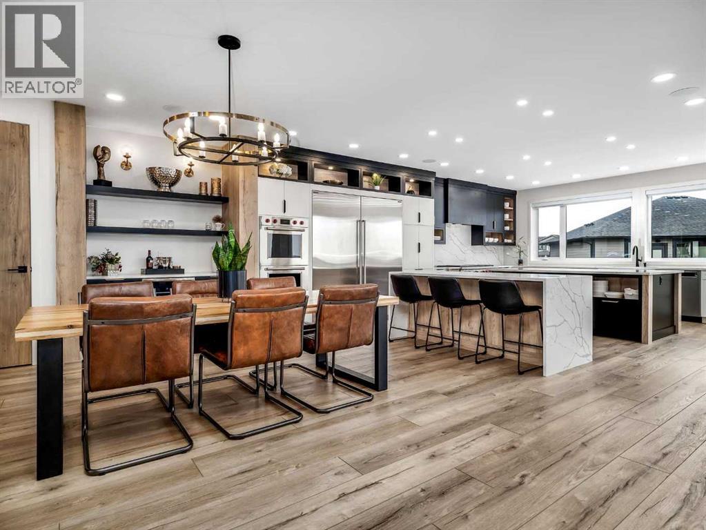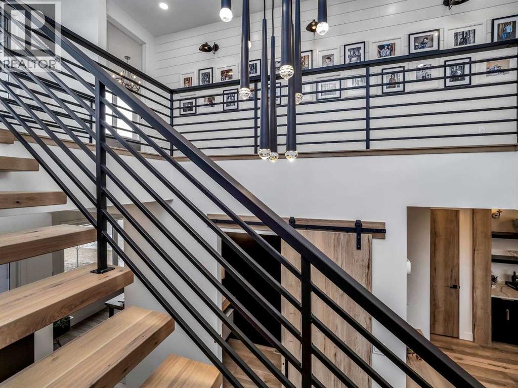 A rare opportunity to own the builder’s personal residence in one of Lethbridge’s most prestigious locations—Stonecrest Point, perched on the coulee’s edge in Riverstone. Every detail has been meticulously designed, resulting in nearly 5,000 sq. ft. of fully developed luxury with breathtaking coulee views, striking curb appeal, and extensive upgrades throughout. Inside, soaring 21’ ceilings, a dramatic floating solid-oak staircase with curved architectural detailing, and black powder-coated railings create a stunning first impression. Nine-foot ceilings span all three levels, complemented by 9” luxury vinyl plank flooring. The sunken living room features a beautiful two-sided gas fireplace with decorative hearth. The chef’s kitchen offers double islands, ceiling-height custom cabinetry, extensive drawer storage, appliance garage, integrated recycling, spice racks, and a large walk-in pantry. Premium Wolf and Sub-Zero appliances include a 48” gas cooktop with griddle, custom hood fan, double wall ovens, drawer microwave, and a side-by-side Sub-Zero fridge/freezer with water and ice. Two dishwashers on the main floor (plus a third in the basement bar), garburator, and thoughtful storage complete the space. An 8’ sliding glass door opens to a 14’ x 18’ concrete deck with frameless glass railing and built-in Napoleon BBQ, offering unobstructed coulee views. The main-floor office features 10’6” ceilings, built-in desks, ceiling beam detailing, and walk-in storage closet. A spacious mudroom provides custom built-ins, bench seating, shelving, and additional storage. The oversized heated garage includes a 27’ x 34’ main bay plus a workshop, epoxy floors, commercial overhead door, side-mount opener, hot and cold taps, floor drain, sink, and custom dog wash. The fully developed basement is an entertainer’s dream, showcasing a custom bar, ice maker, commercial bar fridge, and microwave. A commercial overhead pass-through door opens to an enclosed patio with electric screen, ra diant heat, gas fire table, and Hot Springs hot tub for year-round enjoyment. This level also offers a bedroom with walk-in closet, a full bathroom with custom tile shower, a large living area, and a private glass-walled gym. Upstairs, a bonus room with floor-to-ceiling windows captures incredible coulee views. Bedrooms feature walk-in closets, blackout blinds, and built-in bed bases. Two bedrooms share a Jack and Jill bathroom with frameless glass shower. The primary retreat is exceptional, offering continued views and a spa-inspired ensuite with a massive custom tile shower with dual showerheads, makeup vanity, water closet, and a walk-through closet connecting to the laundry room. The laundry room includes pull-down drying racks, steam dryer, sink, and generous counter space. The exterior is equally impressive with composite siding, synthetic turf, drip irrigation, raised garden beds, stamped concrete driveway, and so much more. A statement home in an iconic location - luxury living without compromise. (id:63190)