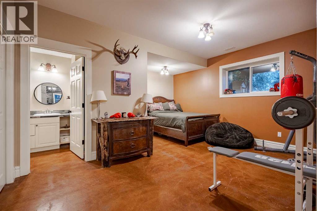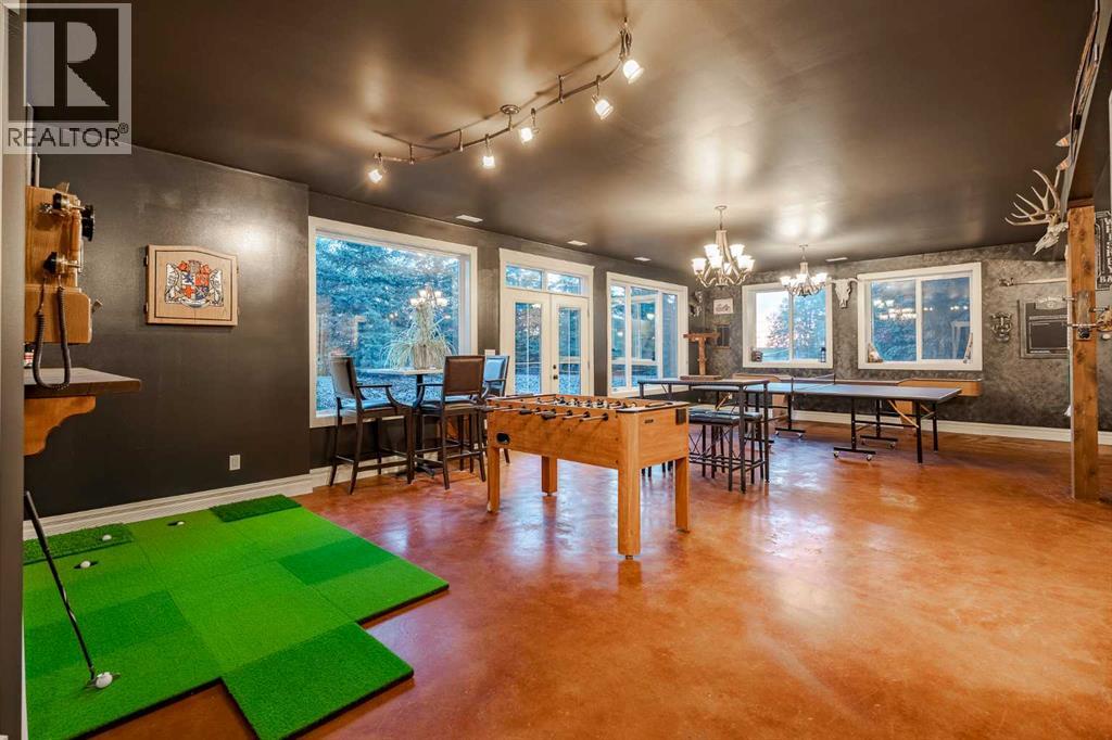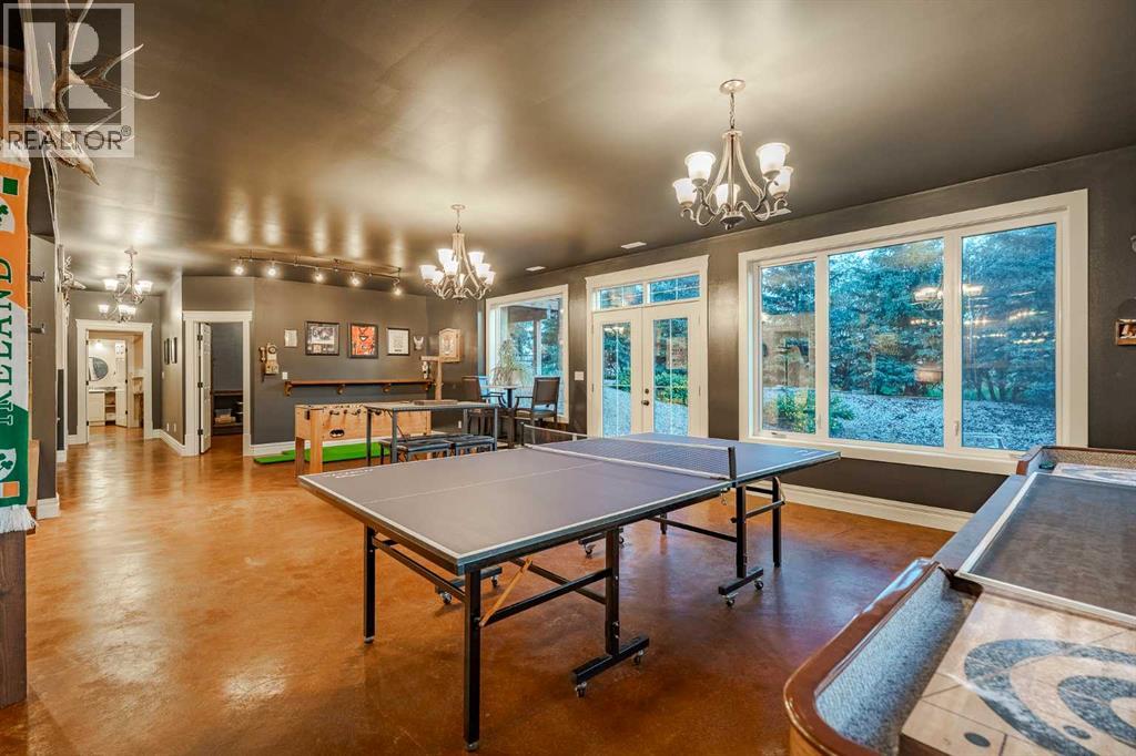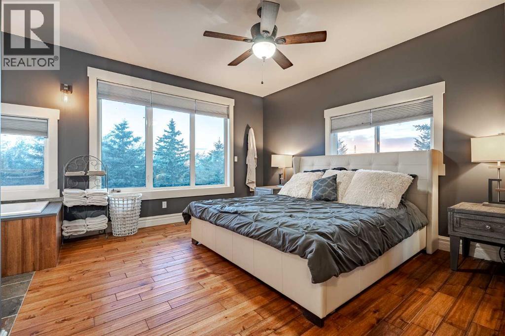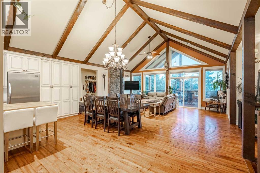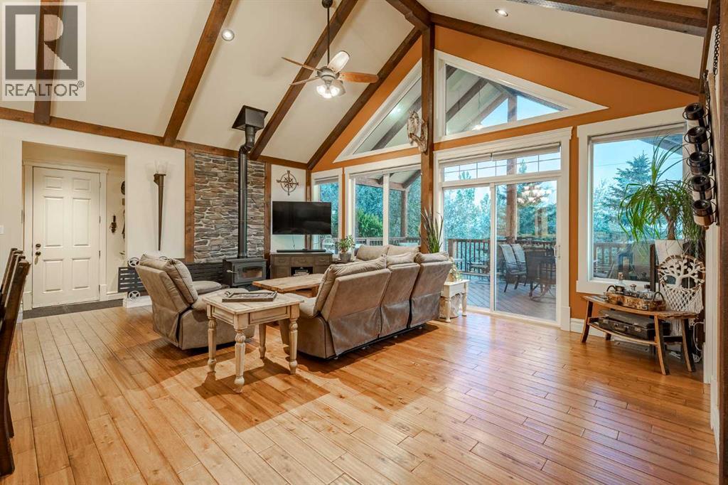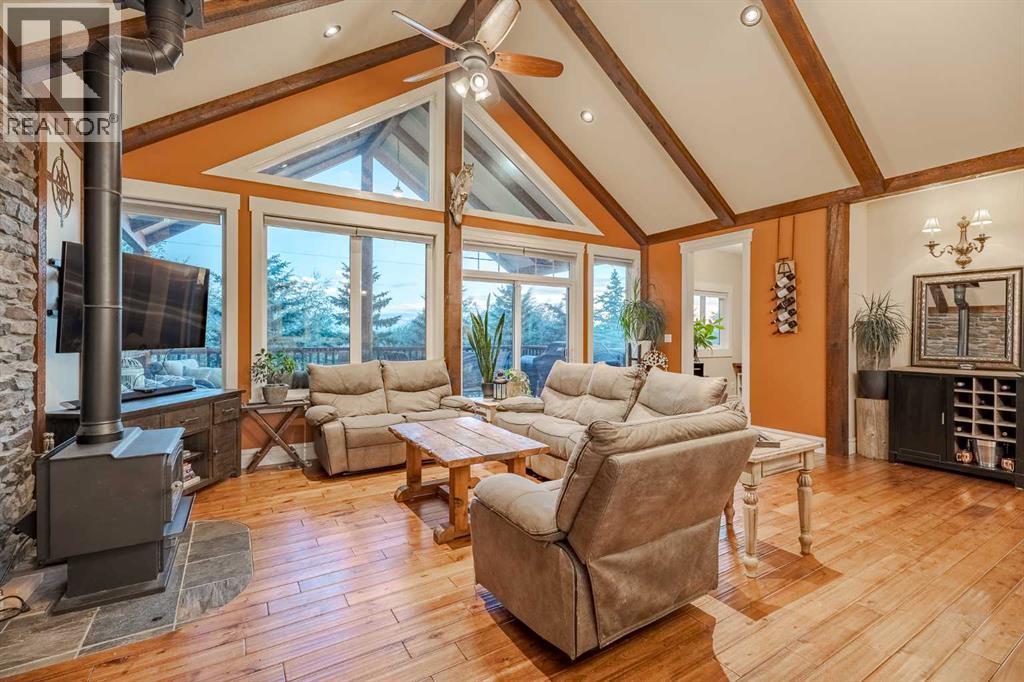 Welcome to this extraordinary walkout bungalow offering over 4,000 sq ft of thoughtfully designed living space with 6 bedrooms, 5 bathrooms, a heated oversized quad garage, a massive 40’ x 60’ insulated shop, and nearly 20 acres of endless possibility just minutes from Calgary. From the moment you arrive, the striking A-frame architecture stretches from the front elevation all the way to the covered back porch, perfectly framing panoramic mountain views. Step into the grand main level, where soaring vaulted ceilings with exposed beams and expansive west-facing windows fill the space with natural light and unforgettable views. The gourmet kitchen features upgraded cabinetry, a large center island, granite countertops, and premium stainless appliances designed for effortless entertaining. The spacious dining area easily accommodates large gatherings, while the open-concept living room is anchored by a cozy gas fireplace.Just down the hall, the generous primary retreat offers an open 4-piece ensuite and a spacious walk-in closet. Two additional bedrooms provide comfortable spaces for family or guests and share access to a well-appointed main bathroom. A versatile office or den is tucked away near the front entry. Downstairs, the walkout basement extends the living space with a massive recreation room, wet bar, three additional bedrooms, and two full bathrooms, including one ensuite – perfect for multi-generational living or hosting guests.Outside, the property continues to impress with an attached heated oversized quad garage and a 40’ x 60’ powered shop ready for your next project, hobby, or home-based business. The multiple livestock areas are thoughtfully arranged and include 3 automatic waterers to support a wide range of agricultural uses. Whether you're envisioning a private rural retreat, a hobby farm, or a future development opportunity, this nearly 20-acre parcel offers it all – and with potential for subdivision pending municipal approval, the possibiliti es are truly endless.All this just 10 minutes to Stoney Trail and 15 minutes to shopping, dining, and amenities in Seton and Mahogany. This is more than a home – it’s your gateway to rural luxury, convenience, and future opportunity. Don’t miss your chance to experience it. (id:63190)