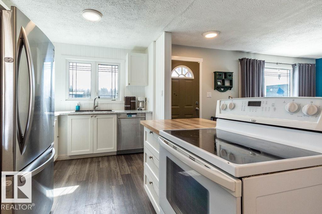 Here we have a bright open concept 4 bedroom family home with double carport. The kitchen and dining area are open with bright white cupboards. The living room has a large window which lets a lot of natural light in. Also upstairs, there's the primary bedroom, 2 more bedrooms and the main 4pc bathroom with a jetted tub. Downstairs there's another bedroom, laundry, rec room, storage room and a 3pc bathroom. As you go outside, you have a front south facing deck to enjoy the sun and your morning coffee on. The attached carport has a cement pad, there's RV parking, a privacy fenced back yard and a large firepit area. This charming home is conveniently located right in Evansburg, across from the school, close to parks, shopping, and just minutes from the Pembina River Provincial Park. (id:63190)