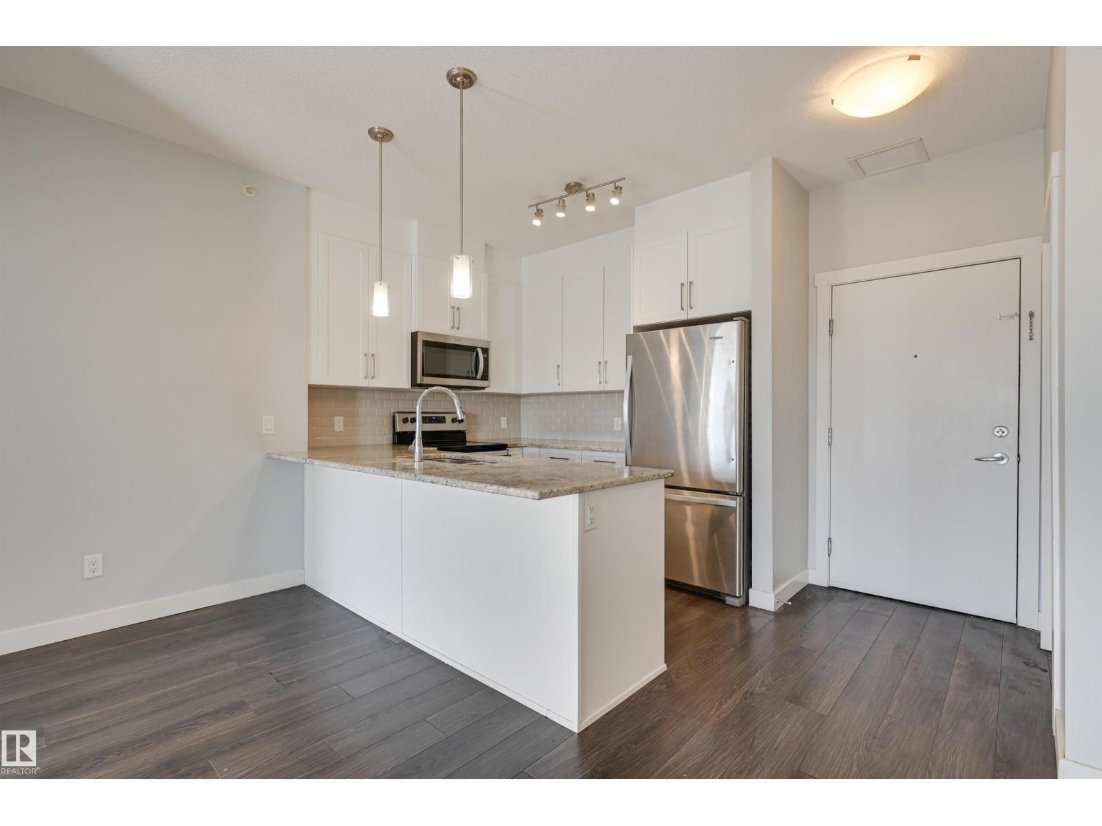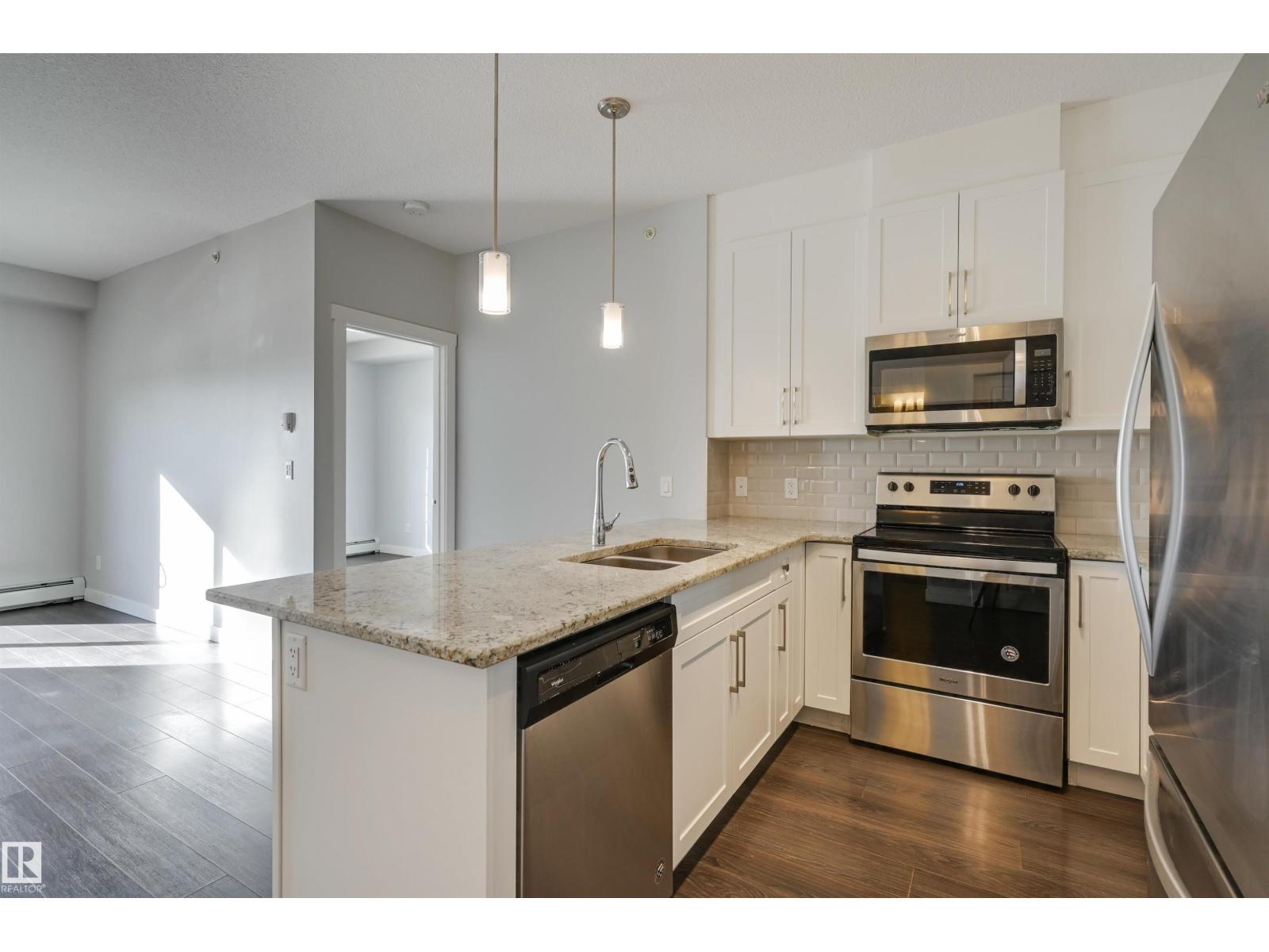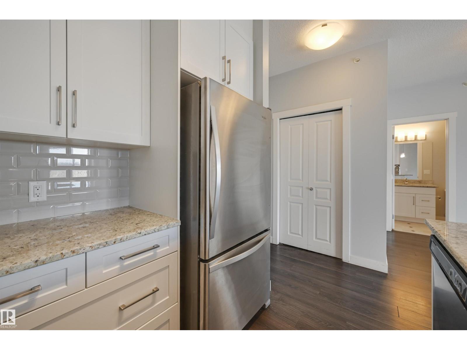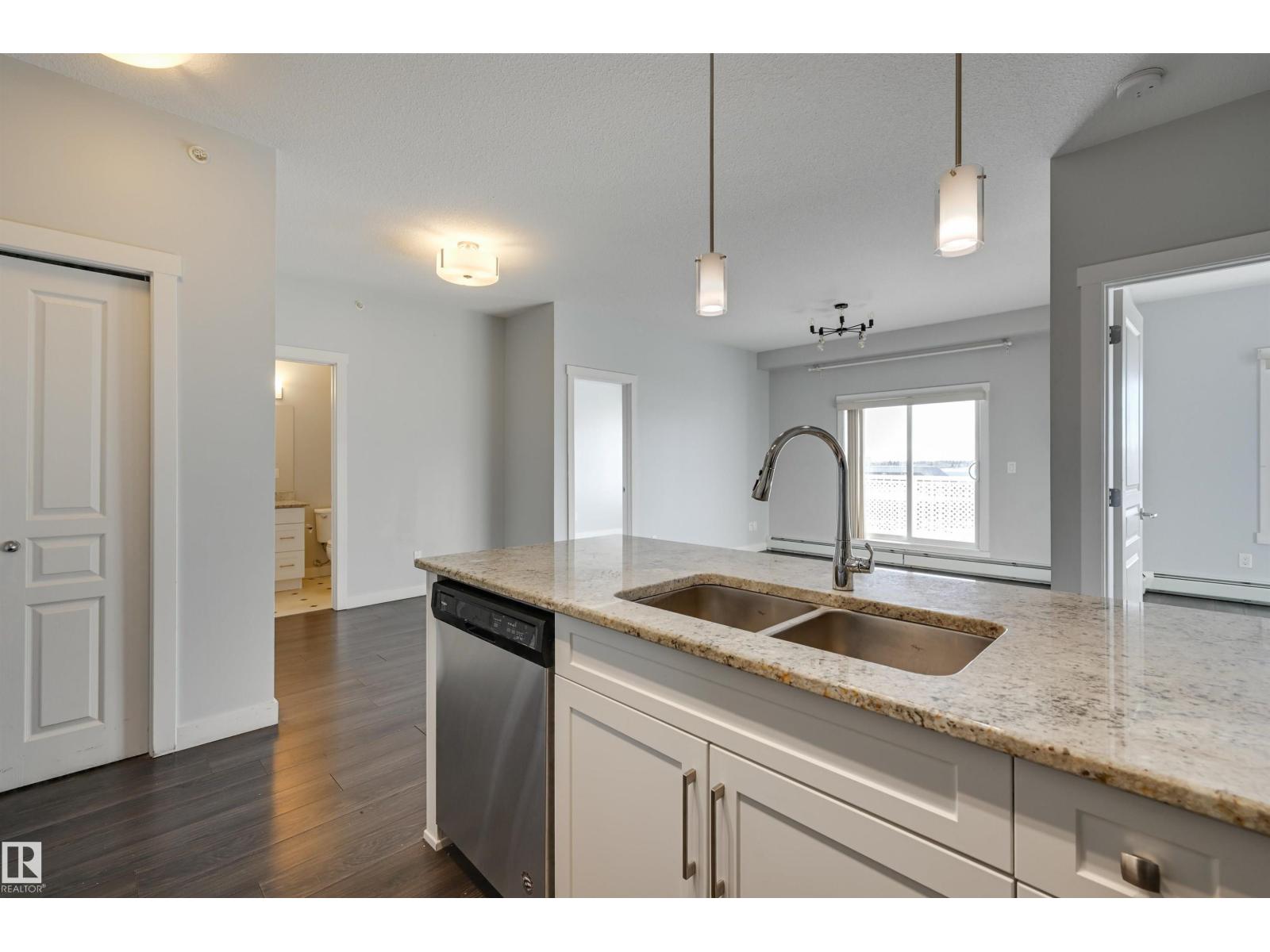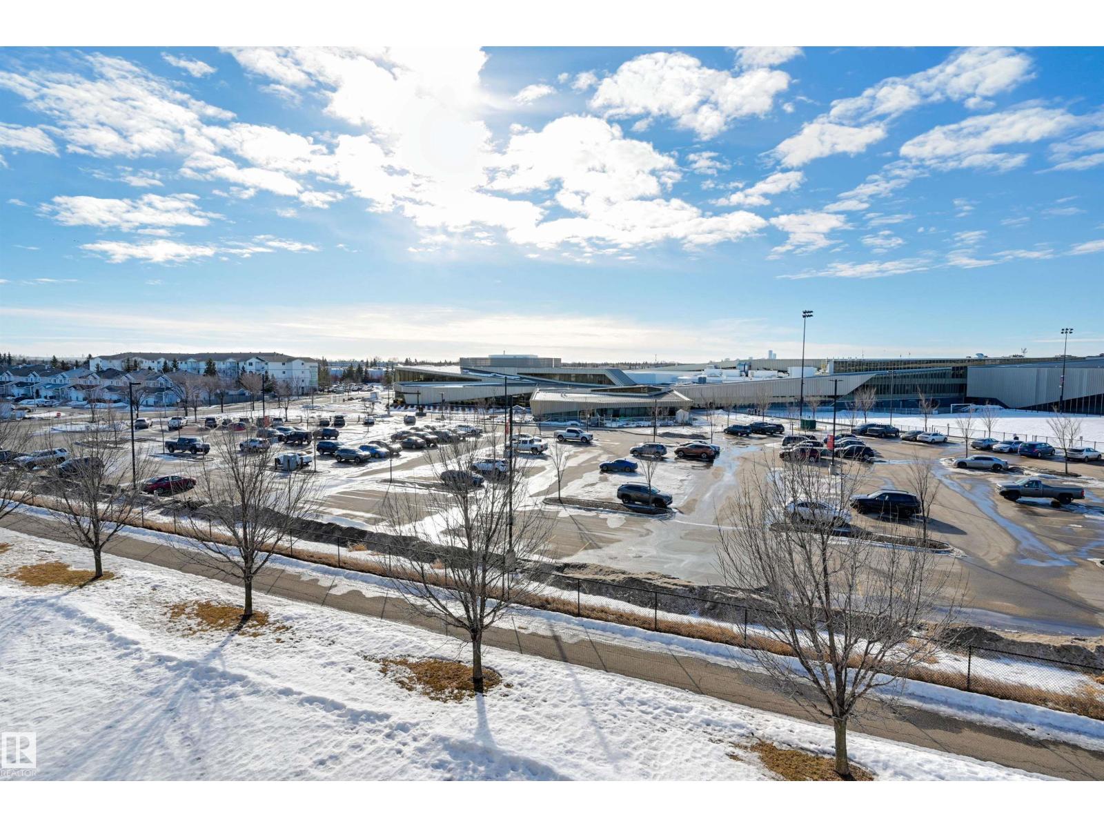 TOP FLOOR + TWO PARKING STALLS + PRIVATE SOUTHWEST VIEW! This modern 2 bedroom 2 bathroom condo has it all in a perfect location close to everything! Bright and open with good sized rooms and separation with bedrooms on either side of the suite. Granite counters throughout & extra high 9' ceilings. A great kitchen fully loaded with white cabinets, granite countertops, stainless steel appliances, tile backsplash, and a breakfast bar island. Dedicated dining space and a sun filled living room looking over the rec center grounds. The primary has dedicated ensuite and a walk through closet. Second bedroom with a full bathroom right out the door and a laundry room with lots of storage space complete the condo. Included are TWO titled parking stalls (one surface one underground). The very reasonable condo fee of $539.95/mth includes ALL UTILITIES heat/water/power! Unbelievable location right next to the Rec Center, Library, LRT Station, & every store you could ask for including Costco, WalMart, and Superstore! (id:63190)
