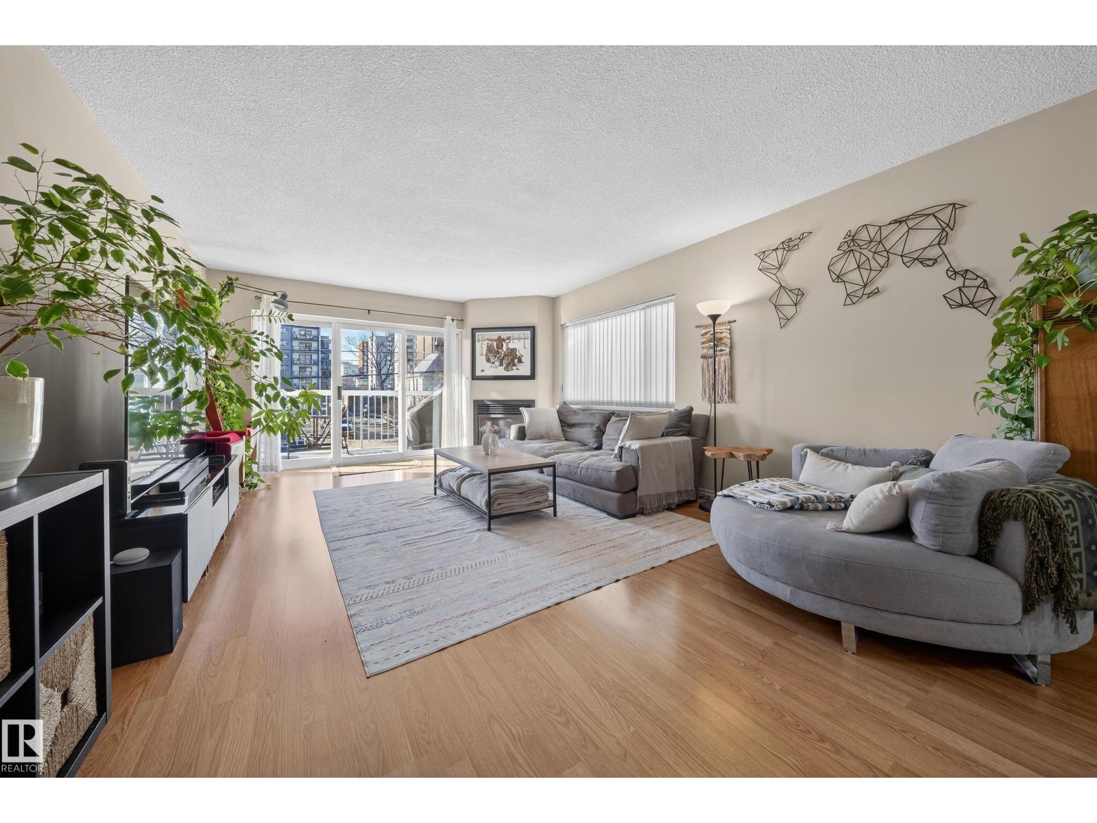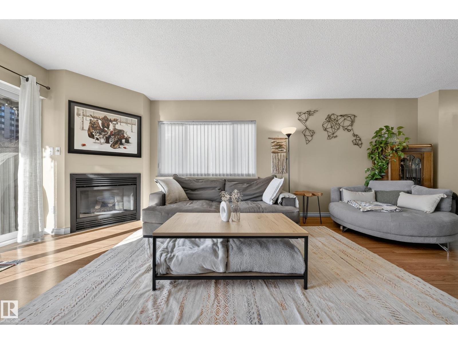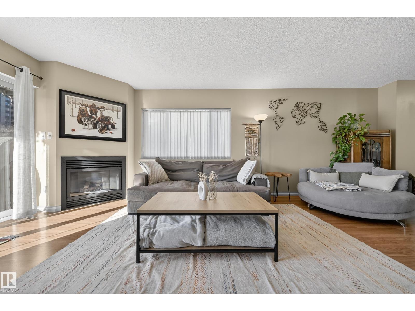 Wake up, grab a coffee, and step into a downtown lifestyle where work, restaurants, and late nights out are all part of your daily rhythm. Offering 1174 SF of comfortable living space, this 2 bedroom, 2 bath condo delivers room to breathe without giving up the energy of the city. The generous living area is anchored by a cozy gas fireplace and large windows that fill the space with natural light, while the kitchen flows effortlessly into dining and living areas, perfect for quiet nights in or hosting friends before heading to Rogers Place or nearby hotspots. Separated bedrooms create privacy for guests or a home office, with central A/C and in-suite laundry adding everyday ease. Step onto the oversized balcony, over 25 ft of outdoor space where mornings feel slower and evenings feel electric. The parking stall in the heated parkade means you never have to face the elements. If downtown living has been calling your name, this is where it starts. (id:63190)