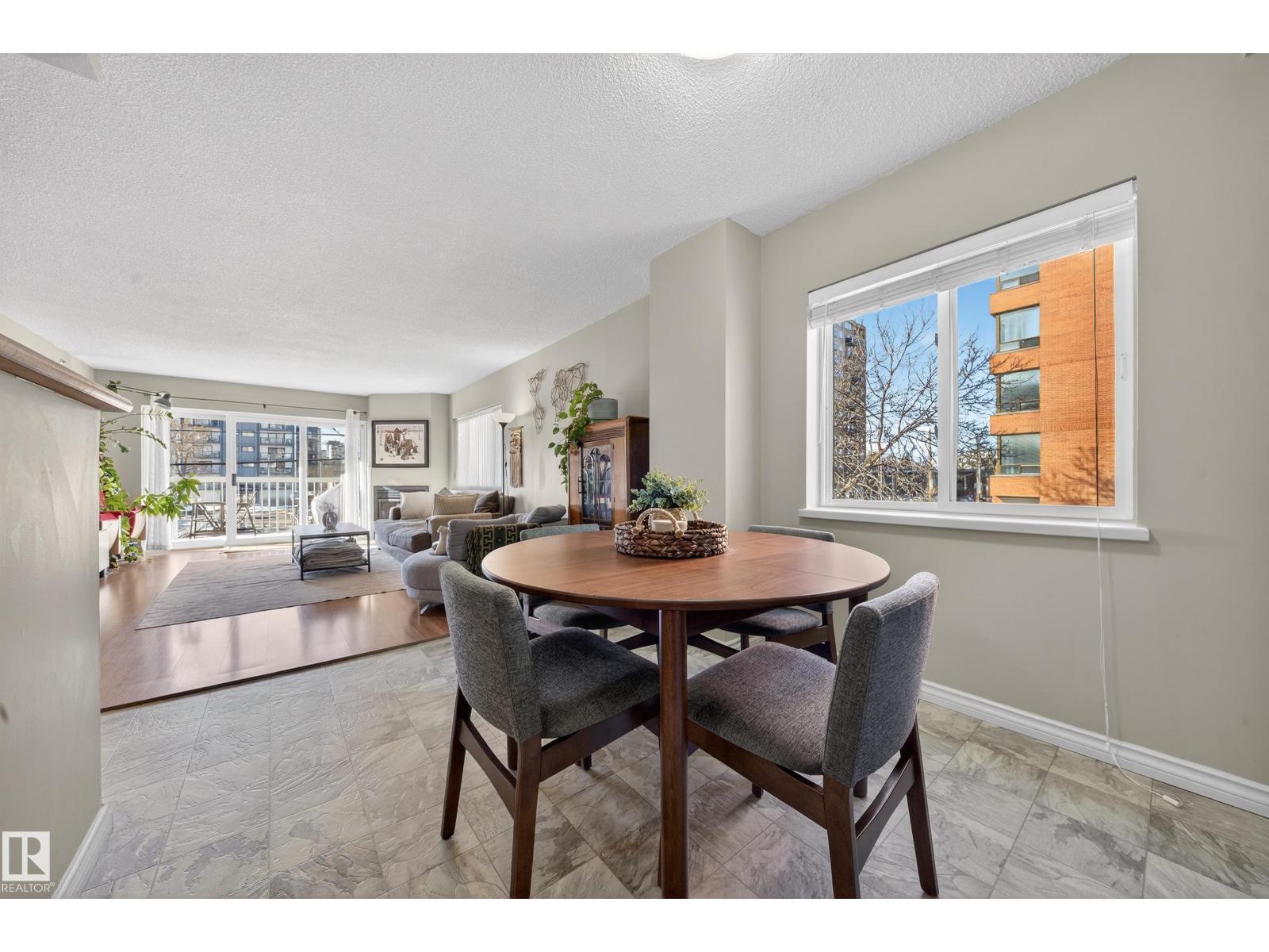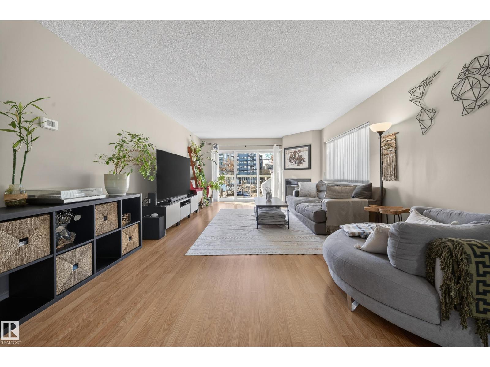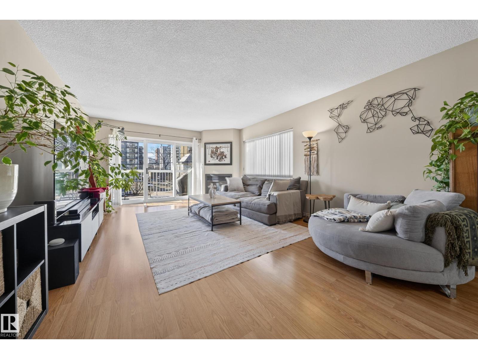 Wake up, grab a coffee, and step into a downtown lifestyle where work, restaurants, and late nights out are all part of your daily rhythm. Offering 1174 SF of comfortable living space, this 2 bedroom, 2 bath condo delivers room to breathe without giving up the energy of the city. The generous living area is anchored by a cozy gas fireplace and large windows that fill the space with natural light, while the kitchen flows effortlessly into dining and living areas, perfect for quiet nights in or hosting friends before heading to Rogers Place or nearby hotspots. Separated bedrooms create privacy for guests or a home office, with central A/C and in-suite laundry adding everyday ease. Step onto the oversized balcony, over 25 ft of outdoor space where mornings feel slower and evenings feel electric. The parking stall in the heated parkade means you never have to face the elements. If downtown living has been calling your name, this is where it starts. (id:63190)