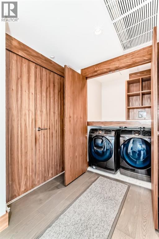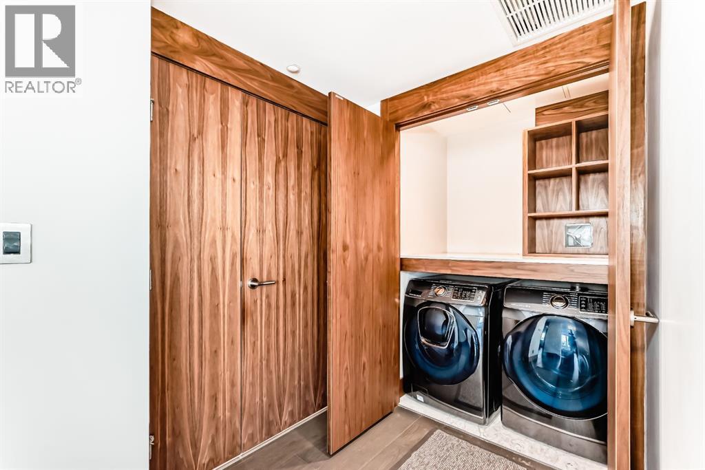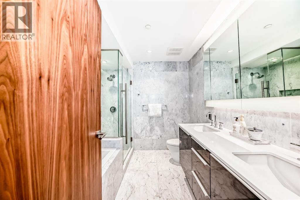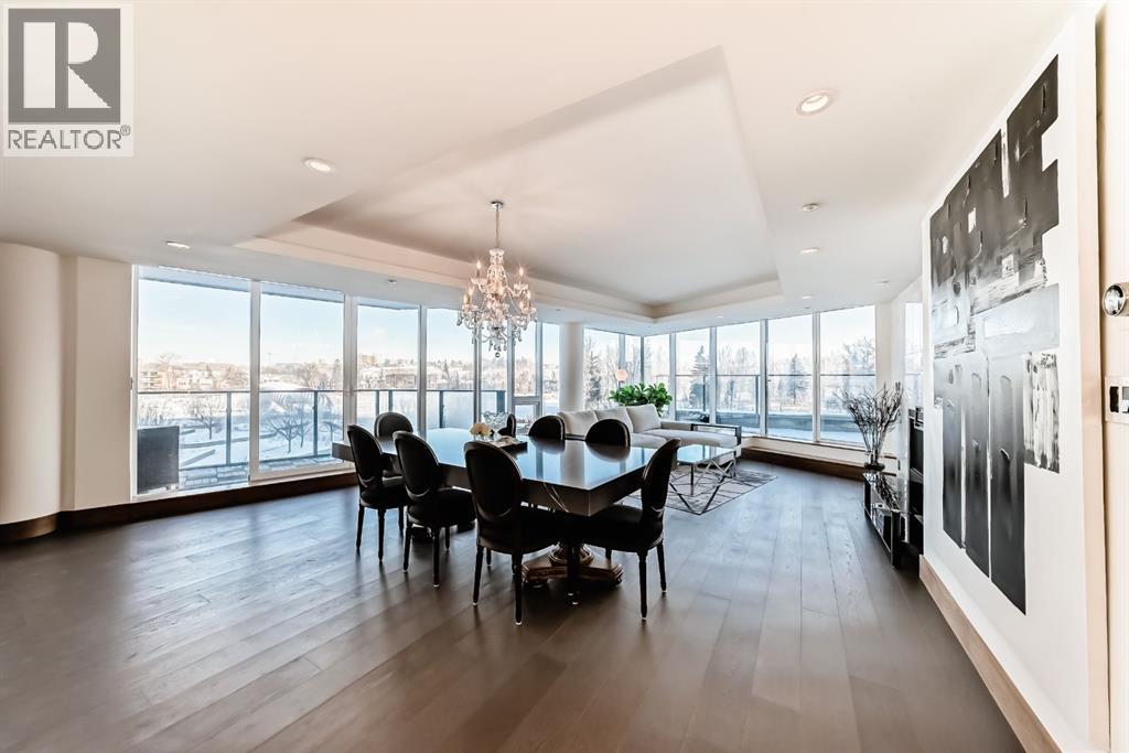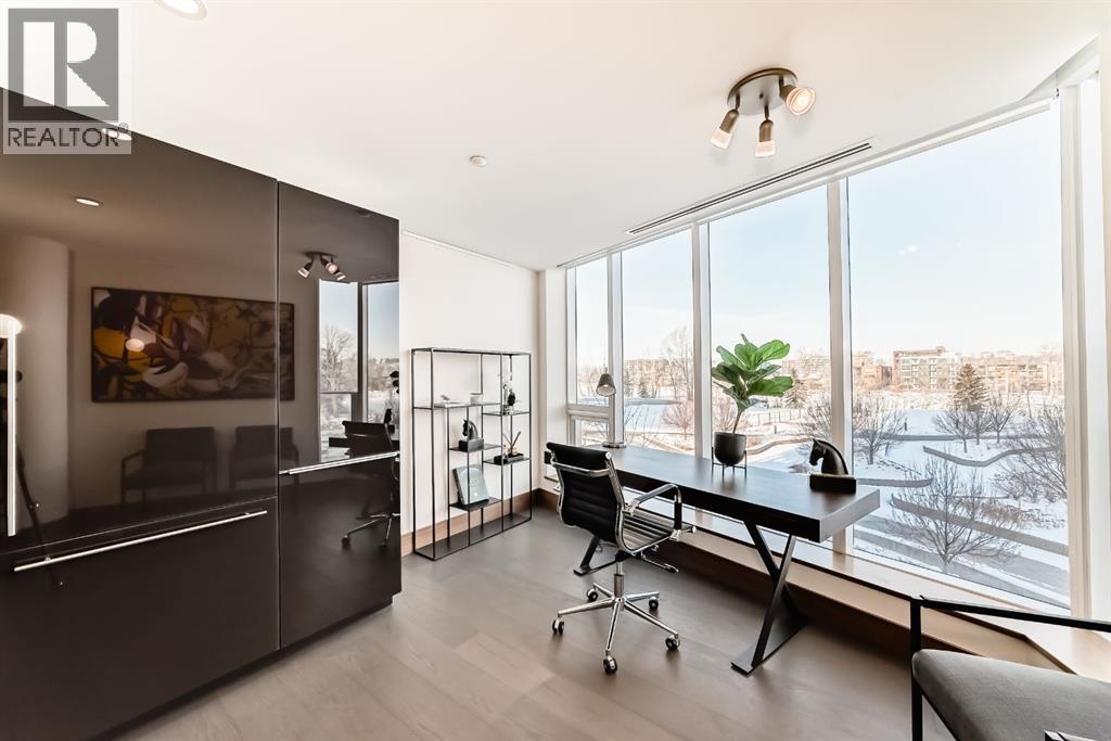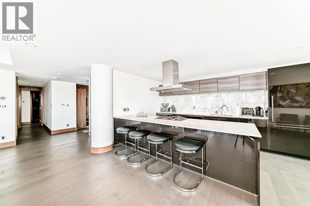 Experience elevated riverfront living in this exceptional original-owner residence at The Concord, ideally situated across from Calgary’s iconic Peace Bridge in prestigious Eau Claire. Offering nearly 2,000 sq. ft. of refined interior space with unobstructed NW and E river views through floor-to-ceiling windows, this luxurious suite features private elevator access to your exclusive foyer, an expansive open-concept layout, hardwood flooring, marble finishes, walnut accents, LED lighting, built-in speakers, heated bathroom floors, and full Control4 automation. The designer Poggenpohl kitchen is equipped with white stone countertops, a large island with seating for four, and premium Miele appliances including a gas cooktop, built-in refrigerator, and wine fridge, seamlessly connecting to the formal dining area and spacious living room with gas fireplace and access to two private balconies. The primary retreat offers balcony access, a custom walk-in closet, and a spa-inspired 5-piece ensuite with dual vanities, marble and glass shower, heated floors, and jetted soaker tub, while the second bedroom also features balcony access and a private 4-piece ensuite with heated flooring. Additional highlights include a separate laundry room, Level 2 EV charging, an oversized private garage, and one of the largest storage units in the building. Residents enjoy 24-hour concierge service, heated underground guest parking, car wash bay with undercarriage wash, fitness centre, elegant party room, and a beautifully landscaped patio with BBQ area overlooking a serene pond that transforms into a winter skating rink—an extraordinary opportunity to own in one of Calgary’s most prestigious addresses. (id:63190)