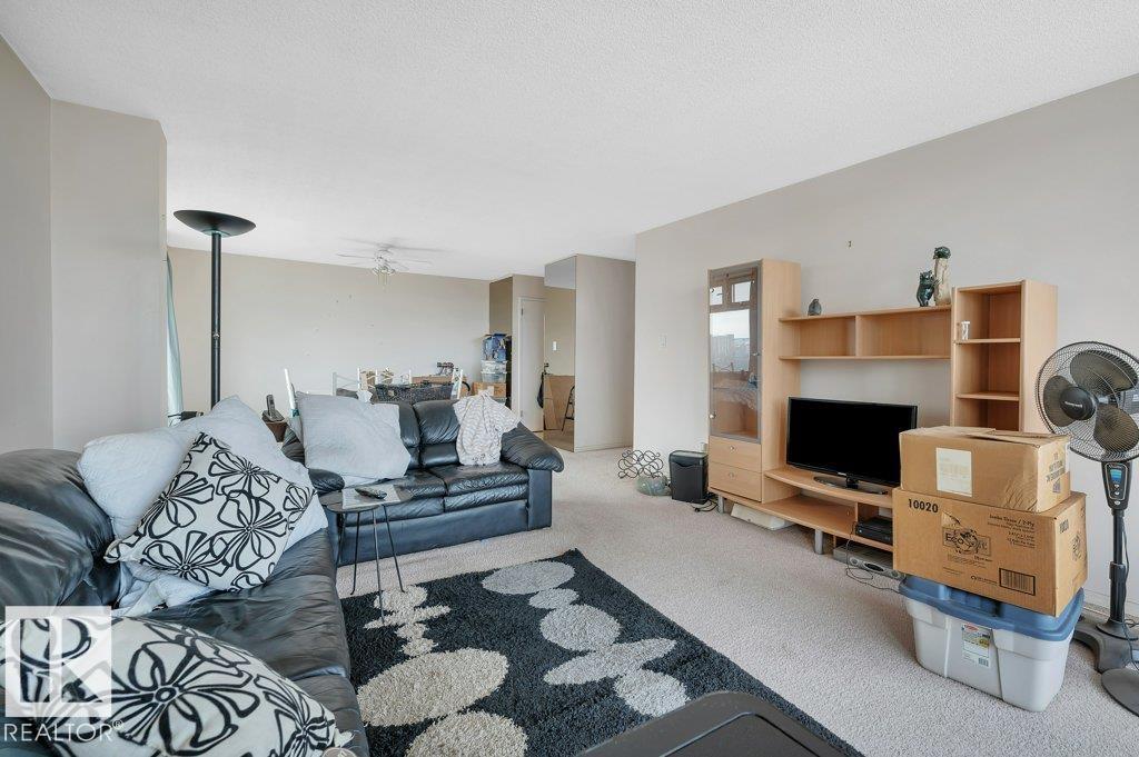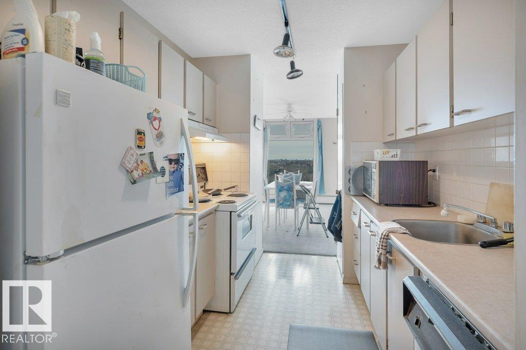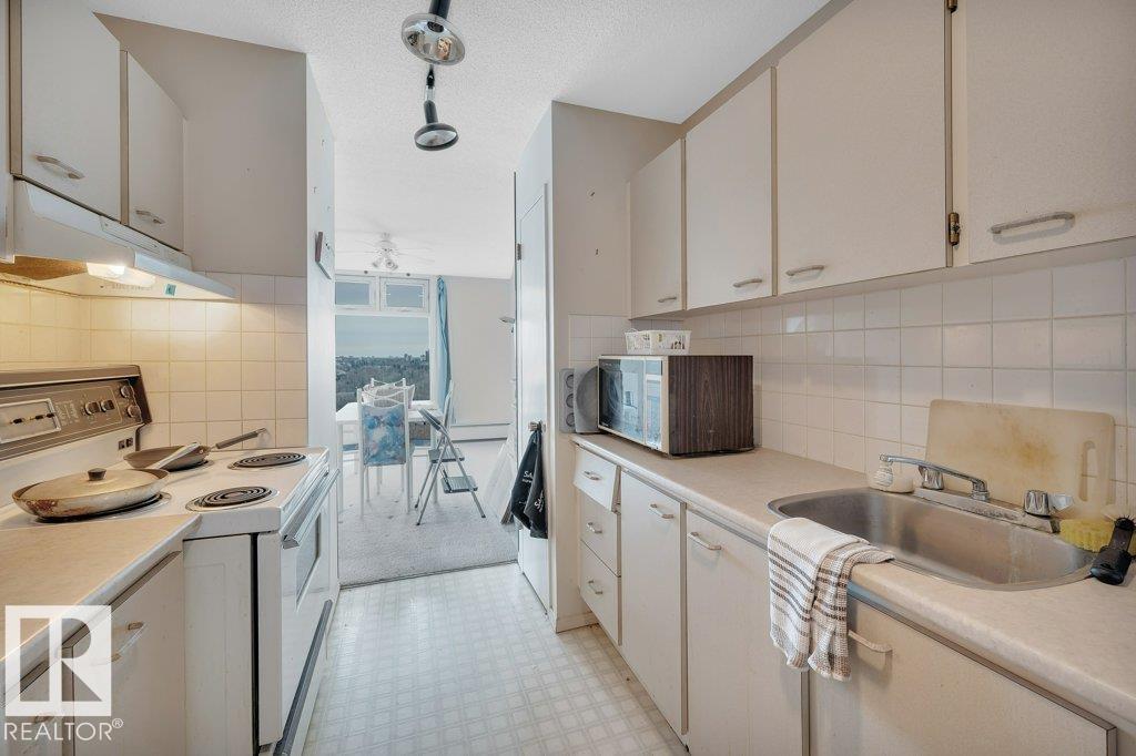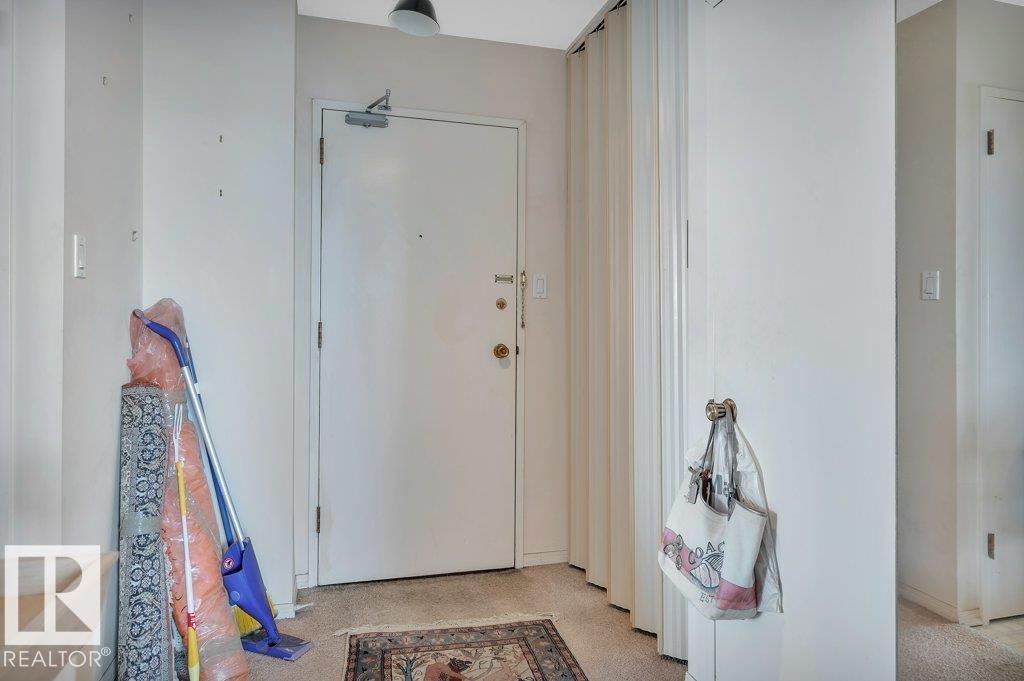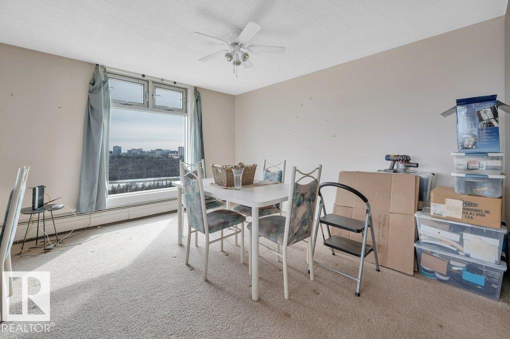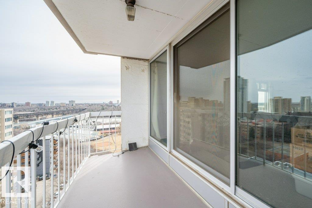 Welcome to your riverside retreat! This charming 2 bedroom, 1 bath corner unit condo offers peaceful living with stunning river valley views from the 15th floor. Ready for your personal updates, the spacious living and dining area features east and south exposure, filling the home with natural light. The kitchen is functional and ready for your custom touch. Built in concrete, the building offers exceptional quiet and privacy. Enjoy the convenience of same-floor laundry, a fully equipped gym with sauna and change rooms, plus a top-floor meeting room perfect for hosting with breathtaking views. Step onto the expansive rooftop terrace to relax, unwind, and take in the scenery. A large east-facing balcony and inviting courtyard add to the outdoor appeal. Condo fees include utilities. 1 heated underground stall. Just steps to shopping, schools, and scenic riverside trails. (id:63190)