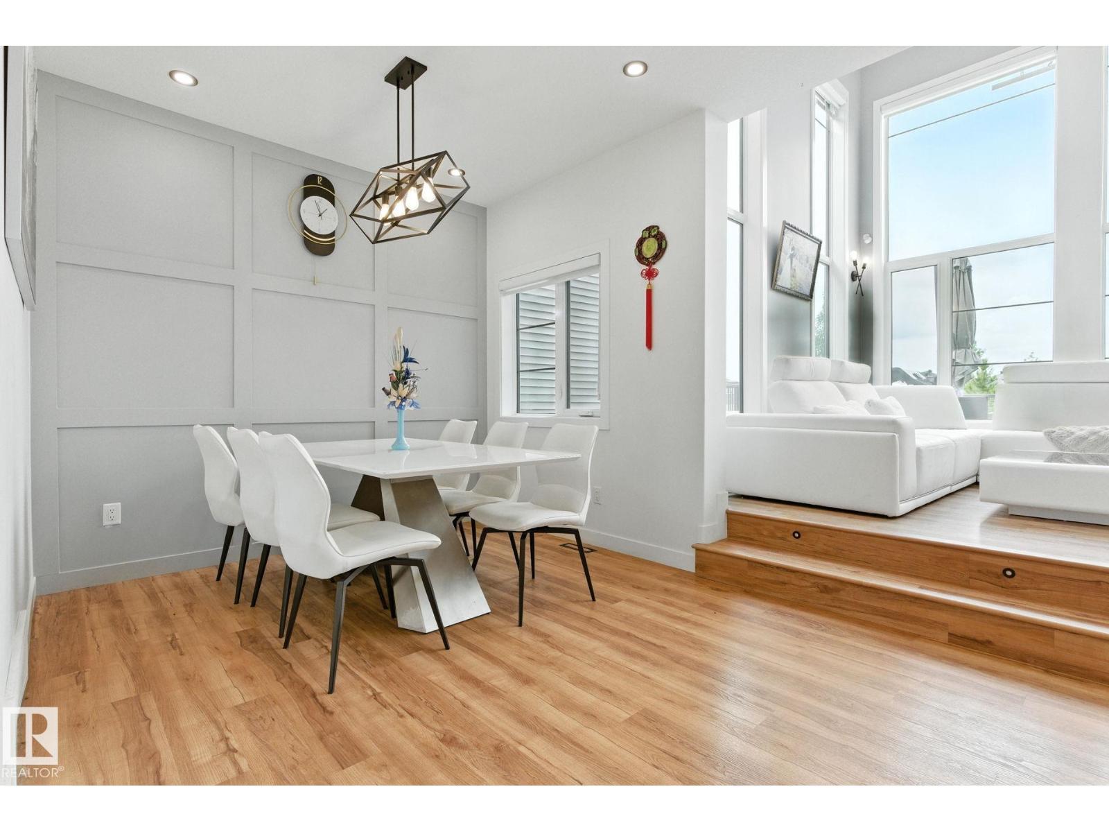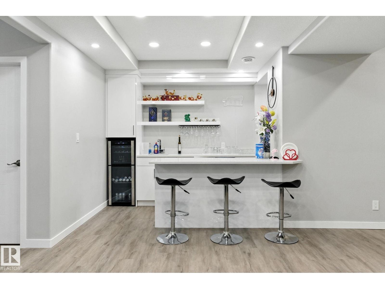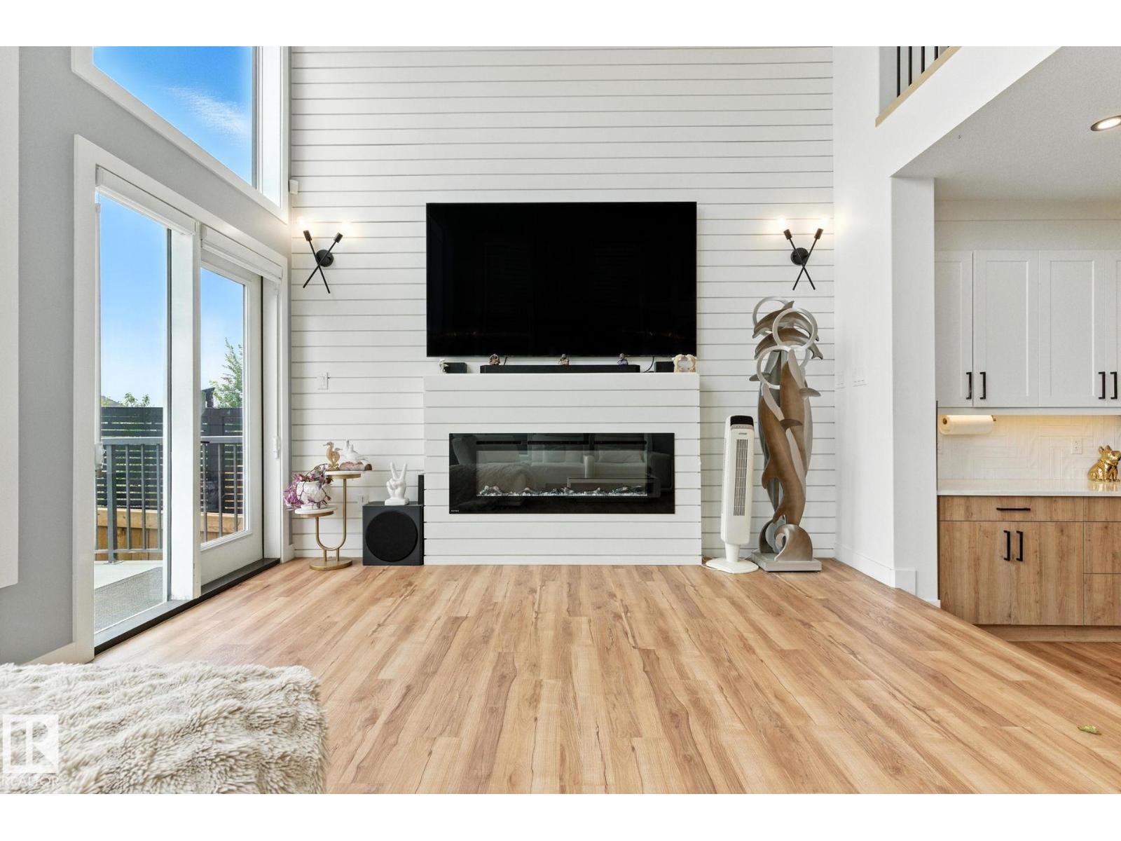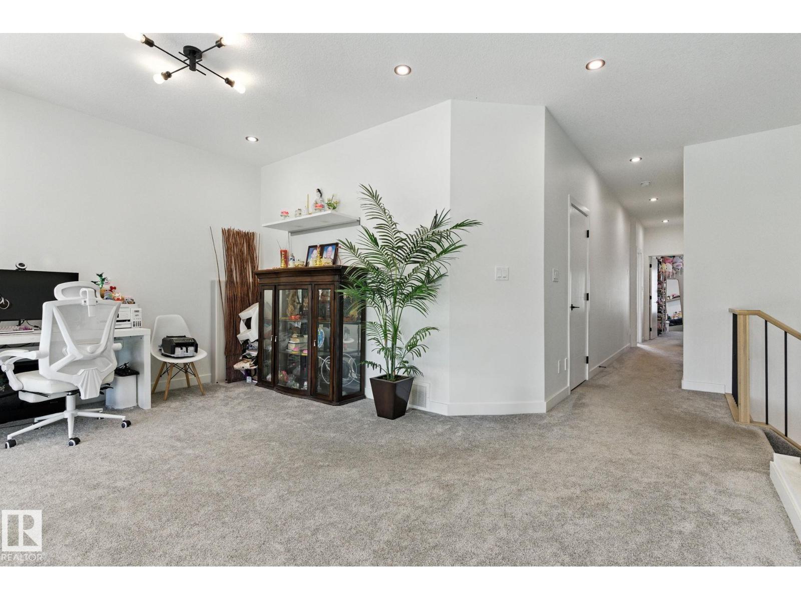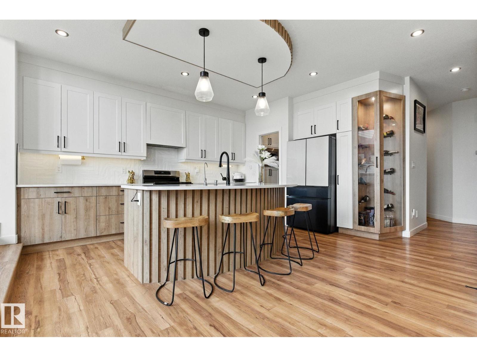 In the growing community of Kinglet Gardens, this home combines style and functionality, featuring elegant flooring, accent walls, upgraded lighting, and a kitchen with warm wood tones, built-in wine storage, and modern appliances. The main floor offers a dining area, half bathroom, and a flexible office or bedroom, while the open-to-above living room with floor-to-ceiling windows allows natural light to fill the space and creates a sense of openness. Upstairs includes a bonus room, a space suitable for a gym or meditation area, and a primary suite with coffered ceilings, barn door, ensuite with dual sinks, and a walk-in closet connected to the laundry, along with two additional bedrooms and a full bathroom. The finished basement features a separate side entrance, wet bar, entertainment area, and a den that can be used for work, guests, or hobbies, with additional storage and utility spaces. Located near schools, parks, and main roadways, the home supports a well-connected and convenient lifestyle. (id:63190)