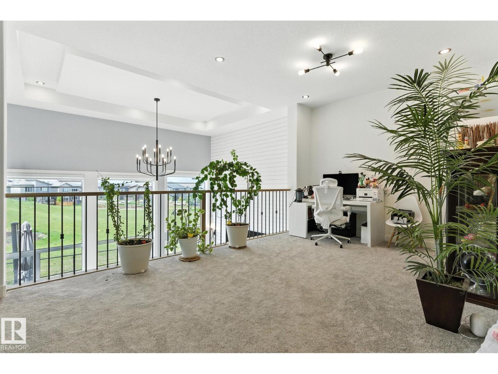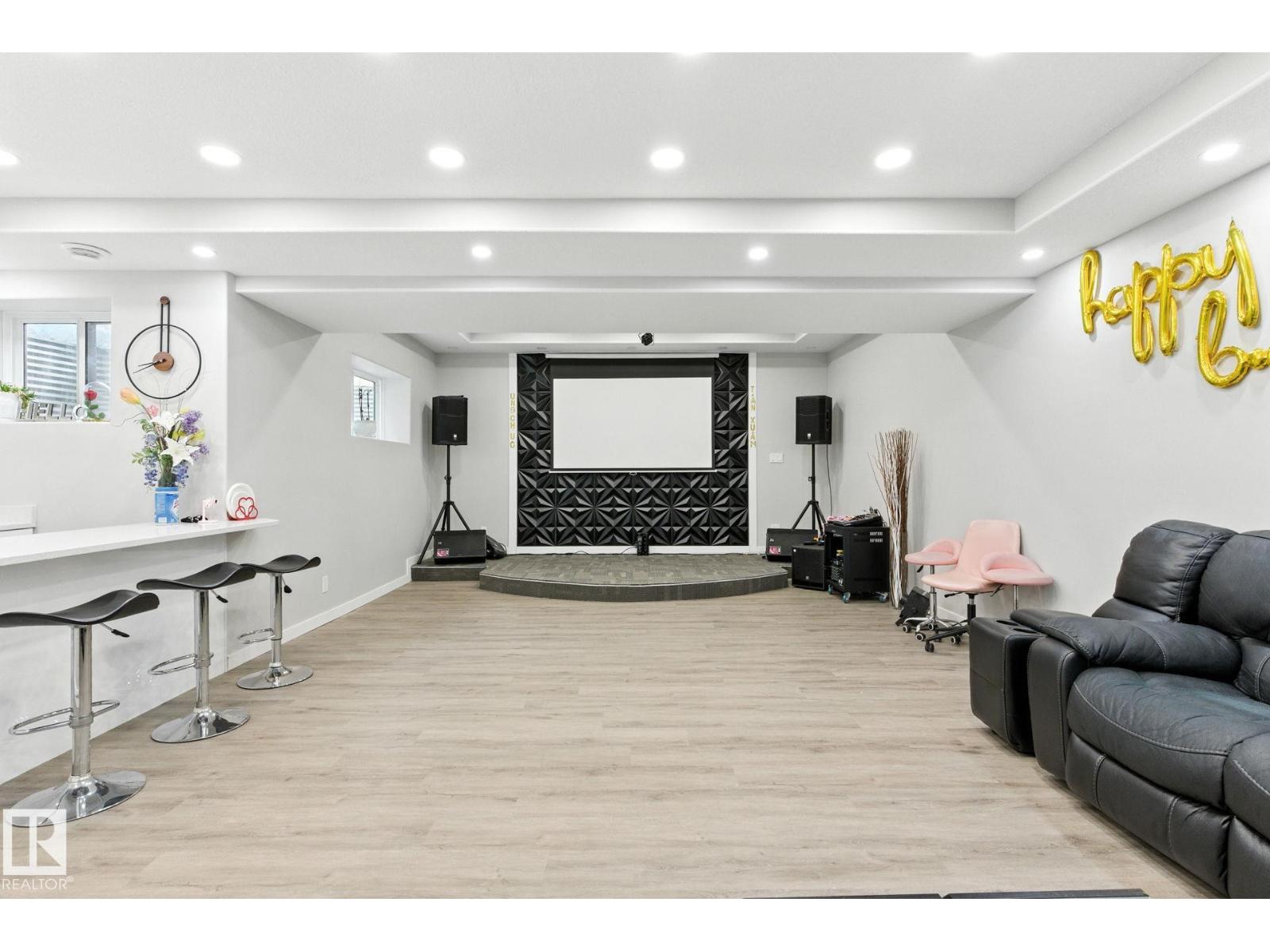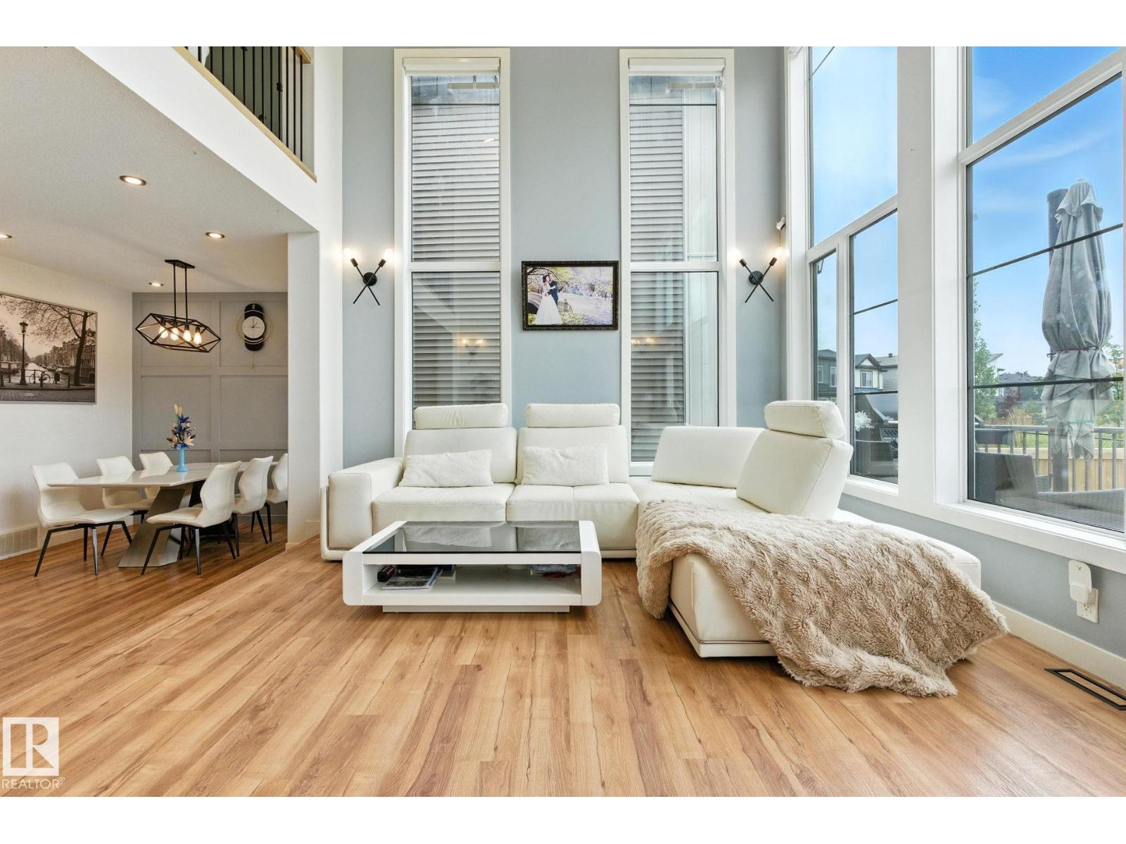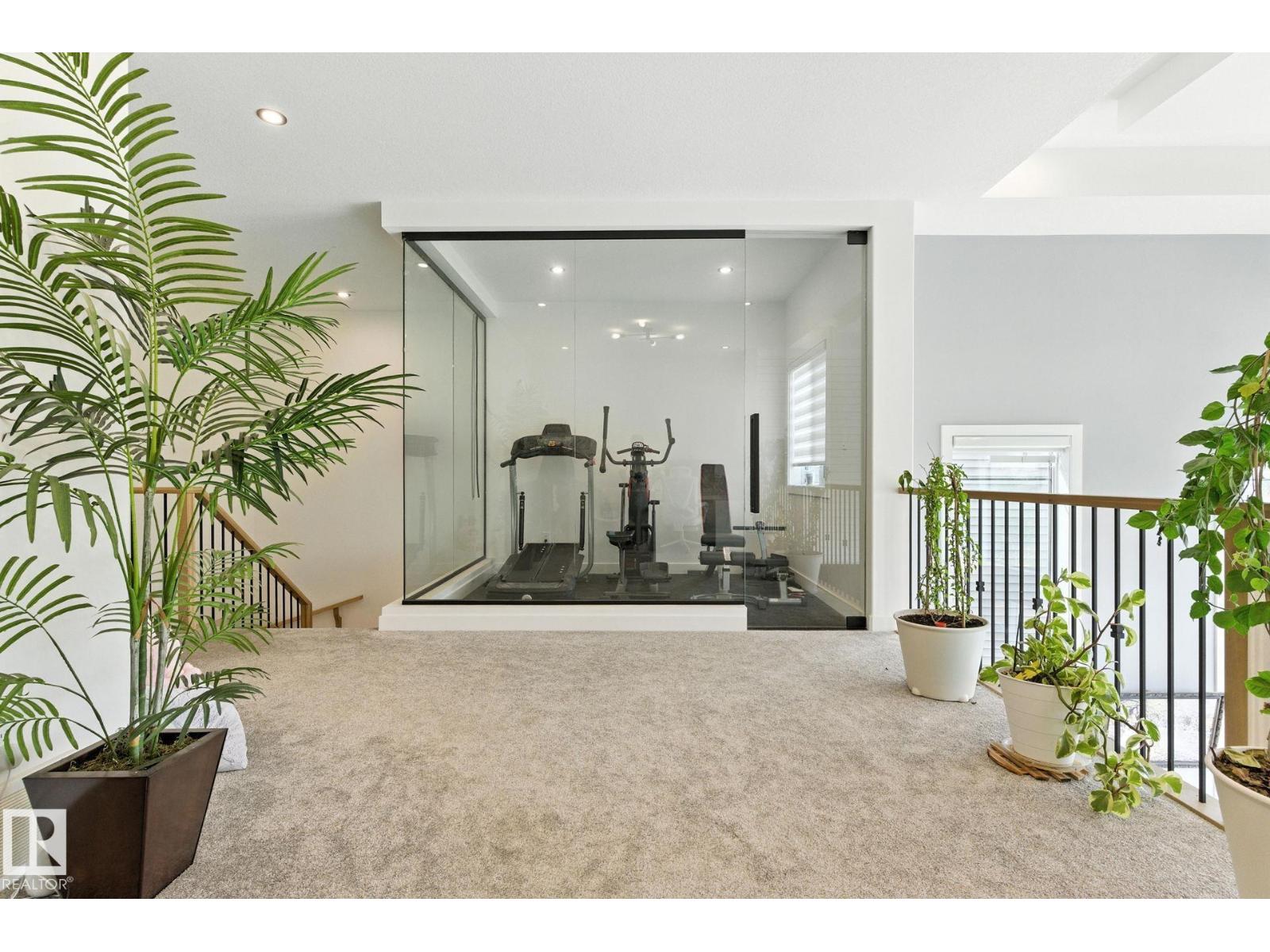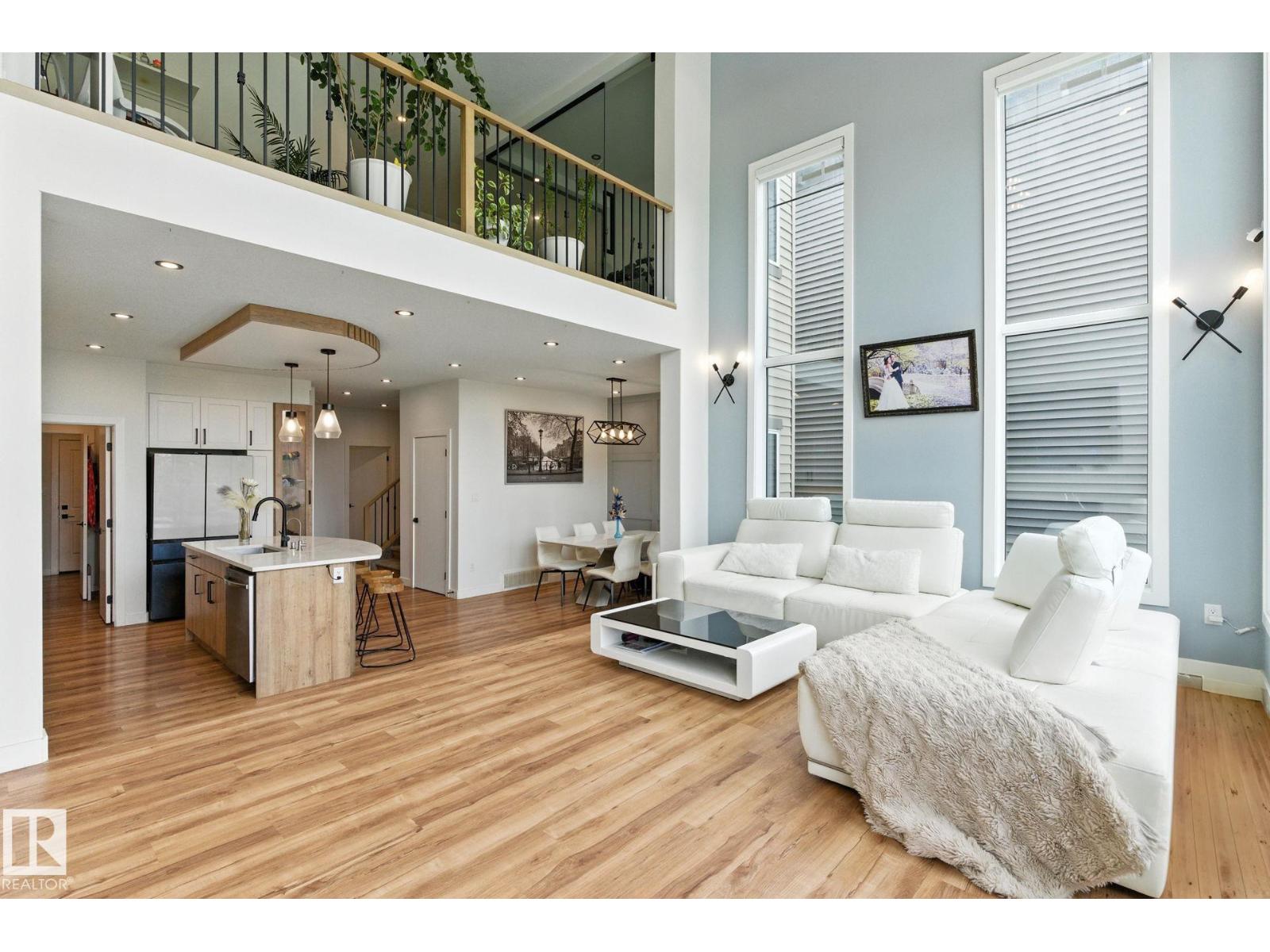 In the growing community of Kinglet Gardens, this home combines style and functionality, featuring elegant flooring, accent walls, upgraded lighting, and a kitchen with warm wood tones, built-in wine storage, and modern appliances. The main floor offers a dining area, half bathroom, and a flexible office or bedroom, while the open-to-above living room with floor-to-ceiling windows allows natural light to fill the space and creates a sense of openness. Upstairs includes a bonus room, a space suitable for a gym or meditation area, and a primary suite with coffered ceilings, barn door, ensuite with dual sinks, and a walk-in closet connected to the laundry, along with two additional bedrooms and a full bathroom. The finished basement features a separate side entrance, wet bar, entertainment area, and a den that can be used for work, guests, or hobbies, with additional storage and utility spaces. Located near schools, parks, and main roadways, the home supports a well-connected and convenient lifestyle. (id:63190)