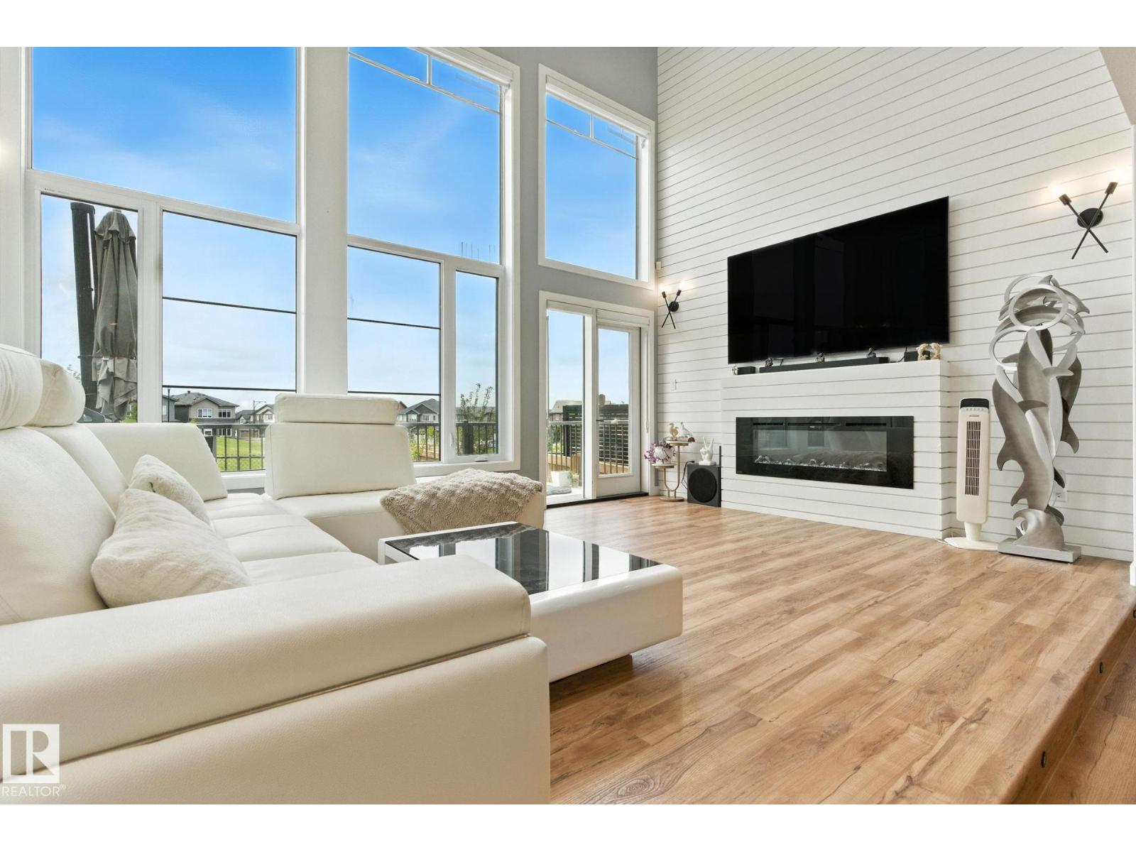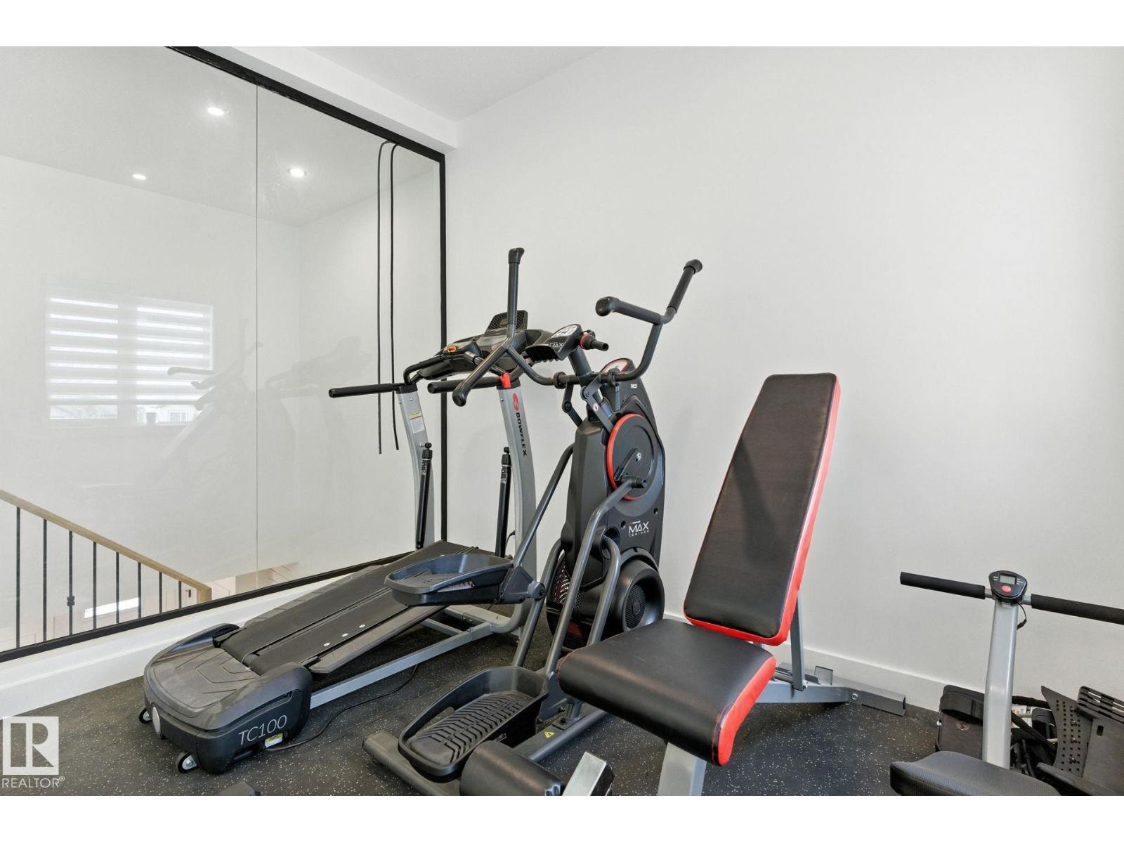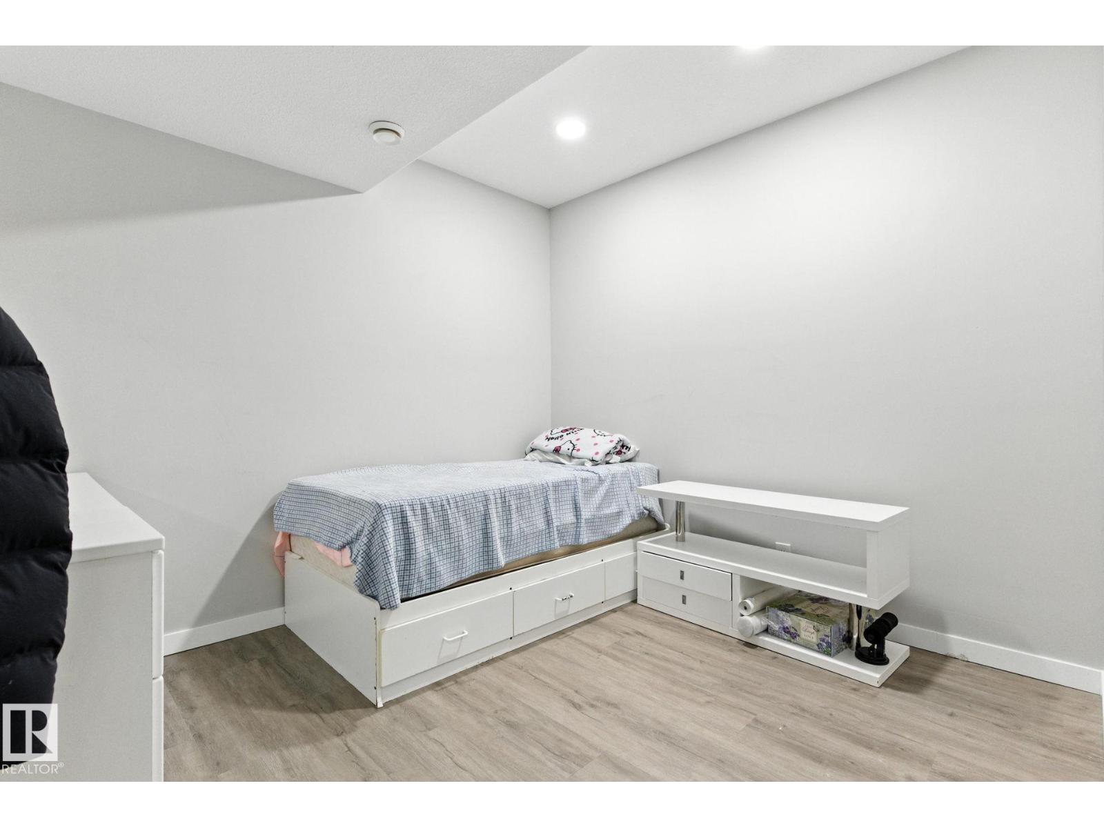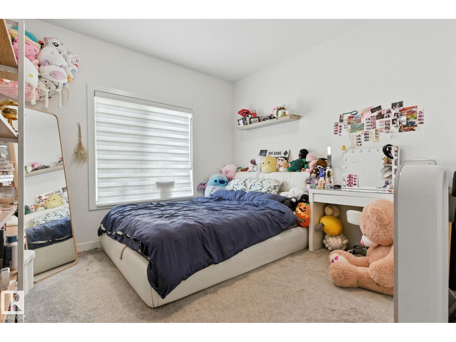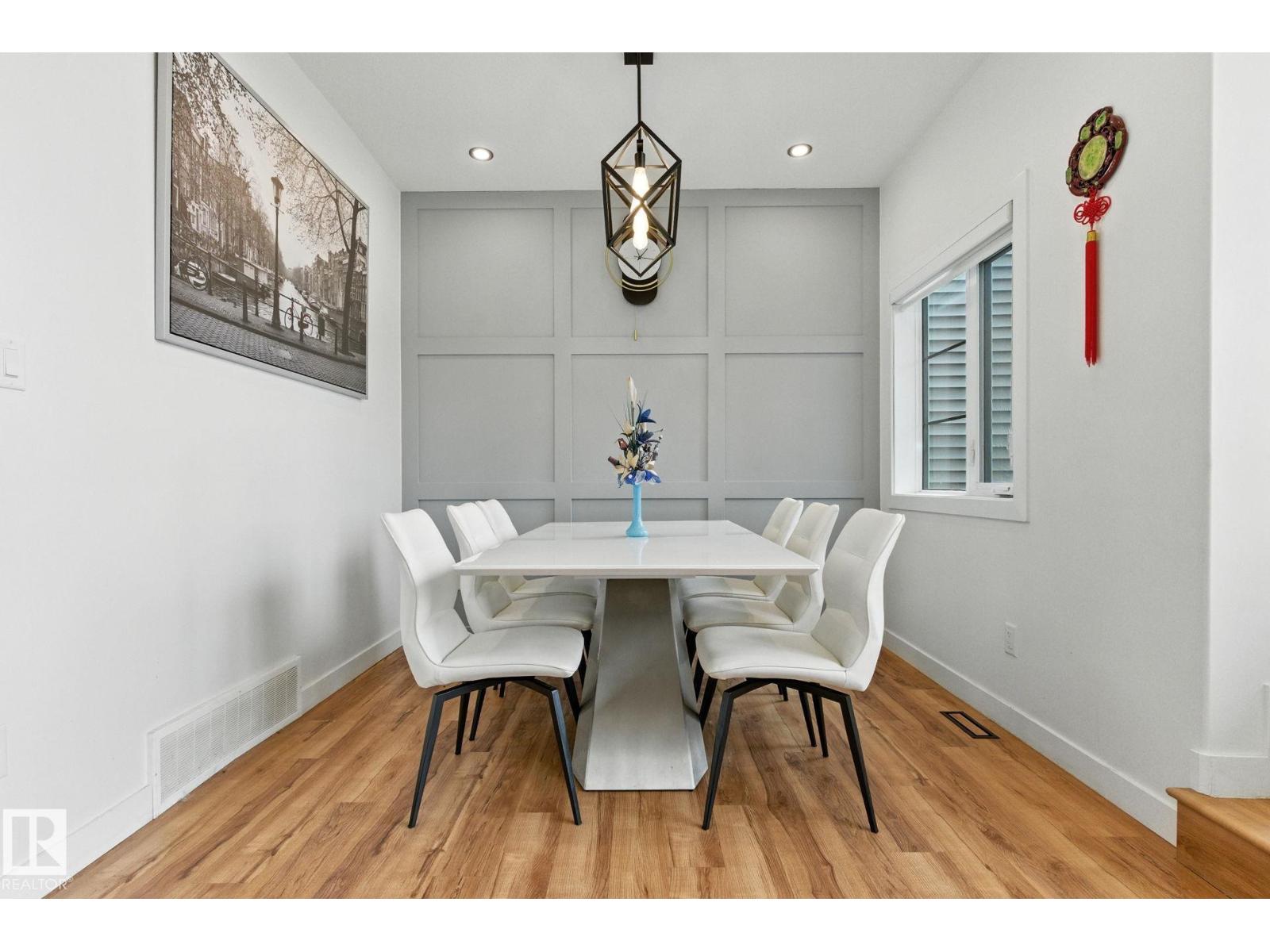 In the growing community of Kinglet Gardens, this home combines style and functionality, featuring elegant flooring, accent walls, upgraded lighting, and a kitchen with warm wood tones, built-in wine storage, and modern appliances. The main floor offers a dining area, half bathroom, and a flexible office or bedroom, while the open-to-above living room with floor-to-ceiling windows allows natural light to fill the space and creates a sense of openness. Upstairs includes a bonus room, a space suitable for a gym or meditation area, and a primary suite with coffered ceilings, barn door, ensuite with dual sinks, and a walk-in closet connected to the laundry, along with two additional bedrooms and a full bathroom. The finished basement features a separate side entrance, wet bar, entertainment area, and a den that can be used for work, guests, or hobbies, with additional storage and utility spaces. Located near schools, parks, and main roadways, the home supports a well-connected and convenient lifestyle. (id:63190)