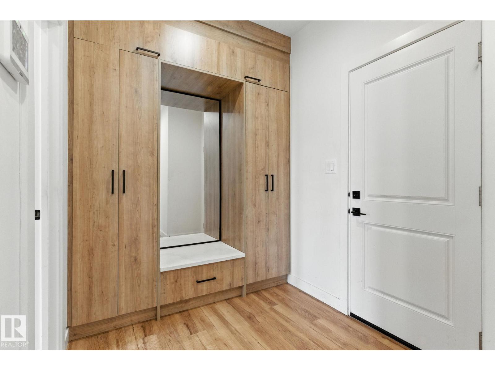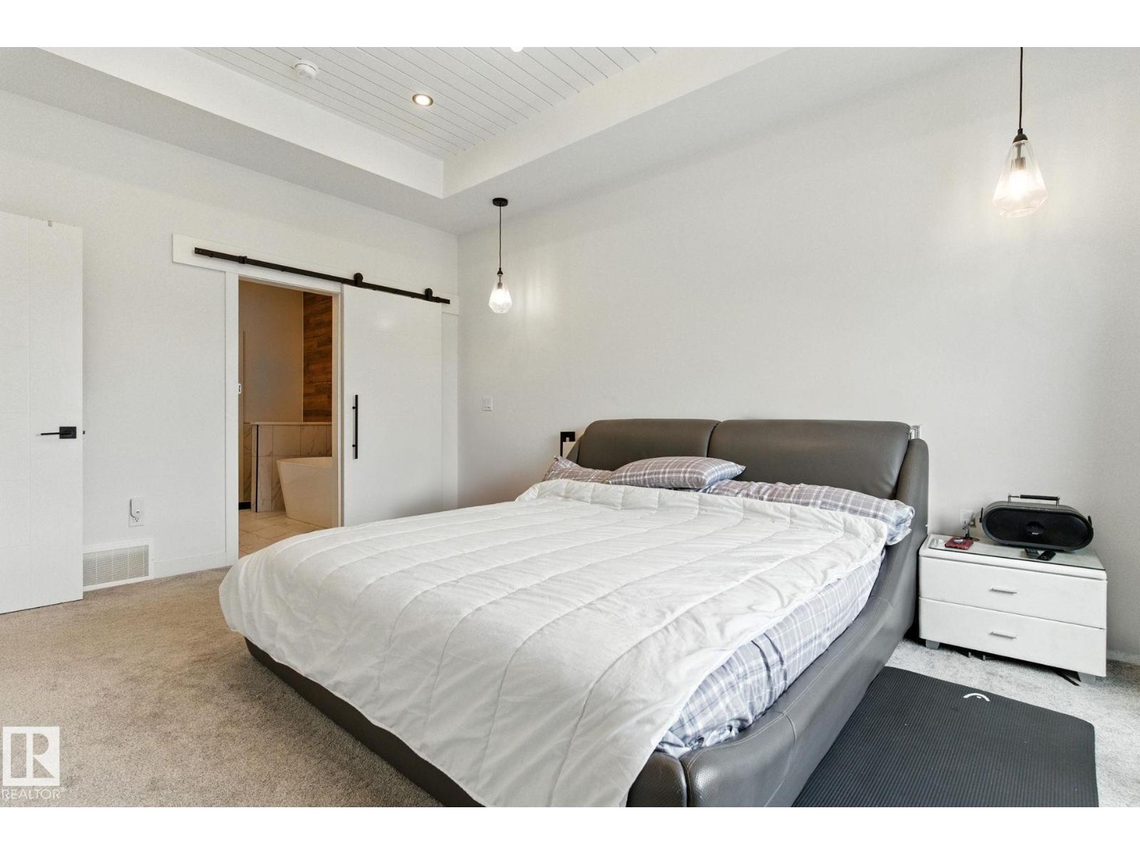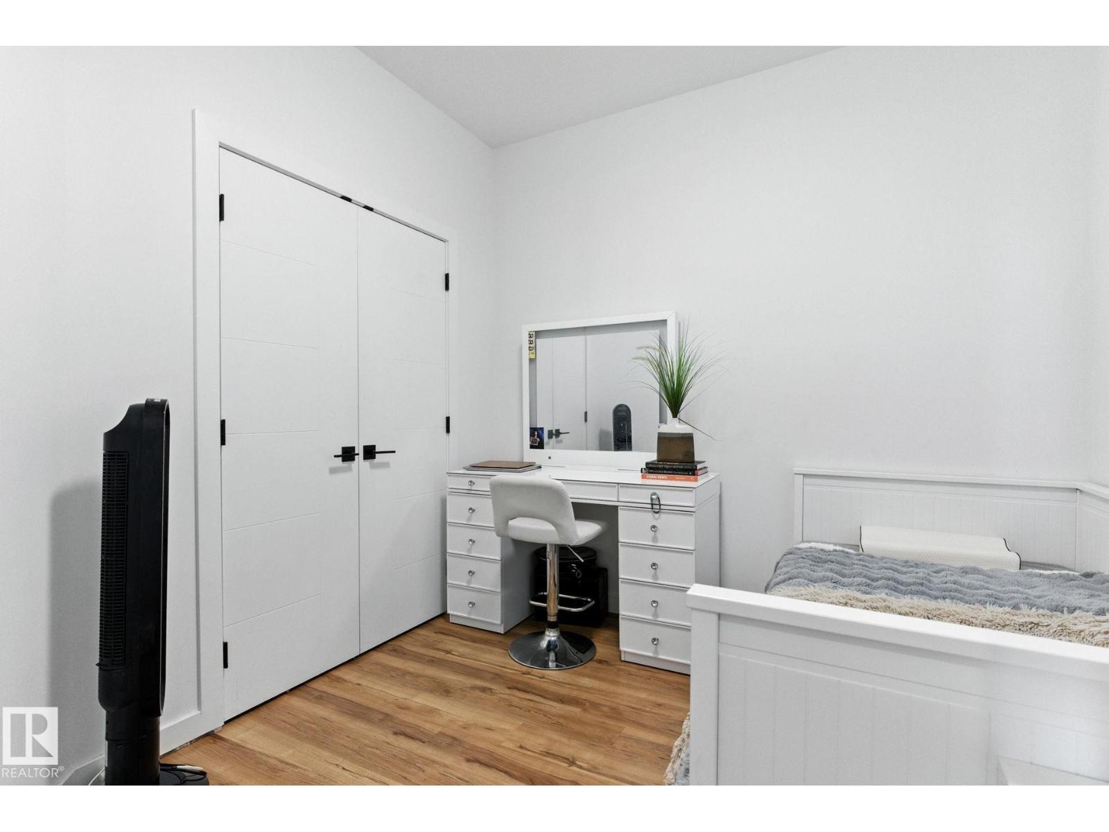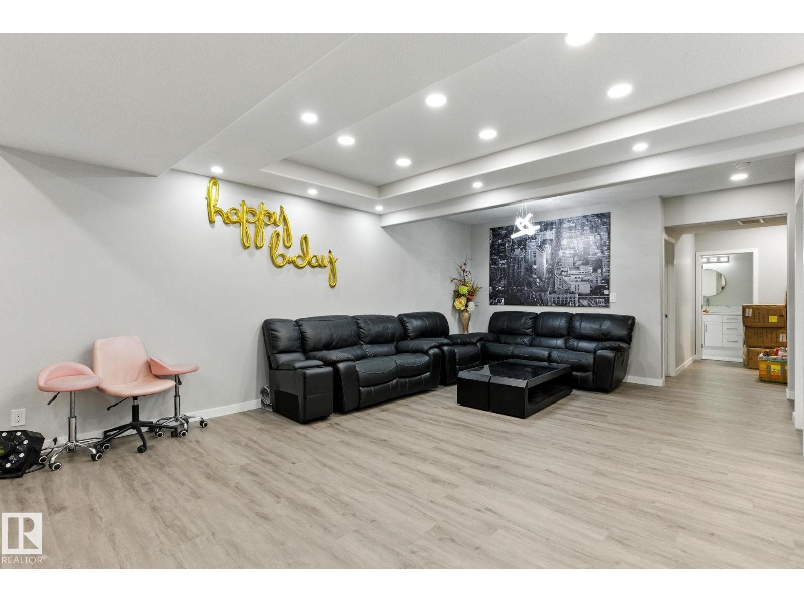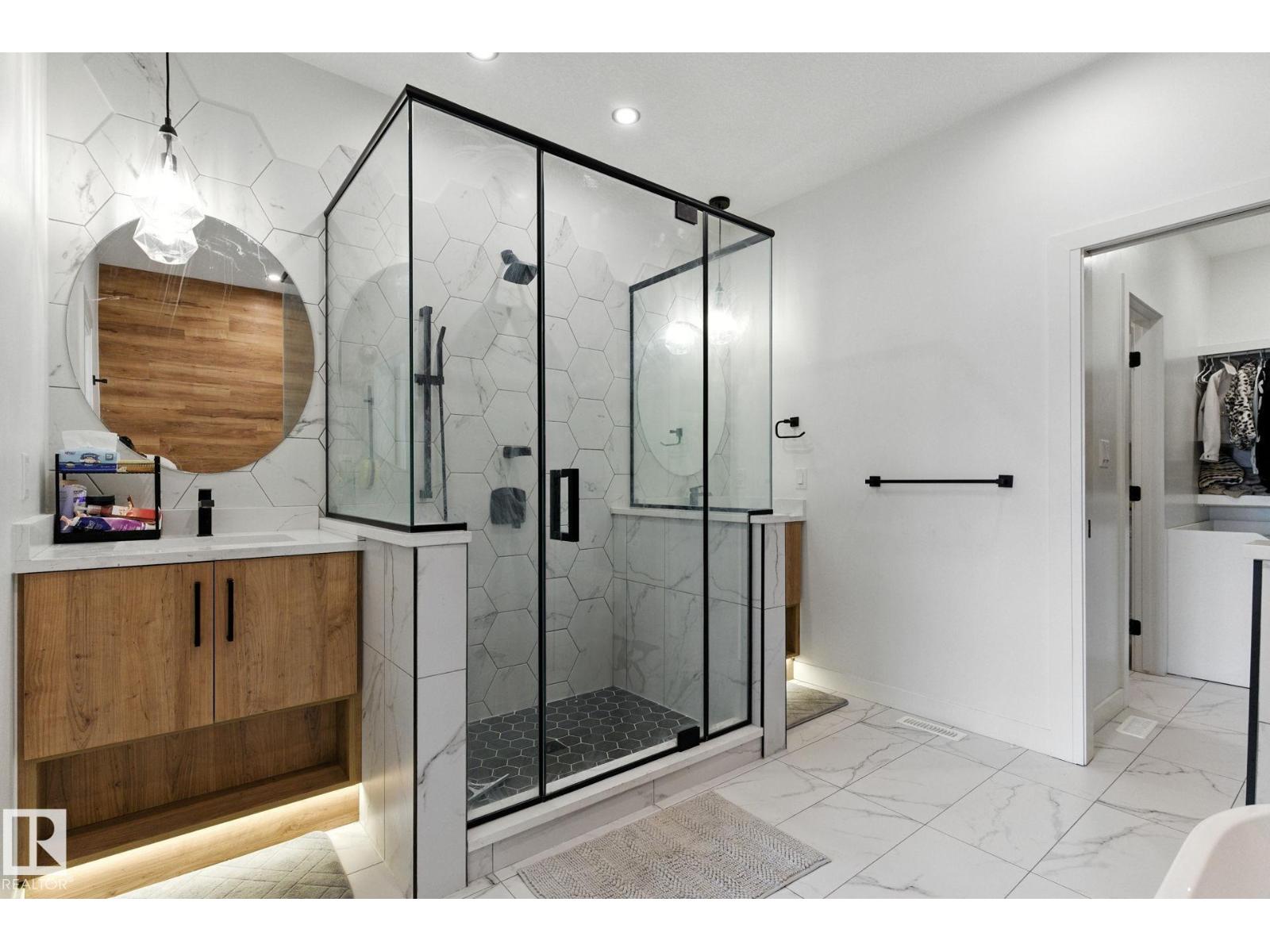 In the growing community of Kinglet Gardens, this home combines style and functionality, featuring elegant flooring, accent walls, upgraded lighting, and a kitchen with warm wood tones, built-in wine storage, and modern appliances. The main floor offers a dining area, half bathroom, and a flexible office or bedroom, while the open-to-above living room with floor-to-ceiling windows allows natural light to fill the space and creates a sense of openness. Upstairs includes a bonus room, a space suitable for a gym or meditation area, and a primary suite with coffered ceilings, barn door, ensuite with dual sinks, and a walk-in closet connected to the laundry, along with two additional bedrooms and a full bathroom. The finished basement features a separate side entrance, wet bar, entertainment area, and a den that can be used for work, guests, or hobbies, with additional storage and utility spaces. Located near schools, parks, and main roadways, the home supports a well-connected and convenient lifestyle. (id:63190)