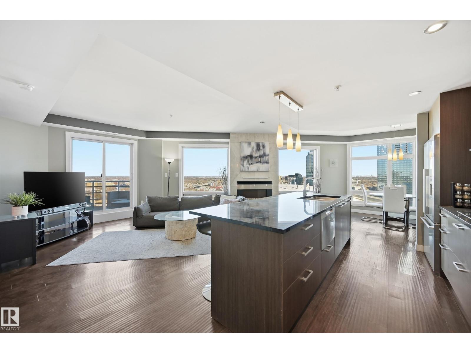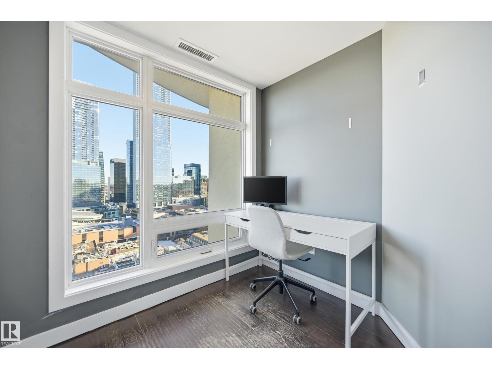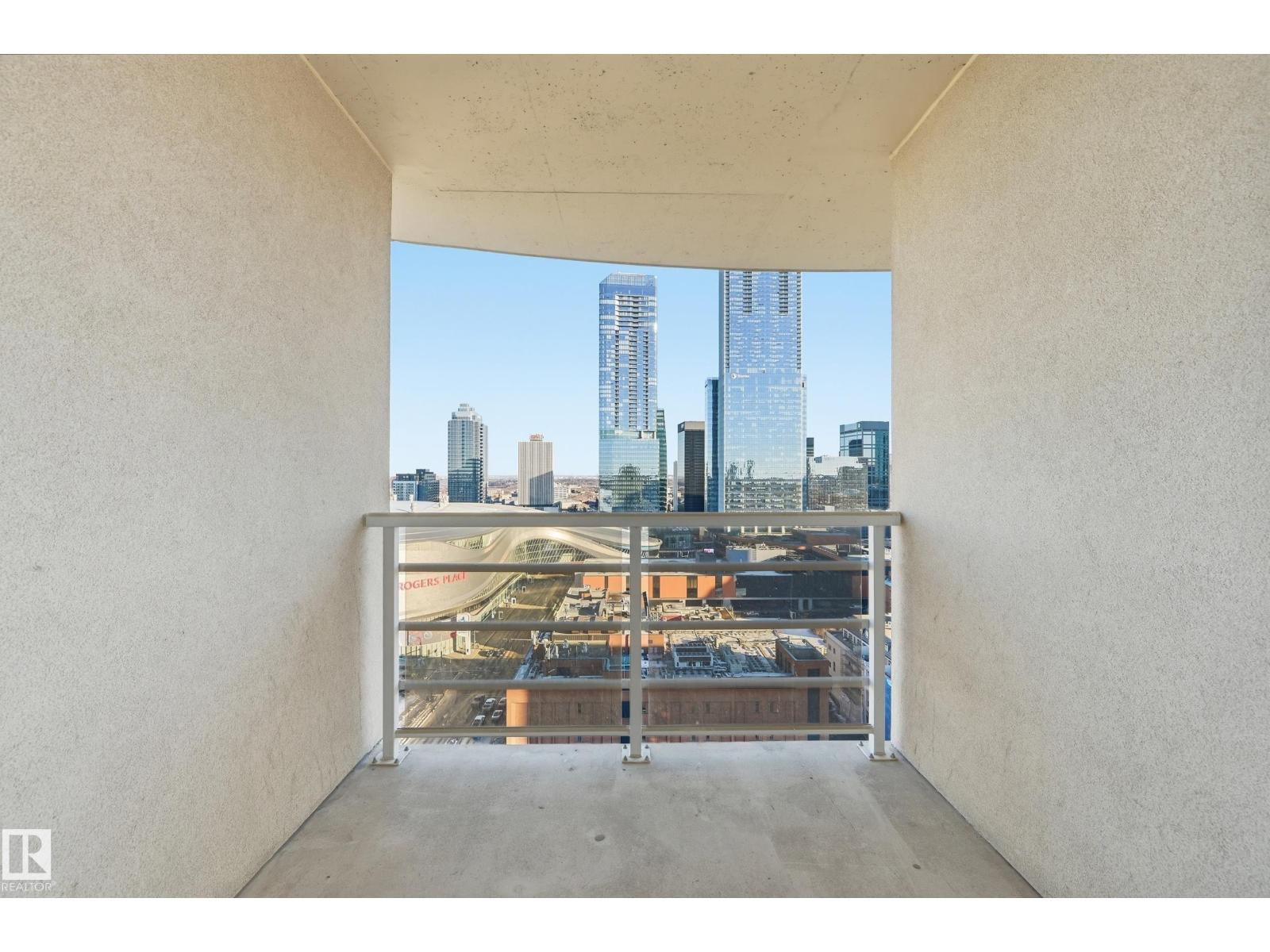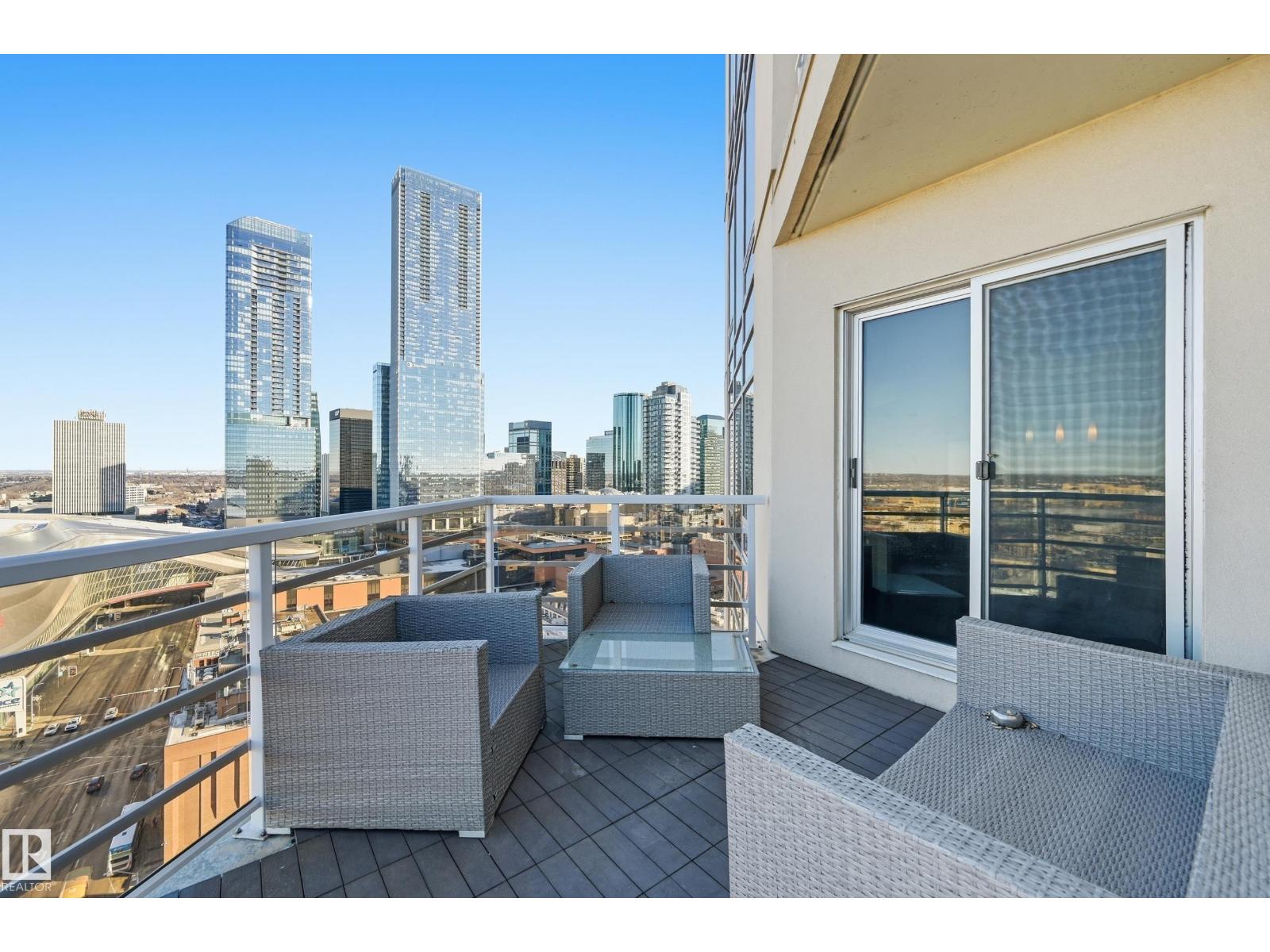 Welcome to this rare sub-penthouse in the heart of downtown, just steps from the Ice District. Offering over 1,150 SQFT of upscale living, this unit features one of the best views in the building—directly facing Rogers Place. The bright, open layout welcomes you with floor-to-ceiling light and a seamless flow throughout. The kitchen is equipped with stainless steel appliances and a large granite island, perfect for entertaining or everyday cooking. Step out onto your wraparound balcony and enjoy incredible sunlight and city views. The spacious primary bedroom includes its own private balcony, full ensuite, and a generous walk-in closet. In addition to two bedrooms, there’s a well-sized den/office filled with natural light—ideal for working from home. A rare opportunity in an unbeatable location! (id:63190)