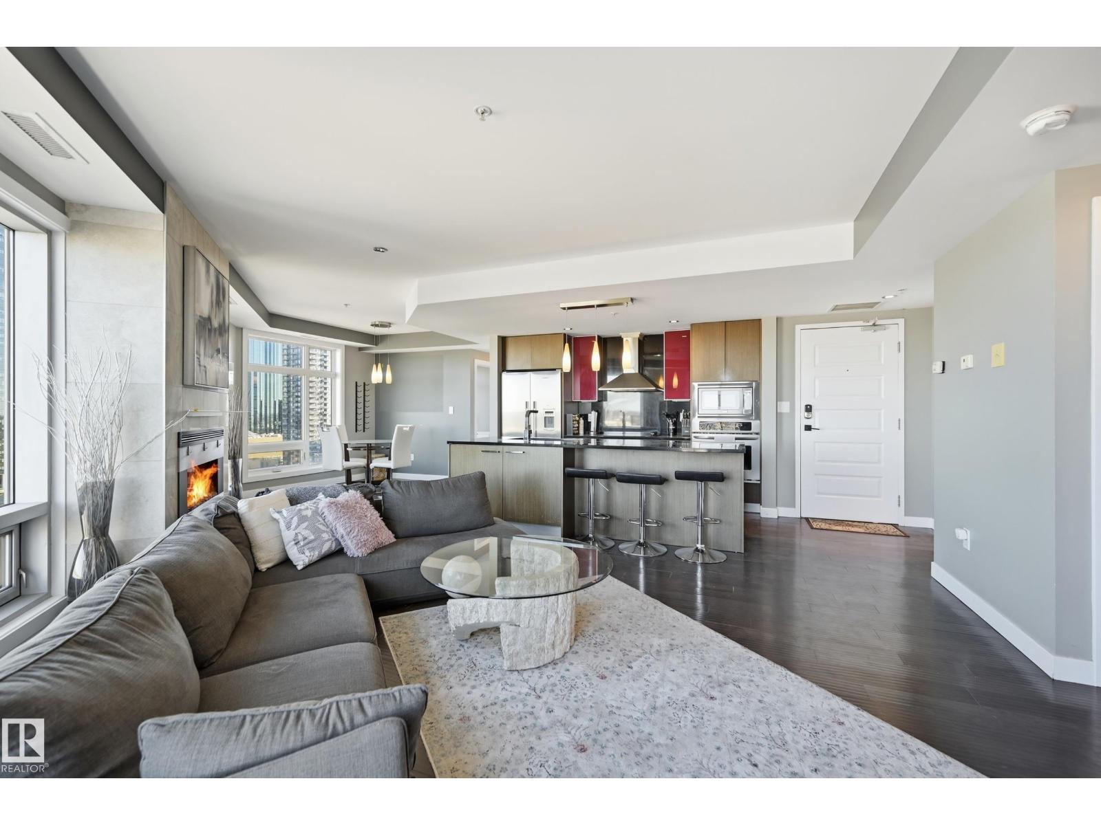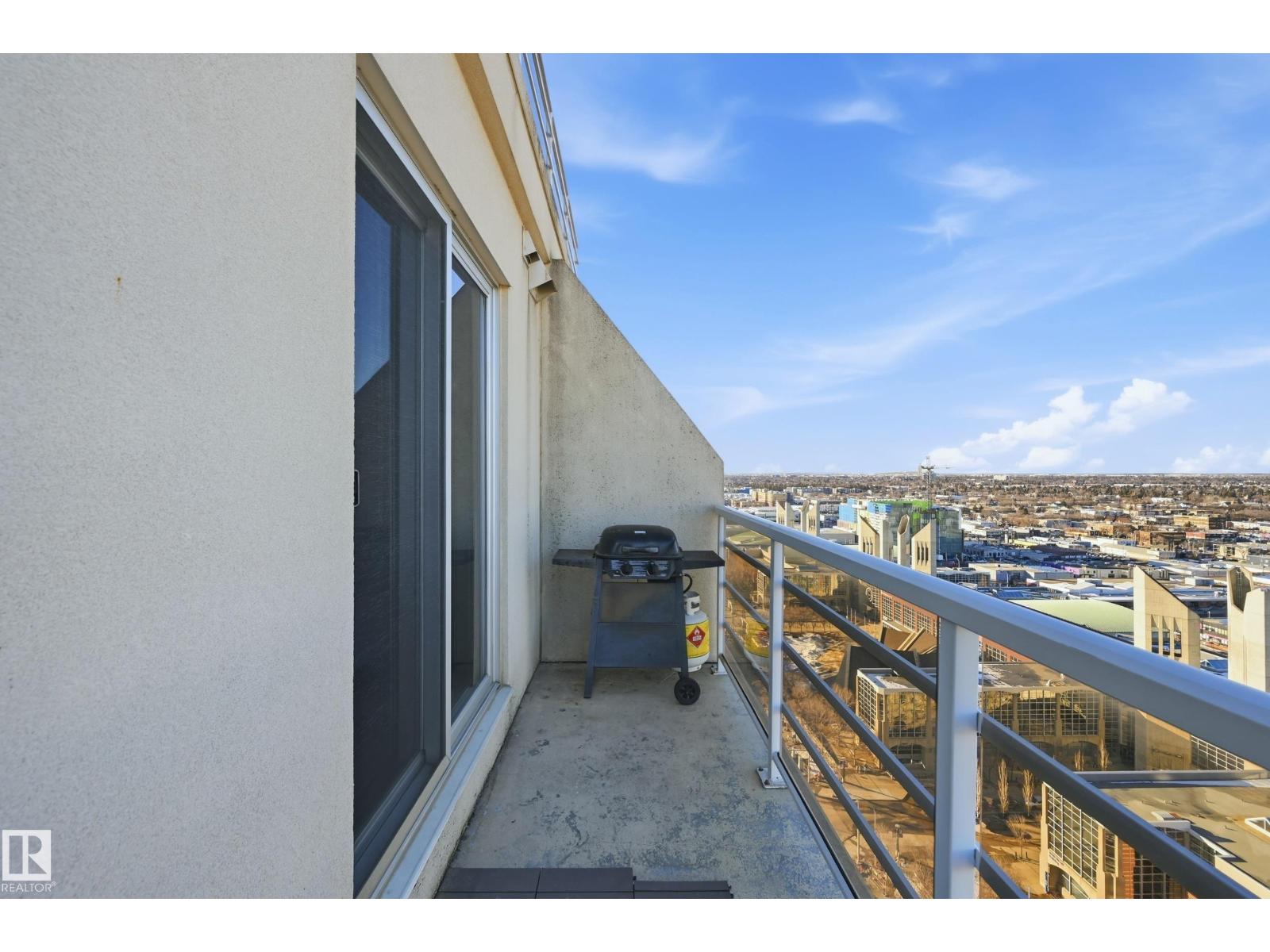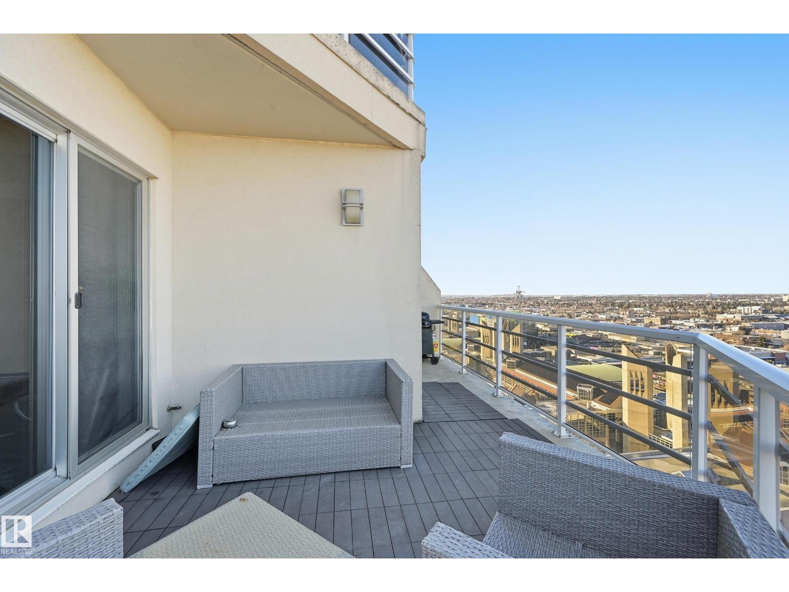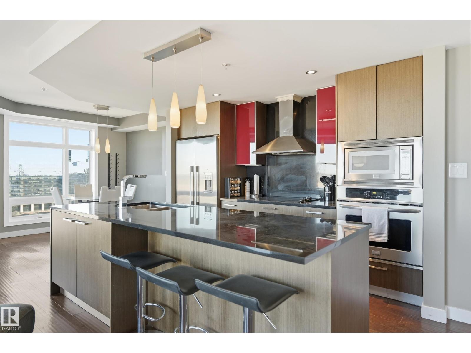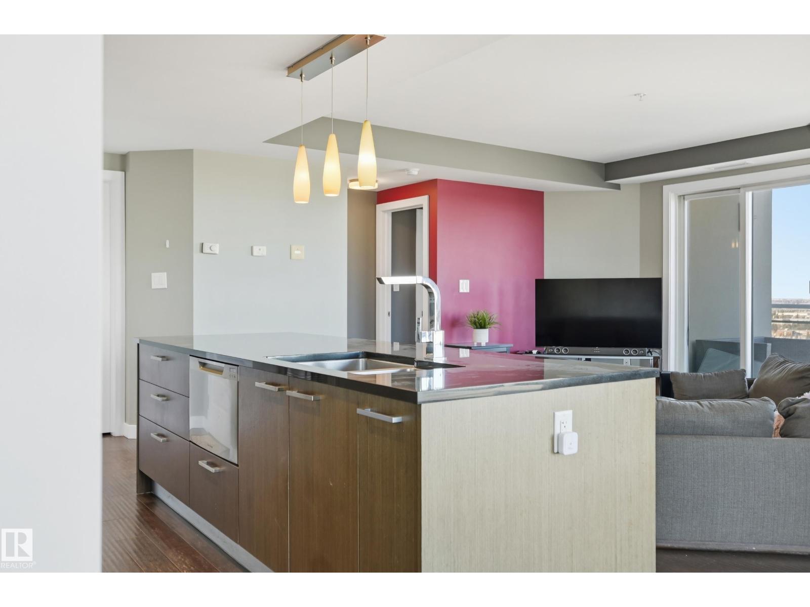 Welcome to this rare sub-penthouse in the heart of downtown, just steps from the Ice District. Offering over 1,150 SQFT of upscale living, this unit features one of the best views in the building—directly facing Rogers Place. The bright, open layout welcomes you with floor-to-ceiling light and a seamless flow throughout. The kitchen is equipped with stainless steel appliances and a large granite island, perfect for entertaining or everyday cooking. Step out onto your wraparound balcony and enjoy incredible sunlight and city views. The spacious primary bedroom includes its own private balcony, full ensuite, and a generous walk-in closet. In addition to two bedrooms, there’s a well-sized den/office filled with natural light—ideal for working from home. A rare opportunity in an unbeatable location! (id:63190)