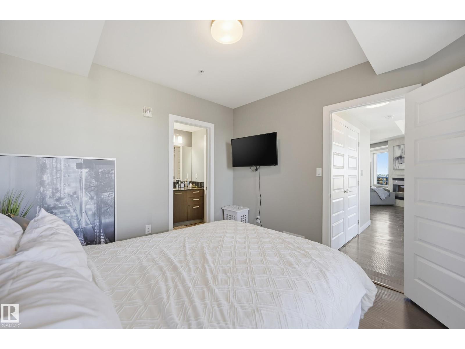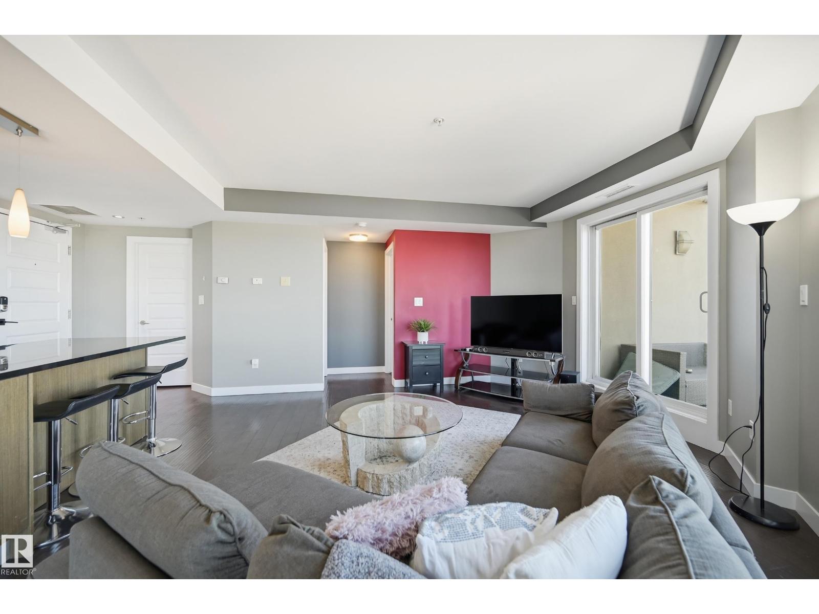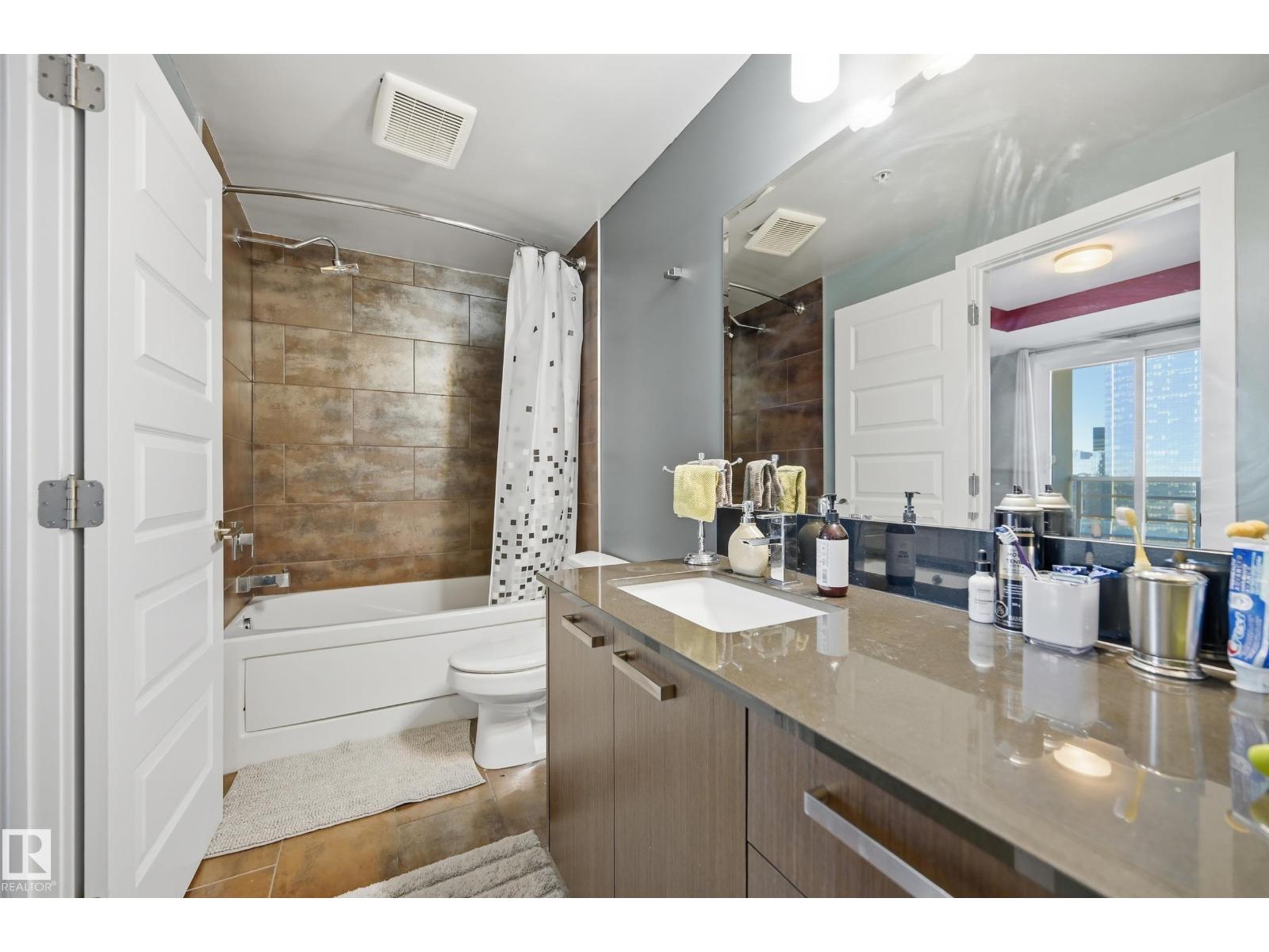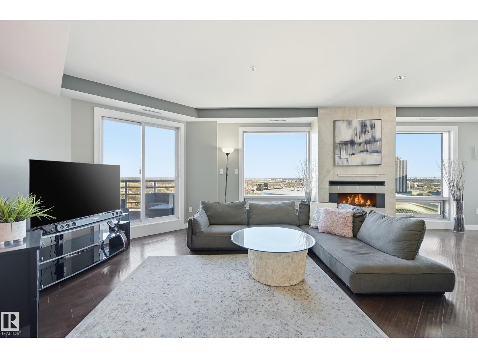 Welcome to this rare sub-penthouse in the heart of downtown, just steps from the Ice District. Offering over 1,150 SQFT of upscale living, this unit features one of the best views in the building—directly facing Rogers Place. The bright, open layout welcomes you with floor-to-ceiling light and a seamless flow throughout. The kitchen is equipped with stainless steel appliances and a large granite island, perfect for entertaining or everyday cooking. Step out onto your wraparound balcony and enjoy incredible sunlight and city views. The spacious primary bedroom includes its own private balcony, full ensuite, and a generous walk-in closet. In addition to two bedrooms, there’s a well-sized den/office filled with natural light—ideal for working from home. A rare opportunity in an unbeatable location! (id:63190)