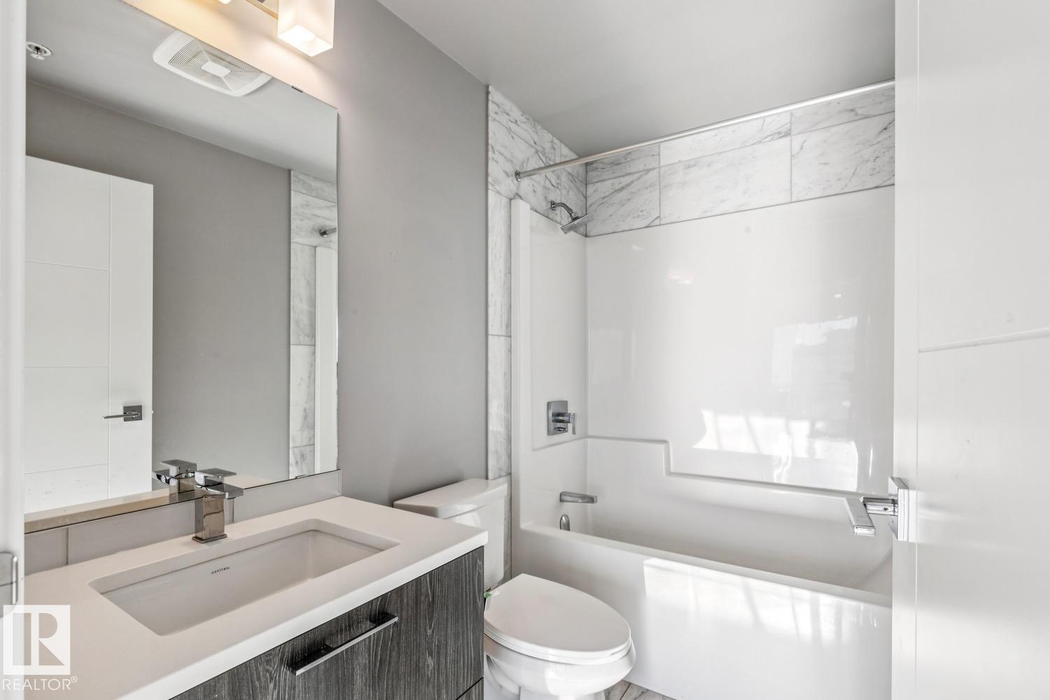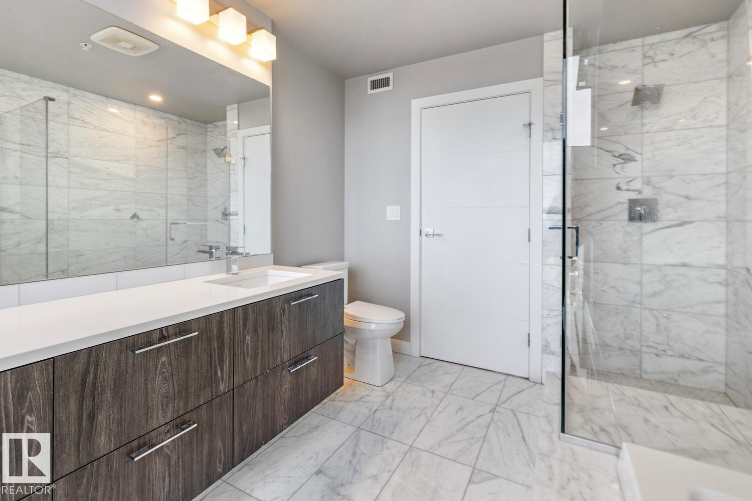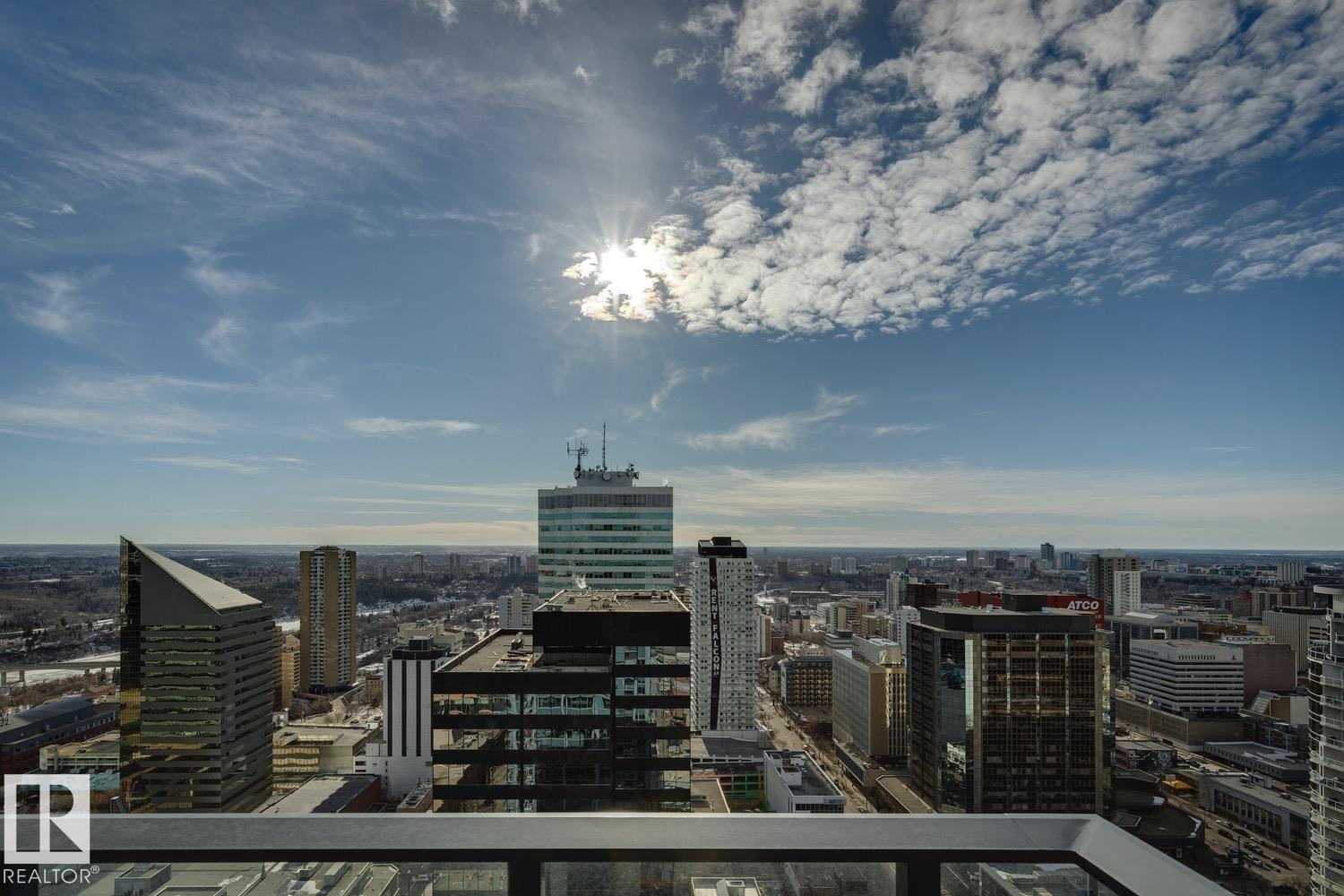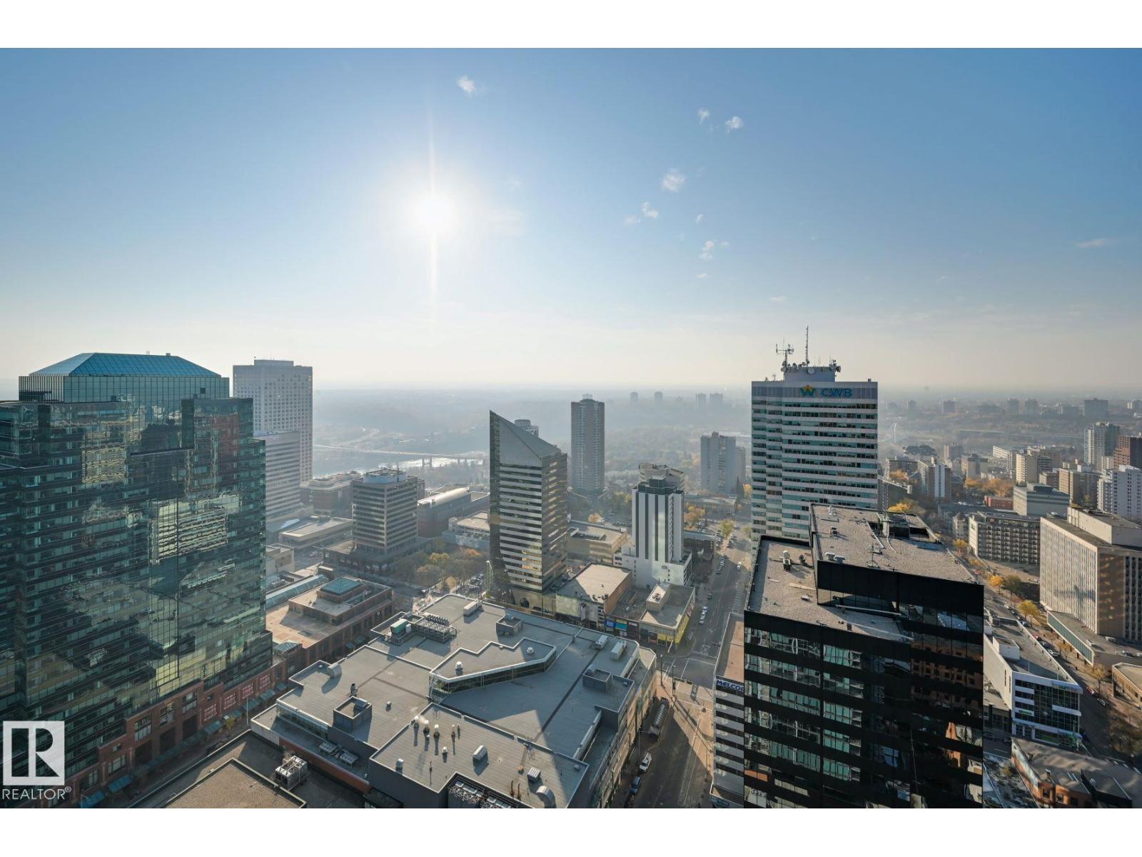 Too many upgrades to mention!! Welcome to Suite #3300 @ Encore Tower, an amazing 2 Bedroom, 2 Full Bath that is located on the ENTIRE SOUTH WALL of the Tower! This property offers some of the best city and rivervalley views that Edmonton has to offer! Suite upgrades include; Carrara Marble throughout: a fireplace feature wall, tile surfaces in both bathrooms, and front entry tile, as well as engineered glue-down hardwood floors. The unit offers a 100ft+ span of floor-to ceiling windows, with window coverings. Modern design includes a stylish kitchen with full-size stainless steel appliances, quartz countertops, a spacious island with seating, 9-foot ceilings* and in-suite laundry (full-size). Life at Encore includes many conveniences - friendly concierge, an inviting party-room, 4th floor sundeck and a private fitness room. Steps from ICE District, numerous dining choices, and an al fresco market?... Do not miss this opportunity at the city's ultimate central location, and best new-construction value! (id:63190)