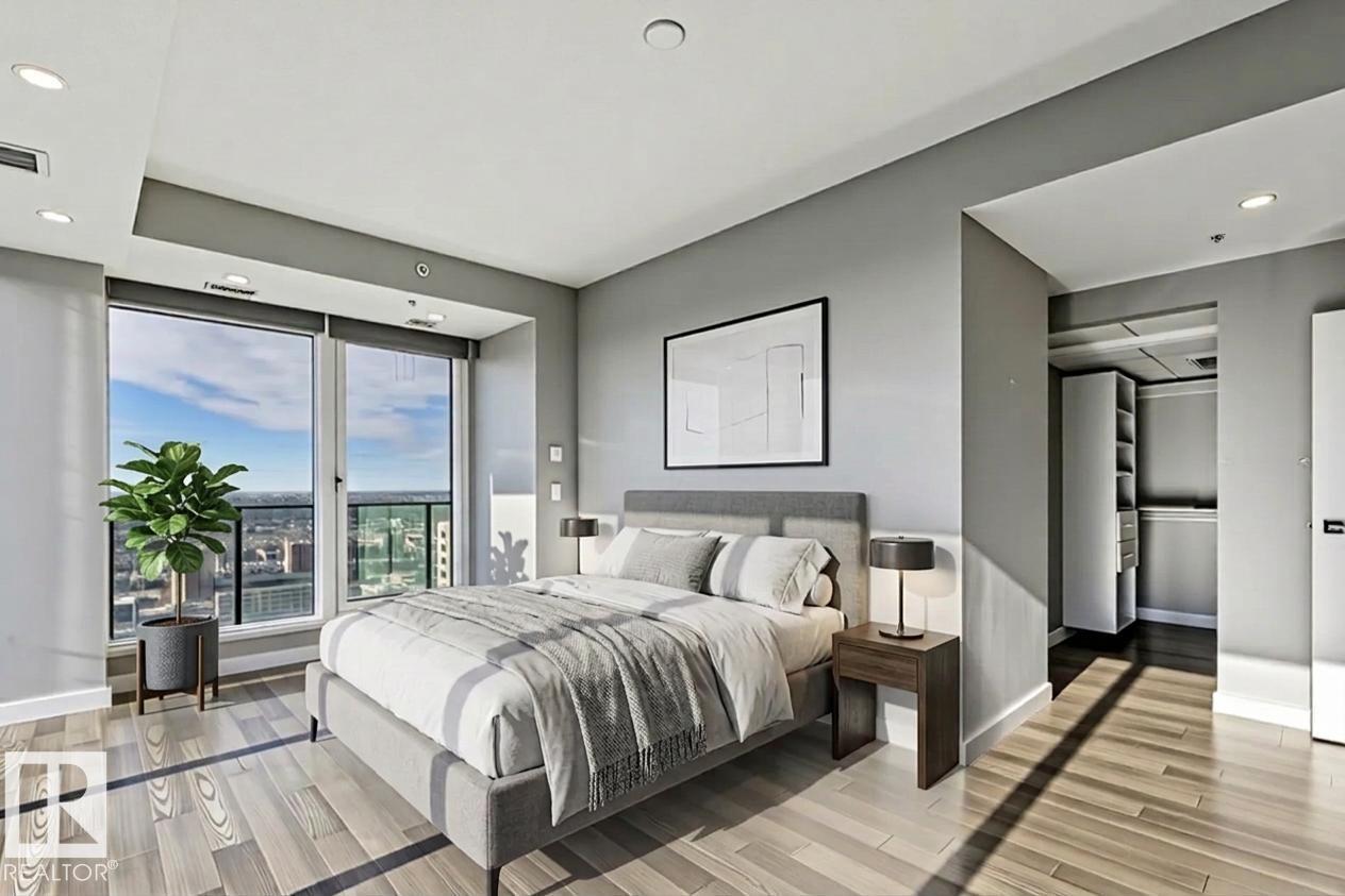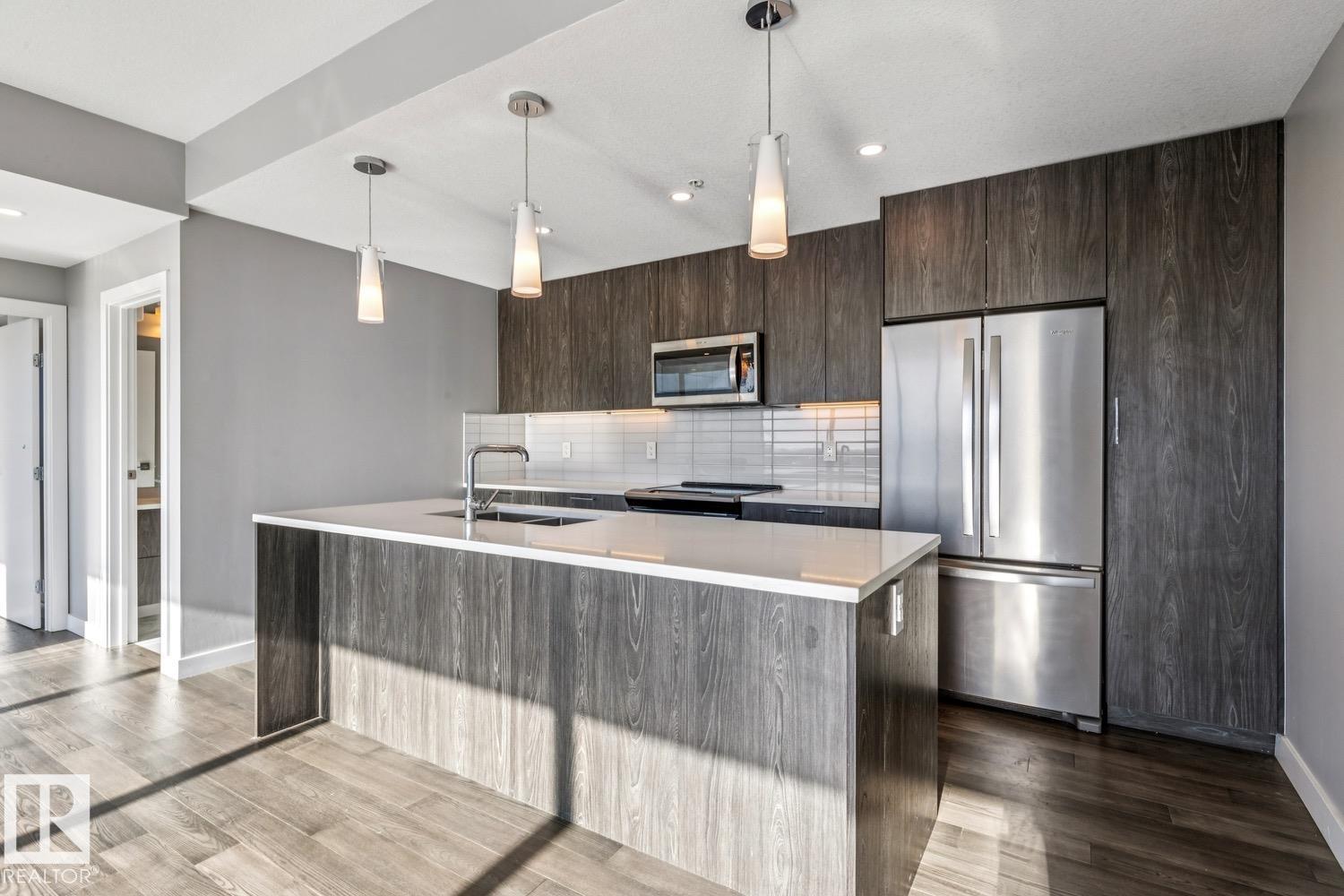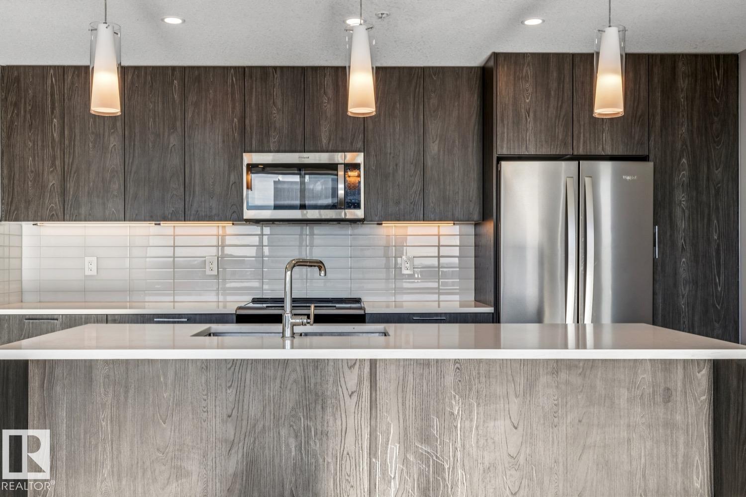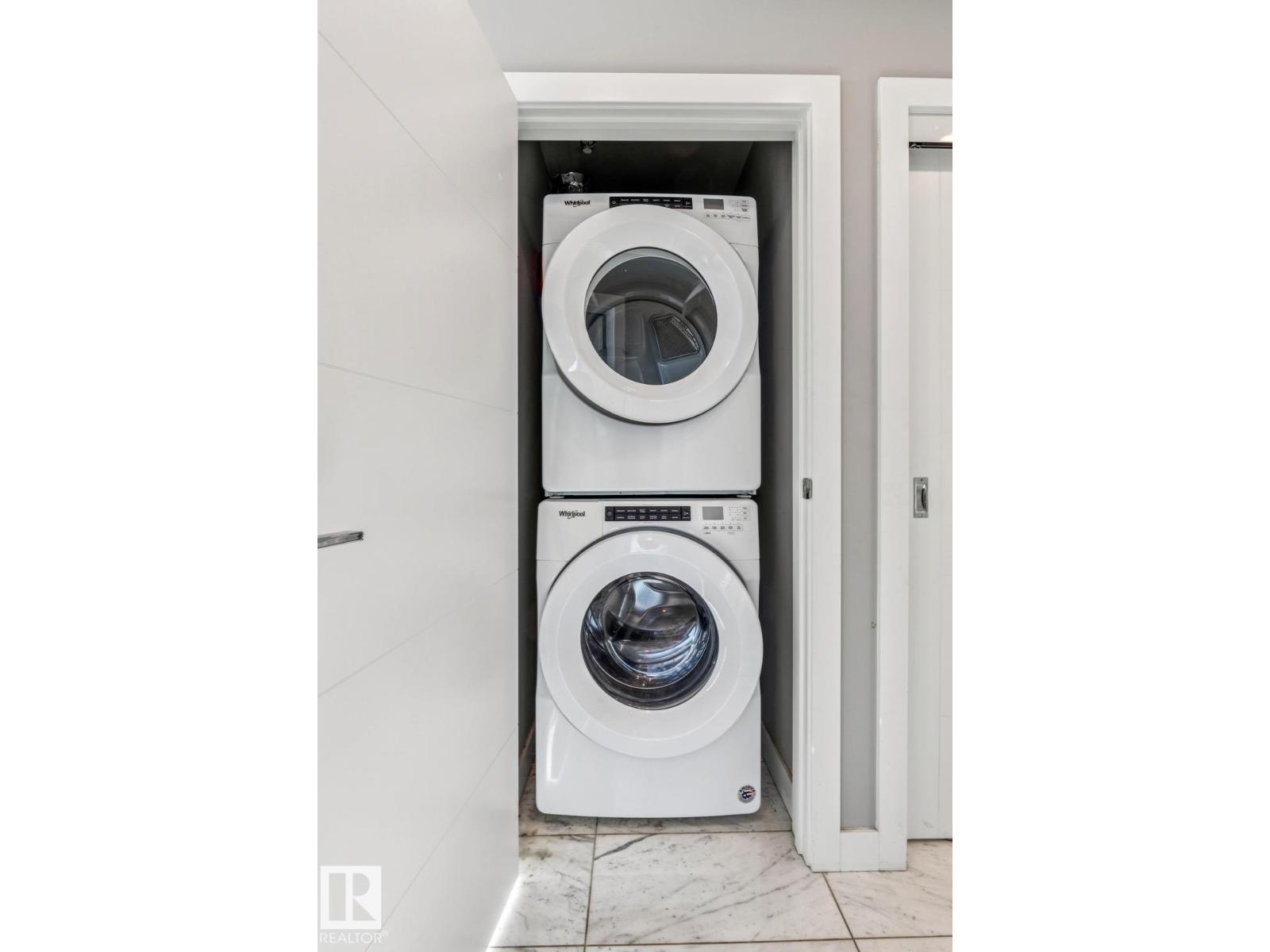 Too many upgrades to mention!! Welcome to Suite #3300 @ Encore Tower, an amazing 2 Bedroom, 2 Full Bath that is located on the ENTIRE SOUTH WALL of the Tower! This property offers some of the best city and rivervalley views that Edmonton has to offer! Suite upgrades include; Carrara Marble throughout: a fireplace feature wall, tile surfaces in both bathrooms, and front entry tile, as well as engineered glue-down hardwood floors. The unit offers a 100ft+ span of floor-to ceiling windows, with window coverings. Modern design includes a stylish kitchen with full-size stainless steel appliances, quartz countertops, a spacious island with seating, 9-foot ceilings* and in-suite laundry (full-size). Life at Encore includes many conveniences - friendly concierge, an inviting party-room, 4th floor sundeck and a private fitness room. Steps from ICE District, numerous dining choices, and an al fresco market?... Do not miss this opportunity at the city's ultimate central location, and best new-construction value! (id:63190)