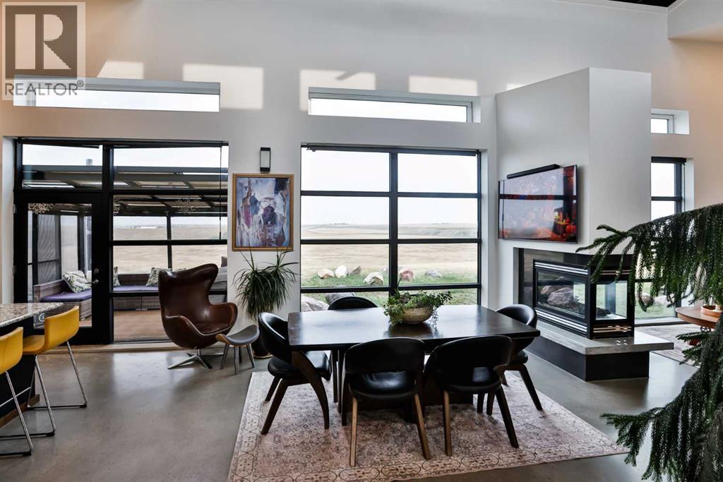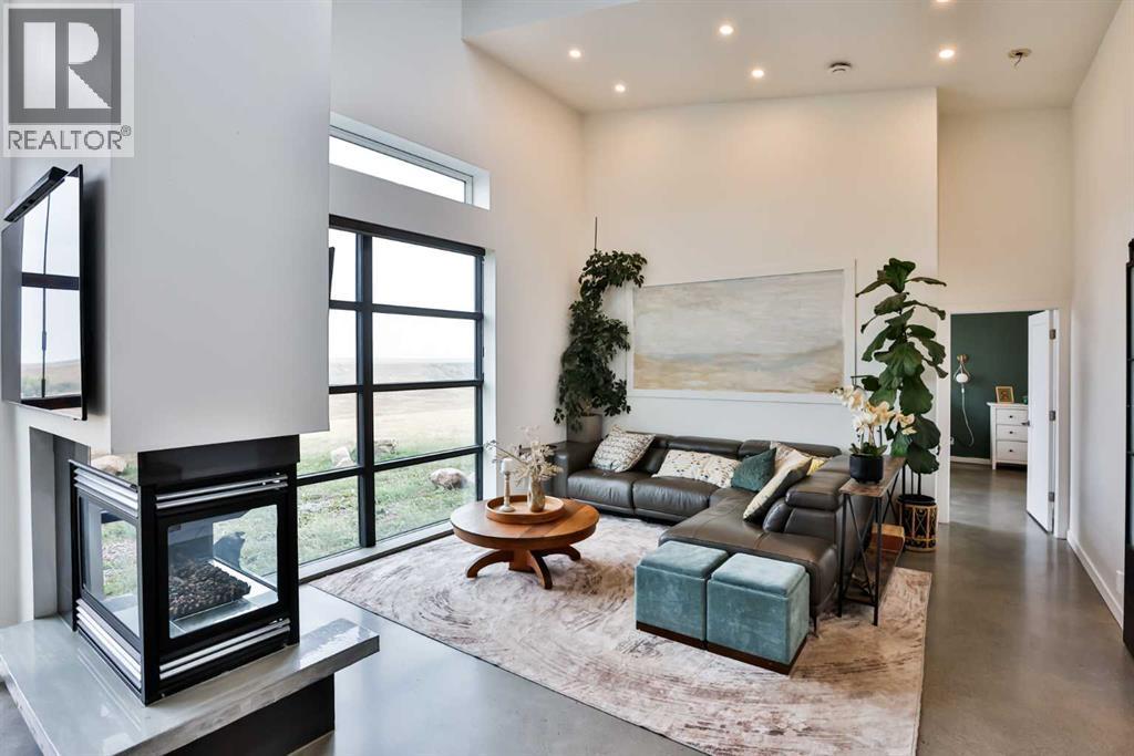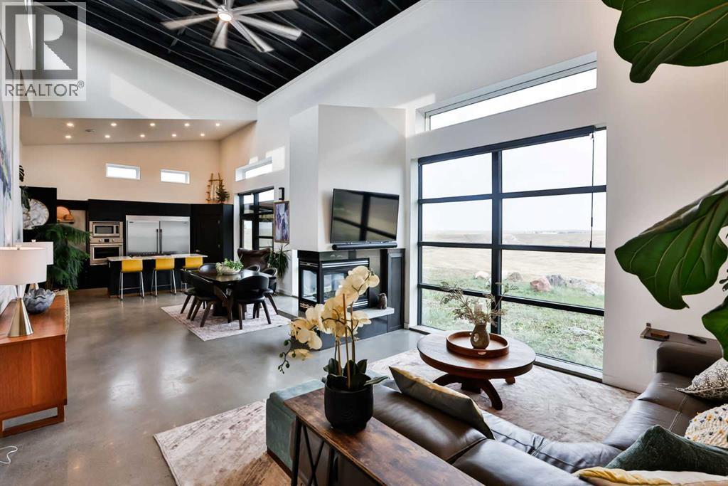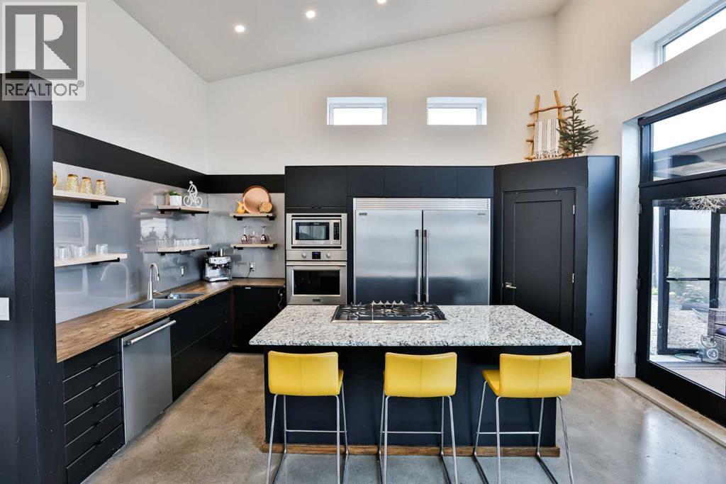 Welcome to 309 Alta Vista Blvd., a modern ranch-style oasis perfectly situated on 13.49 picturesque acres in Carmangay, Alberta. Backing onto the serene Coulee and the soothing flow of Little Bow River, this property offers the intimate charm of small-town living with all the comforts of modern design—only 40 minutes from Lethbridge and 15 minutes from Vulcan.Built in 2018, the slightly over 1,700 ft² bungalow marries contemporary style with top-tier construction. The home features durable ICF block walls paired with Lux triple pane windows and spray foam insulation, ensuring energy efficiency and year-round comfort. Enjoy the luxury of in-floor heating and a state-of-the-art HRV system that circulates fresh air throughout the residence. An on-demand hot water system and 200 amp service. Step inside to discover a modern aesthetic defined by concrete floors, a shed roof vault design with additional transom windows, and a striking three-sided fireplace that creates a captivating focal point in the living area. The expansive kitchen is designed for the modern chef, boasting a built-in fridge & freezer, wall oven & microwave, five-burner gas cooktop, butcher block countertops, granite counters, stainless steel backsplash, and a convenient corner pantry—perfect for gourmet gatherings and everyday meal prep.The soaring ceilings flow gracefully into the primary bedroom, a tranquil retreat with awe-inspiring views of the coulee. Elegant barn doors separate the spacious closets, the ensuite has double sinks, a large tiled shower and a thoughtfully placed window flood the space with natural light. Two additional bedrooms, divided by a stylish black metal and glass barn door, share a full bathroom featuring a generous five-foot tile shower, ensuring ample space for family or guests. Practicality meets design with abundant built-in storage right from the welcoming entrance, complemented by a laundry room and a discreet mechanical room tucked behind the kitchen. For those loo king to harness the beauty of nature, the property offers access to the river. All the conveniences of modern town living are at your fingertips with in-town water. Outside, enjoy low maintenance yet eye-catching curb appeal. The exterior is finished in dark, rich colours accented with textured steel details. A detached triple-car garage spans an impressive 32 feet wide by 24 feet deep, featuring three overhead doors—one operated remotely—for all your storage and vehicle needs. Between the home and garage, a specially protected area hosts a hot tub, windscreen, and fire pit area, creating an ideal outdoor retreat.The natural landscaping around the house artfully blends with the surrounding coulees. Larger decorative shrubs add captivating texture while maintaining a seamless connection to the land, making this property a perfect sanctuary for those who appreciate modern comforts amid rustic beauty. (id:63190)