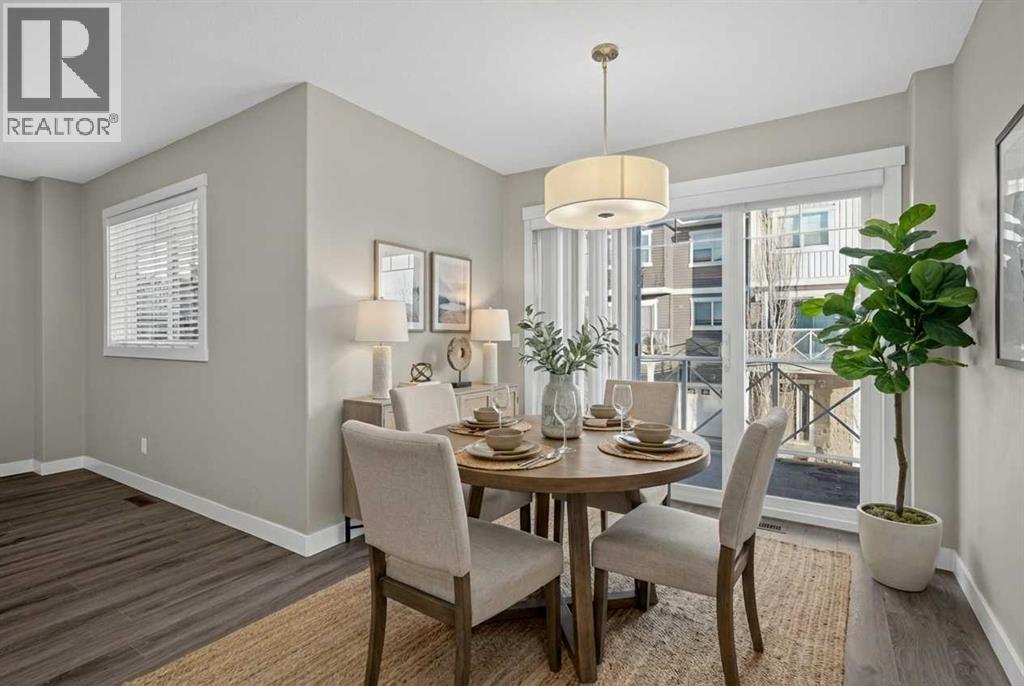 Welcome to Skyview Ranch Grove — a beautifully maintained multi-level townhouse offering modern finishes, smart design, and comfortable everyday living. From the moment you step inside, you’ll notice the pride of ownership and lightly lived-in condition that gives this home the feel of a new build. Contemporary cabinetry, quality flooring, and sleek countertops create a clean, modern aesthetic that’s both stylish and practical. The main living level is thoughtfully designed with an open-concept layout where the living room, dining area, and kitchen flow seamlessly together. High ceilings enhance the sense of space and allow natural light to move freely throughout. Whether you're entertaining guests or enjoying a quiet evening at home, the layout keeps everyone connected while still feeling spacious and comfortable. The kitchen is generously sized and highly functional, offering ample counter space, modern cabinetry, and excellent ventilation. It’s designed for real life — easy meal prep, everyday organization, and effortless hosting. A built-in Heat Recovery Ventilator (HRV) improves air quality and energy efficiency year-round. Upstairs, you’ll find two well-sized bedrooms that provide flexibility for a variety of needs. The primary bedroom offers a comfortable retreat with plenty of room for a full bedroom set, while the second bedroom works perfectly as a guest room, child’s room, or home office. Two bathrooms help keep daily routines running smoothly. Ideally located near parks, walking paths, K–9 schools including Apostles of Jesus and Prairie Sky School, and major amenities such as CrossIron Mills and the airport, this home offers convenience without sacrificing comfort. Modern, functional, and move-in ready — a perfect fit for first-time buyers, young families, or investors looking for quality in a growing community. (id:63190)