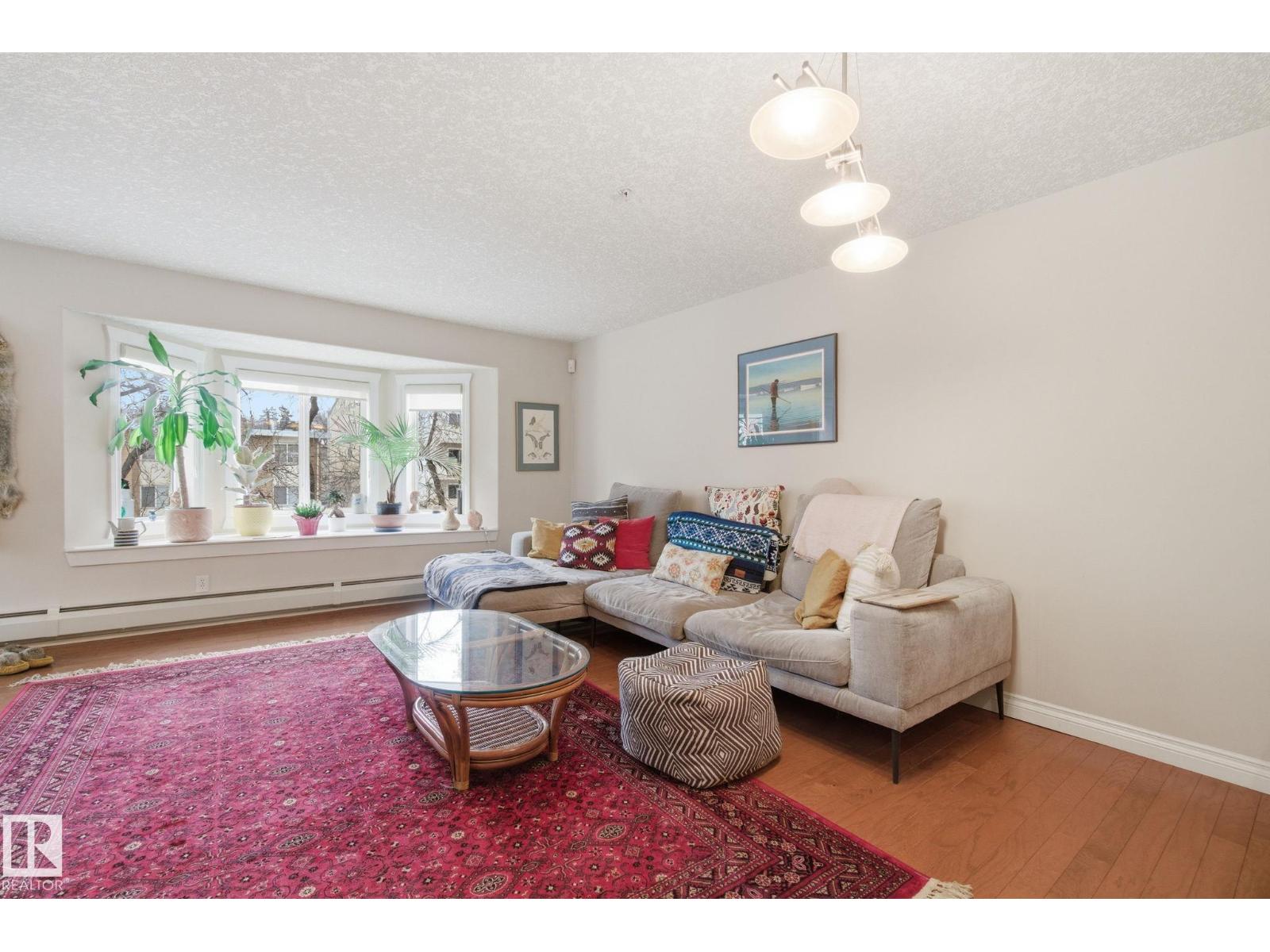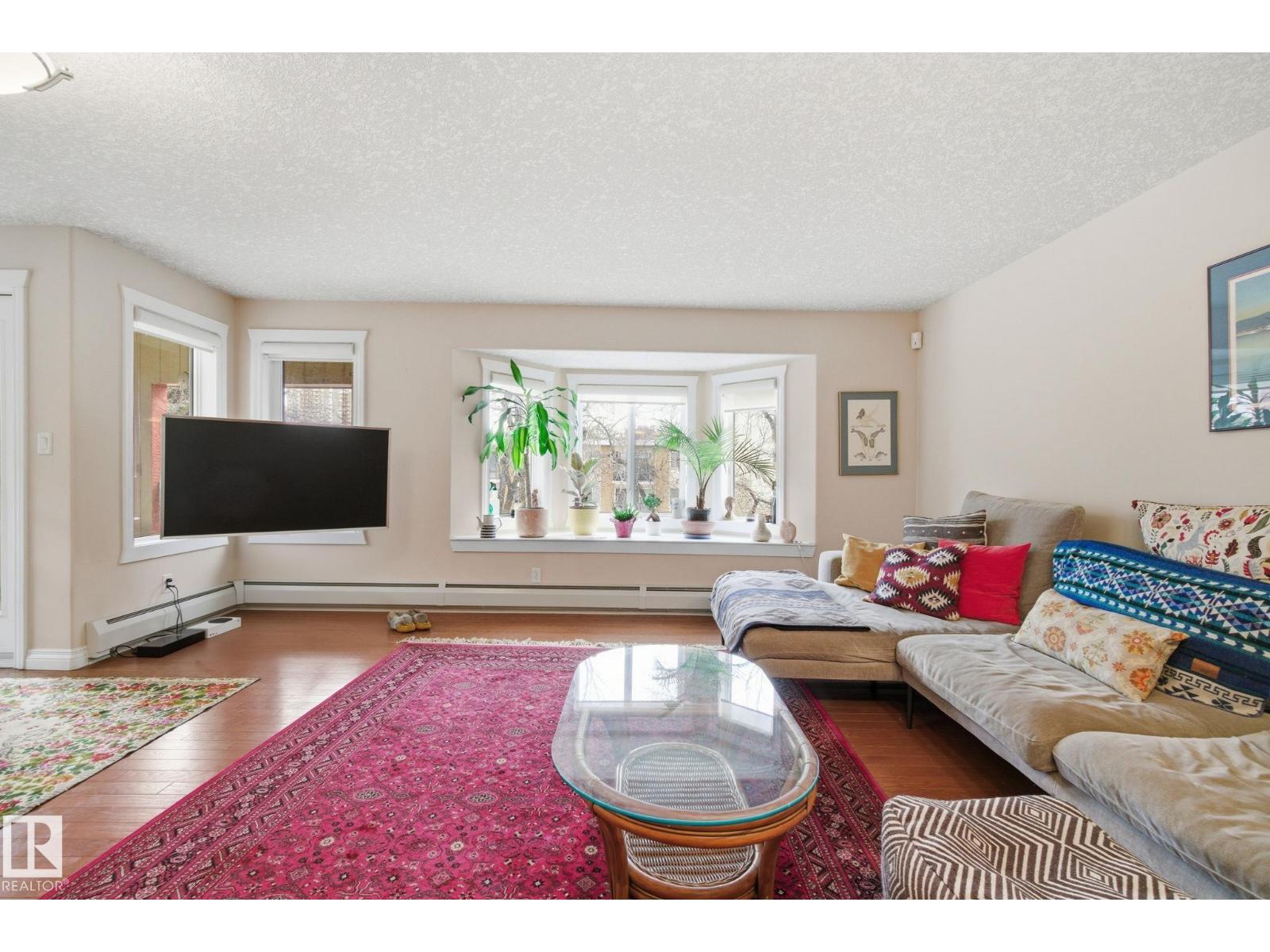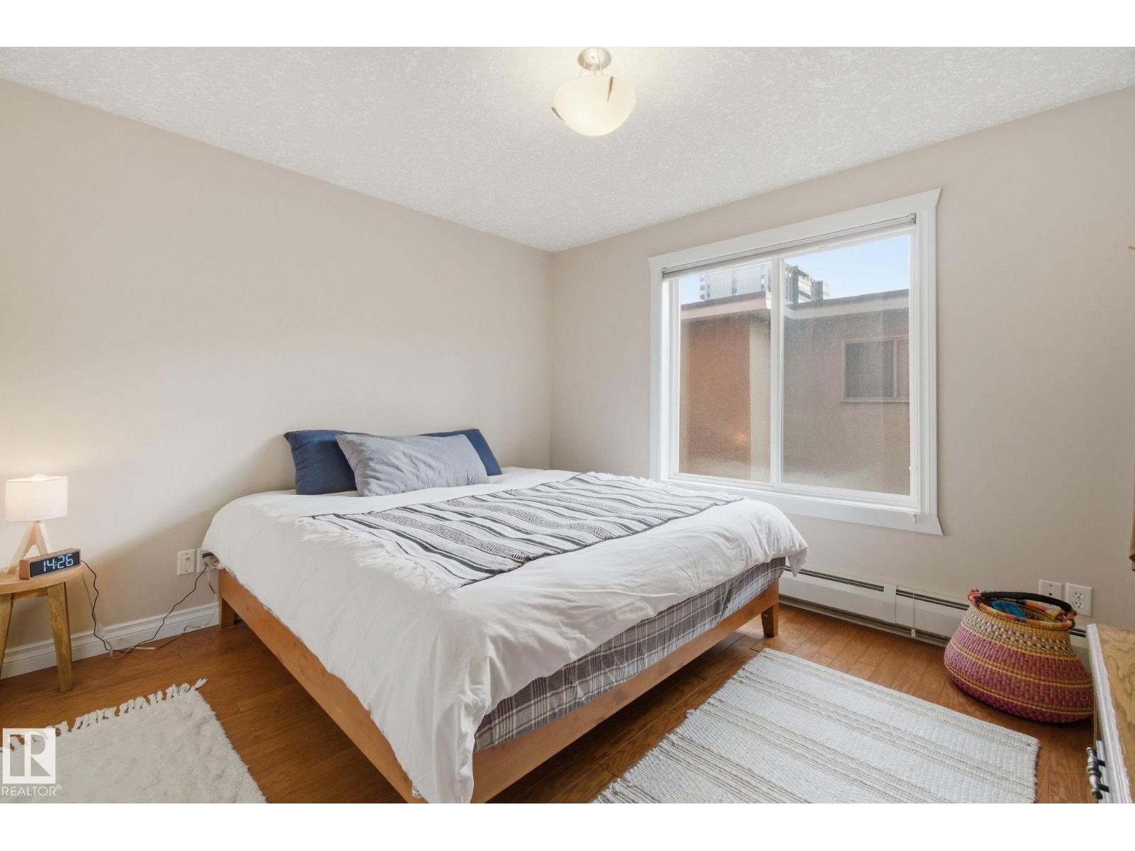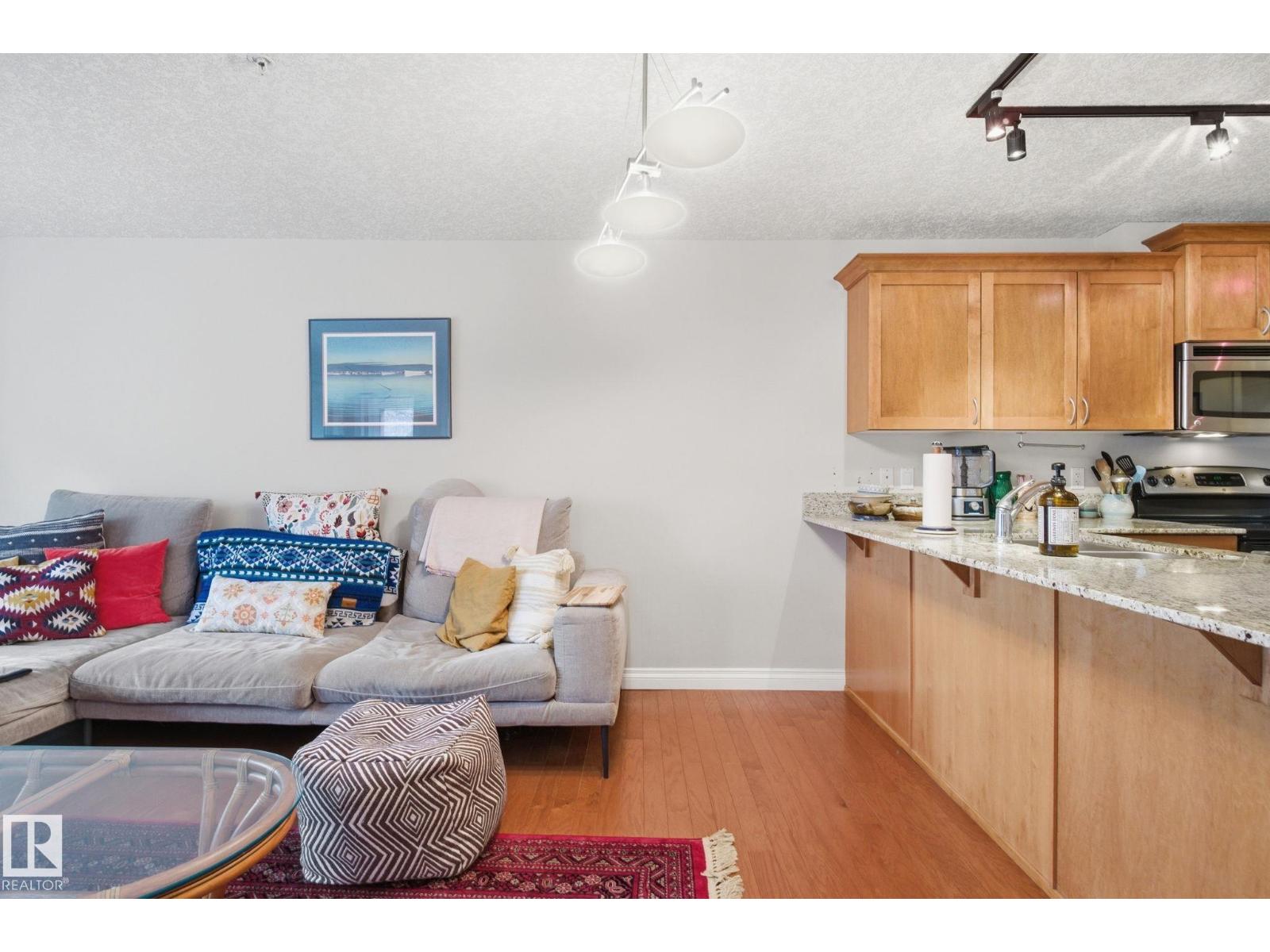 LOCATION, LUXURY & LIFESTYLE in the heart of the Brewery District! This stunning 2-bedroom, 2-bath condo is perfectly located between Jasper Ave & 104 Ave, just steps to the River Valley and minutes to Downtown & Oliver. The open-concept great room features gleaming hardwood floors, large bay windows, and space for dining. The upgraded kitchen offers granite countertops, stainless steel appliances, maple cabinetry, an eat-up bar, and oversized pantry. The bright primary bedroom includes a 4-piece ensuite. Enjoy A/C, in-suite laundry, luxury fixtures, heated underground parking with storage cage, and 2 pets allowed. Step outside to a great-sized private South West balcony overlooking a beautiful treed roadway, perfect for relaxing or entertaining with a gas BBQ outlet. Close to the Ice District, Rogers Place, MacEwan & top restaurants. A must see! (id:63190)