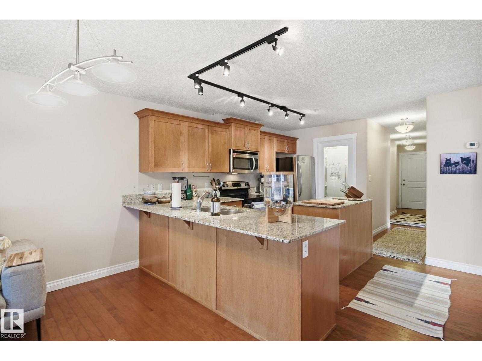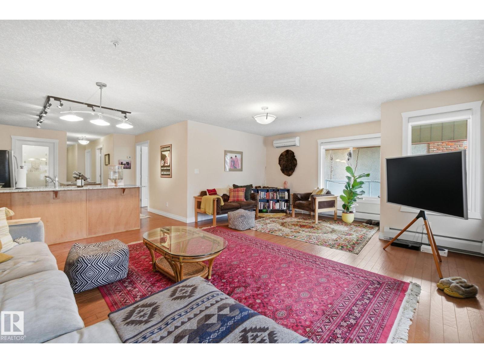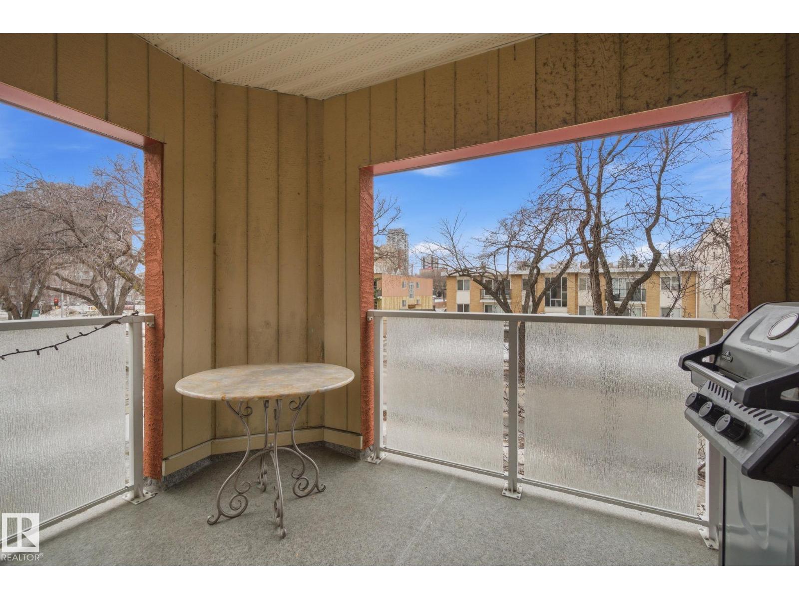LOCATION, LUXURY & LIFESTYLE in the heart of the Brewery District! This stunning 2-bedroom, 2-bath condo is perfectly located between Jasper Ave & 104 Ave, just steps to the River Valley and minutes to Downtown & Oliver. The open-concept great room features gleaming hardwood floors, large bay windows, and space for dining. The upgraded kitchen offers granite countertops, stainless steel appliances, maple cabinetry, an eat-up bar, and oversized pantry. The bright primary bedroom includes a 4-piece ensuite. Enjoy A/C, in-suite laundry, luxury fixtures, heated underground parking with storage cage, and 2 pets allowed. Step outside to a great-sized private South West balcony overlooking a beautiful treed roadway, perfect for relaxing or entertaining with a gas BBQ outlet. Close to the Ice District, Rogers Place, MacEwan & top restaurants. A must see! (id:63190)