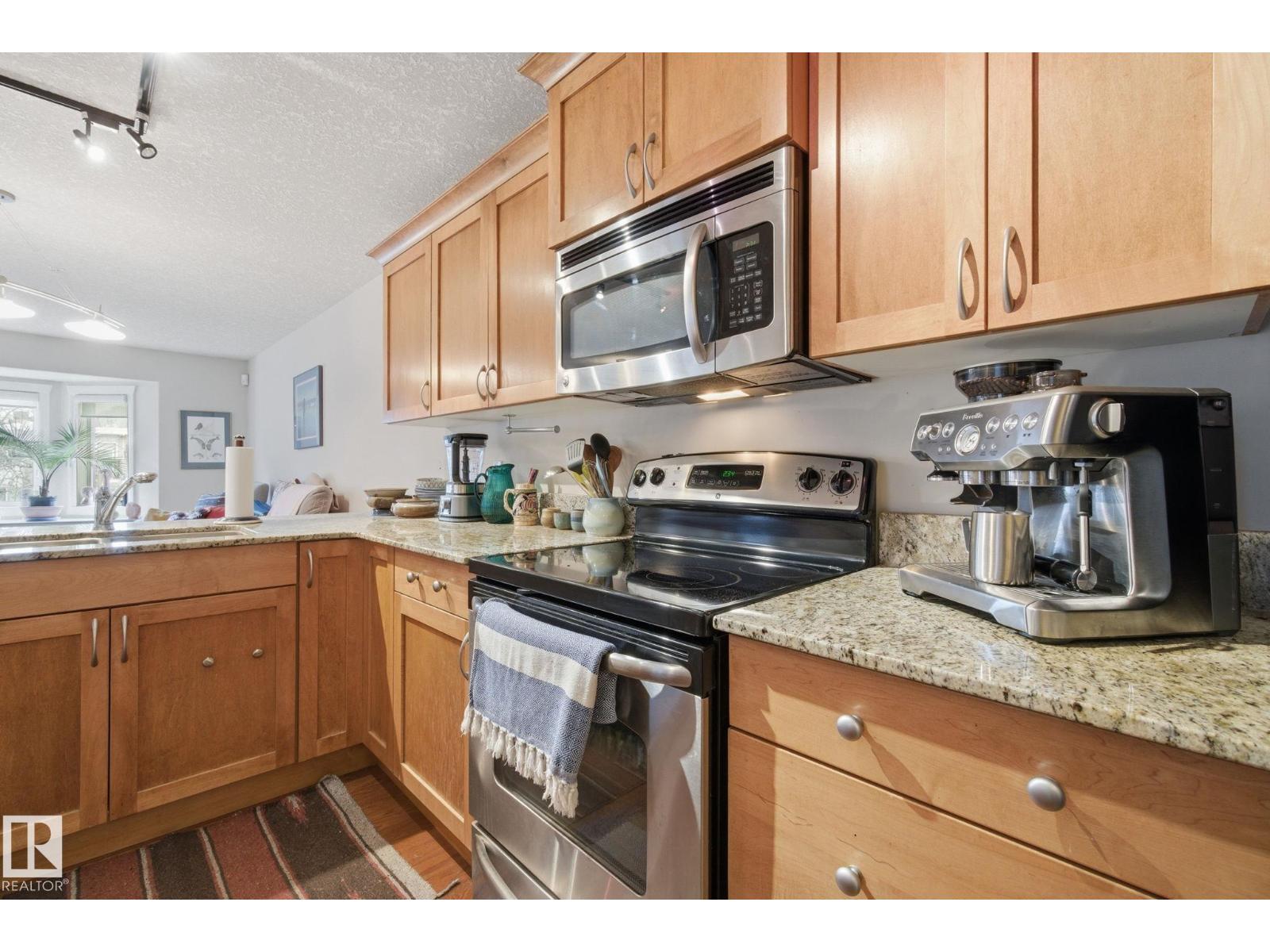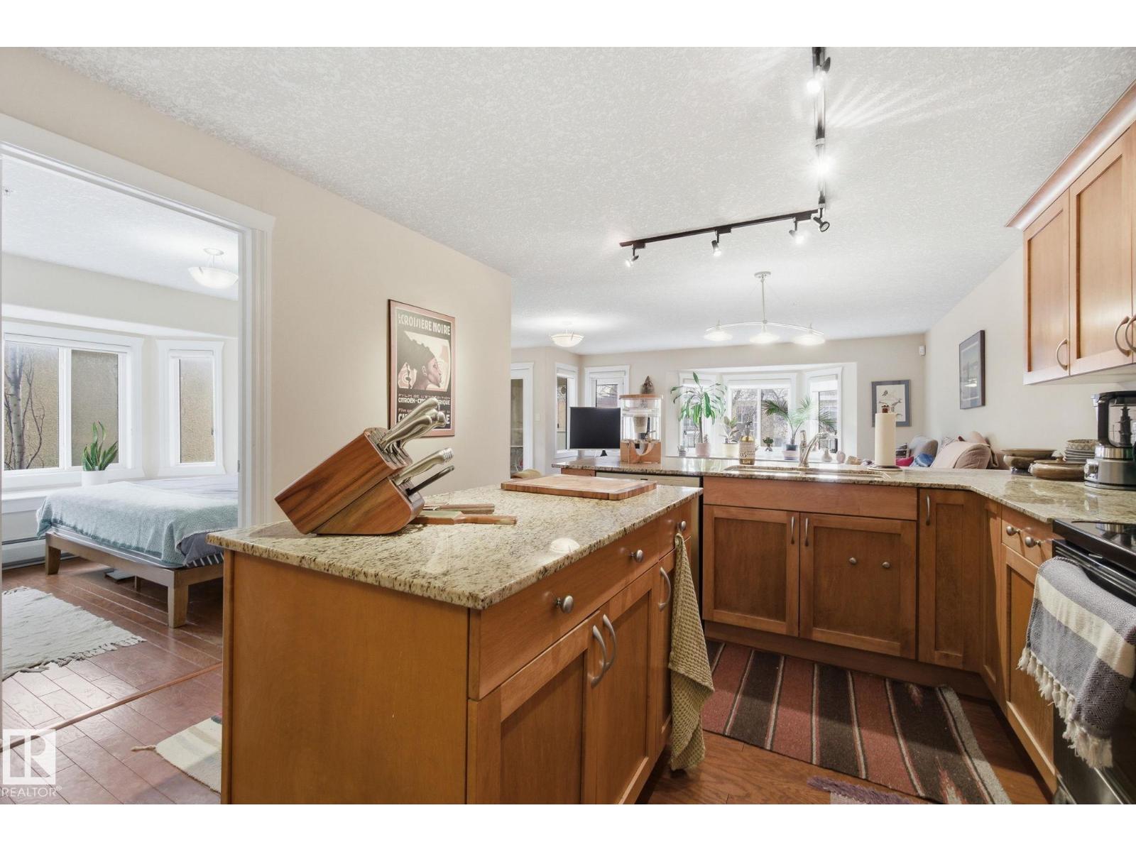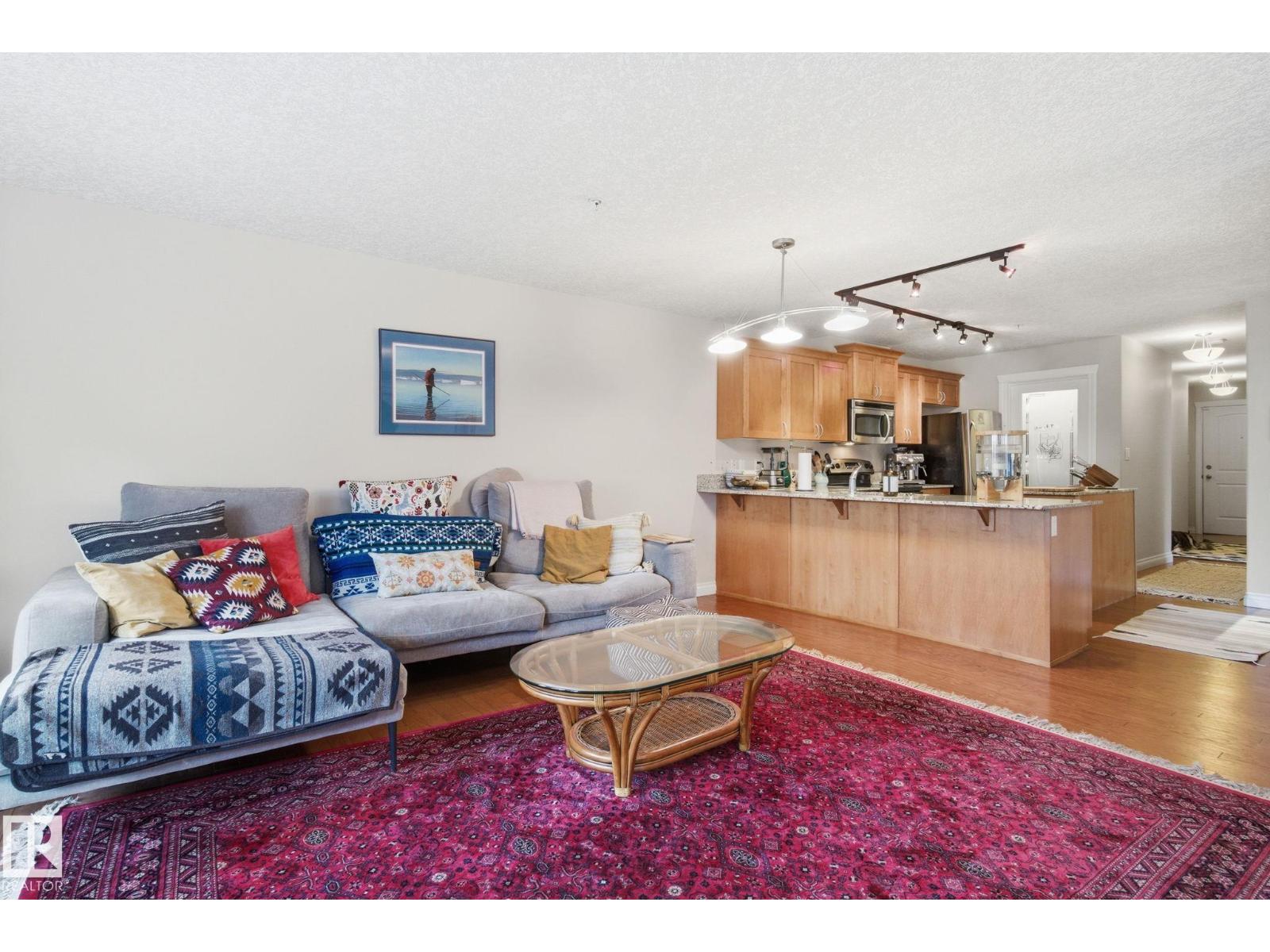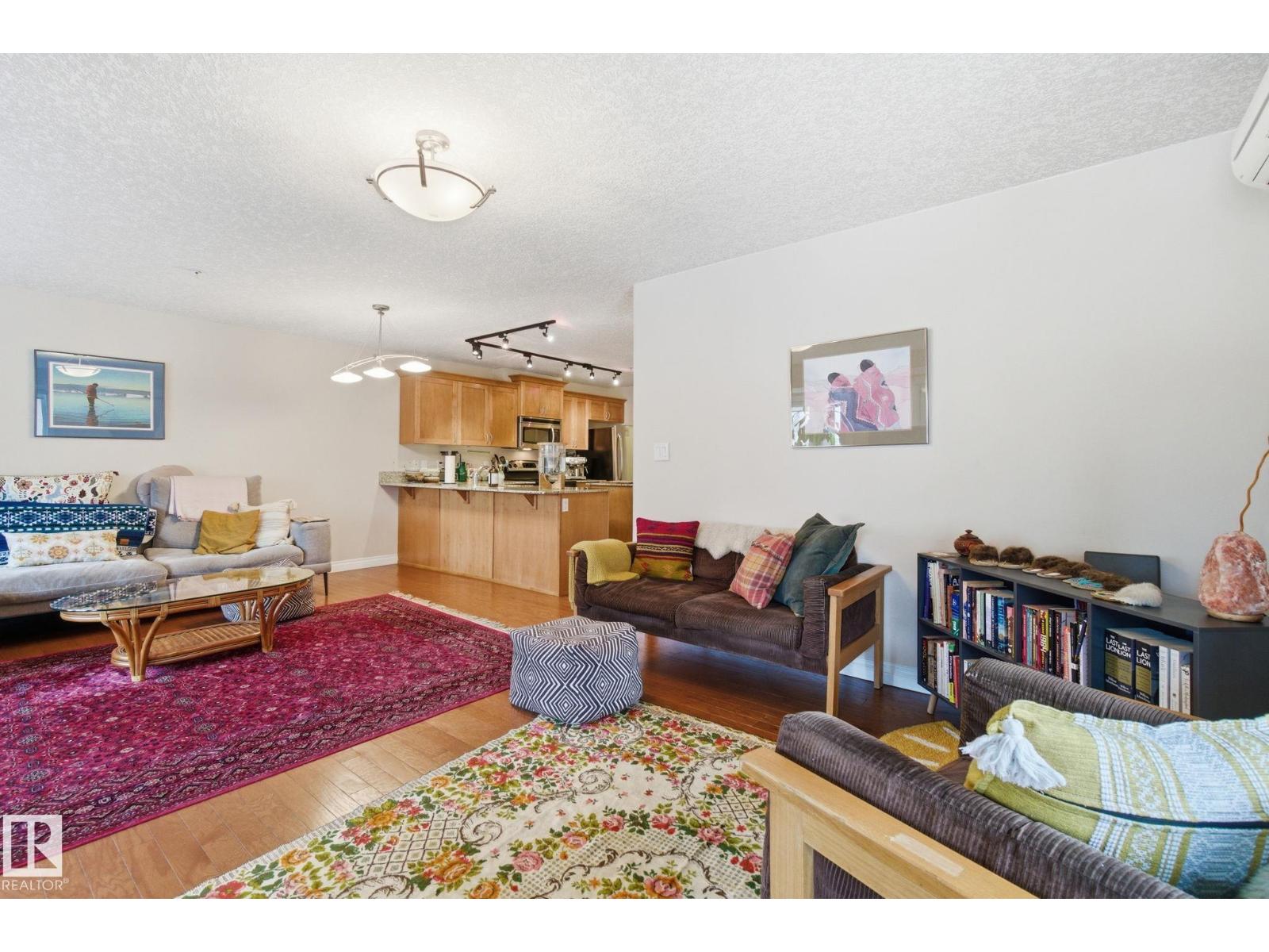 LOCATION, LUXURY & LIFESTYLE in the heart of the Brewery District! This stunning 2-bedroom, 2-bath condo is perfectly located between Jasper Ave & 104 Ave, just steps to the River Valley and minutes to Downtown & Oliver. The open-concept great room features gleaming hardwood floors, large bay windows, and space for dining. The upgraded kitchen offers granite countertops, stainless steel appliances, maple cabinetry, an eat-up bar, and oversized pantry. The bright primary bedroom includes a 4-piece ensuite. Enjoy A/C, in-suite laundry, luxury fixtures, heated underground parking with storage cage, and 2 pets allowed. Step outside to a great-sized private South West balcony overlooking a beautiful treed roadway, perfect for relaxing or entertaining with a gas BBQ outlet. Close to the Ice District, Rogers Place, MacEwan & top restaurants. A must see! (id:63190)