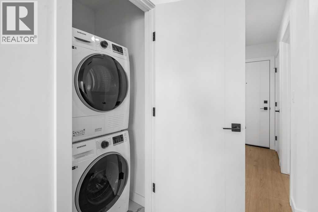 Experience sophisticated urban living at West Plaza. Brand new and never occupied, this beautifully appointed 2 bedroom, 2 bathroom condo features interiors curated by Truman’s award-winning design team.Designed for comfort and style, the home offers a private balcony, air conditioning with a smart Wi-Fi thermostat, premium LVP flooring with acoustic underlay, and roller-shade window coverings throughout. The open-concept layout welcomes you with lofty 9-foot ceilings and brilliant natural light, enhanced by custom contemporary LED fixtures that keep the space bright and airy.The stunning modern kitchen is made to impress, featuring floor-to-ceiling ergonomic cabinetry, polished quartz countertops, deep drawers, a full-height contemporary backsplash, and a gas range—perfect for cooking and entertaining.The primary suite is your private retreat, complete with a spa-inspired ensuite showcasing quartz countertops, a sleek glass-enclosed shower, and environmentally conscious fixtures that elevate the everyday.The main 4-piece bathroom is finished with polished quartz countertops, a modern square-edge tub, and sleek contemporary fixtures for a clean, spa-inspired feel.Additional highlights include in-suite laundry, titled underground parking, and a dedicated storage locker. Residents enjoy premium amenities such as a fully equipped fitness centre and an inviting owners’ lounge, all complemented by a 5-star hotel-style lobby and designer-inspired common areas.Ideally located, you’re just steps from boutique shopping, some of Calgary’s best dining and cafés, and the greenery of Radio Park. ** Some images have been virtually/digitally staged to illustrate possible furnishings and layout. **Some images have been virtually/digitally staged to illustrate possible furnishings and layout. (id:63190)