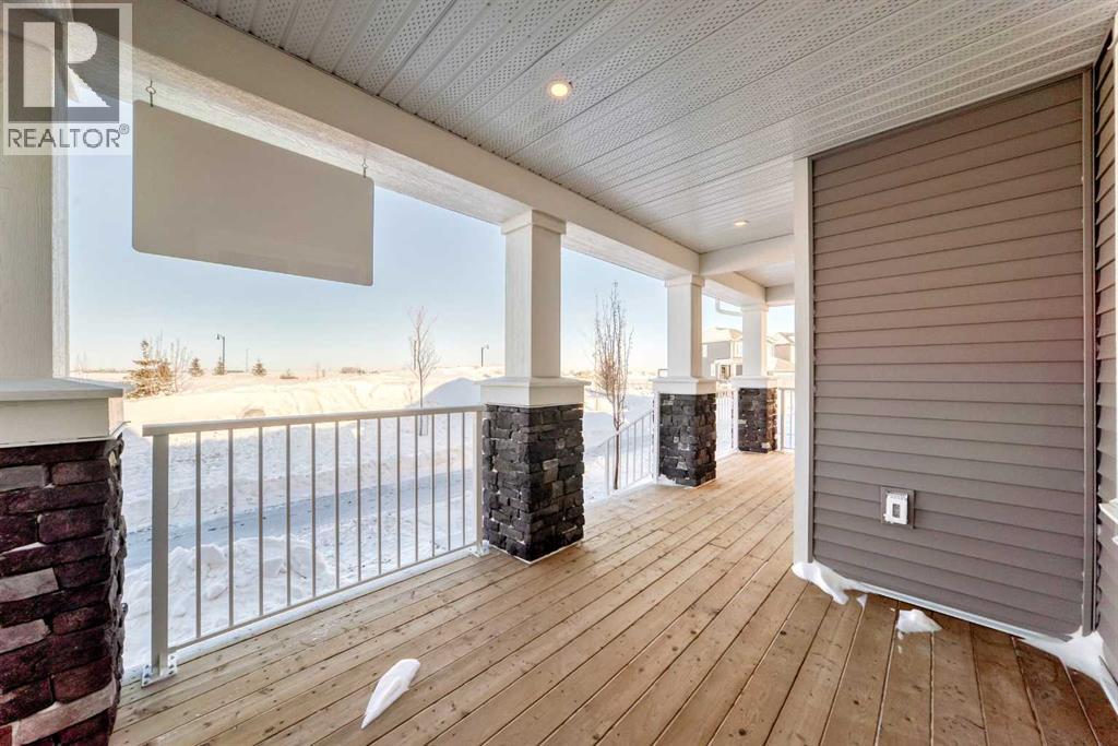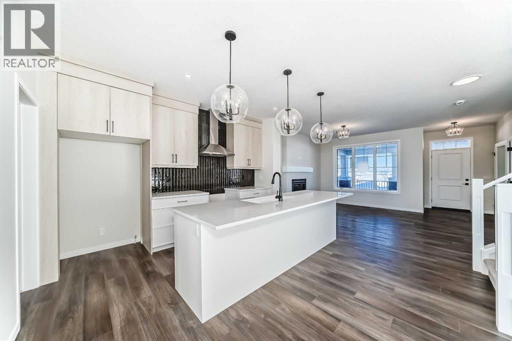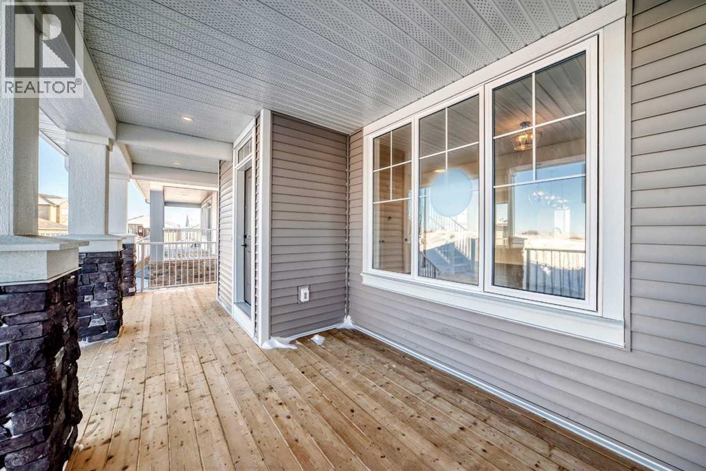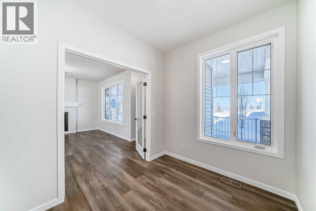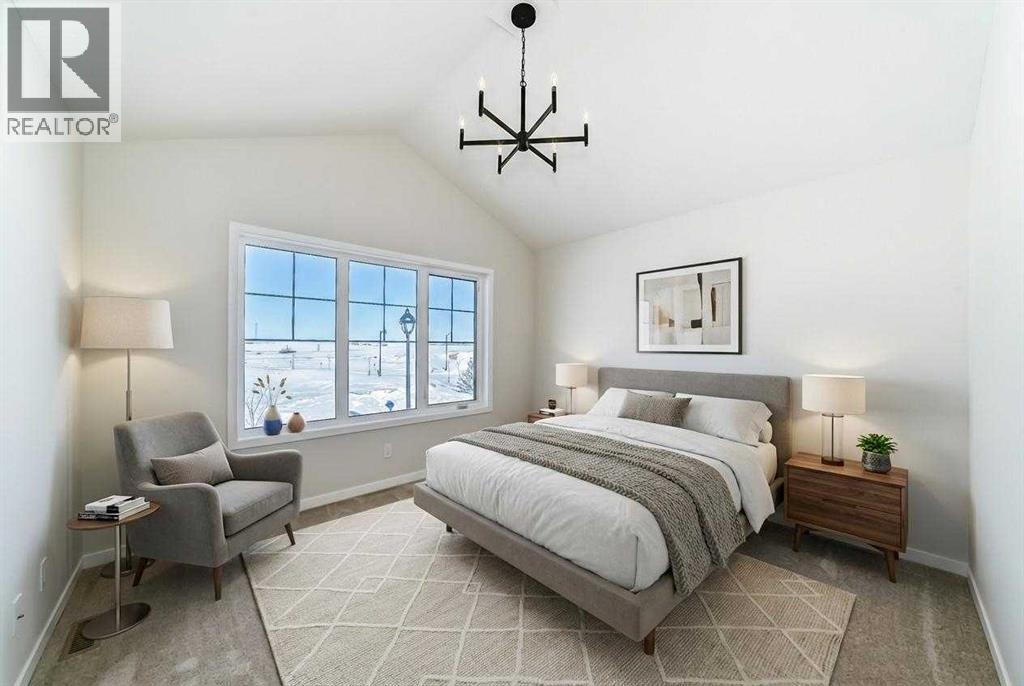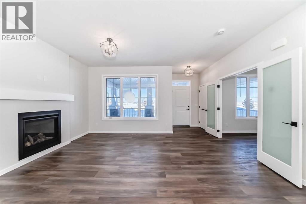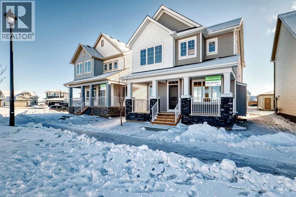 Welcome to the Forrester—a rare, family-friendly porchfront home fronting directly onto the park, paired with a triple detached garage and a driveway/parking setup that can accommodate up to six vehicles. This is the kind of combination that’s almost impossible to find, and it delivers a lifestyle that feels special from the moment you arrive. Start your mornings on the spacious 225 sq ft front porch, coffee in hand, watching the park come to life—perfect for playdates, dog walks, or simply enjoying an open view right outside your front door. Inside, the home is bright and welcoming thanks to large windows at both the front and back, carrying natural light deep throughout the day and every season. The main floor is designed for real life: a generous front living room and a flexible main-floor flex room (office, playroom, craft room—your call) lead into an open-concept layout anchored by a modern galley-style kitchen. You’ll love the elevated finish package here, including two-tone cabinetry, full-height upper cabinets, soft-close doors, quartz countertops, striking black hardware, and an upgraded chimney hood fan with built-in microwave. A large central island makes everyday meals and entertaining easy, while the oversized walk-in “Costco-ready” pantry keeps everything organized. Luxury vinyl plank flooring flows throughout the main level, tying it all together with a clean, contemporary feel. Off the rear entry, the mudroom adds practical function—complete with a private powder room that’s ideal for busy family routines. Cozy evenings are effortless in the open living space with a contemporary gas fireplace (cantilever-style feature), and the home is already set up for outdoor hosting with a gas line for the BBQ. For home chefs, you’ll also appreciate the gas line to the kitchen range—ready for your preferred cooking setup. Upstairs, you’ll find three bedrooms arranged for comfort and privacy, including winged secondary bedrooms that help keep everyone’s space thei r own, plus a convenient upper laundry room. The owner’s suite is a true retreat with no directly shared walls, a dramatic vaulted ceiling, large bright windows overlooking the park-facing front yard, a spacious walk-in closet, and a spa-inspired 5-piece ensuite with a soaker tub and dual vanities. Finishing touches like metal stair railings add to the home’s modern, upscale feel. Outside, the standout continues: a large triple detached garage, plus an exceptional amount of additional parking—whether it’s guests, toys, or a growing household, this is a game-changer. A park-front location, a triple garage, parking for up to six, and a well-curated interior finish package—this Forrester checks boxes that rarely come together in one home. Living in Vista Crossing means enjoying the best of both worlds: the convenience of city living just a short drive from Calgary, paired with the charm and slower pace of small-town life in Crossfield. This thoughtfully planned community fosters a strong sense of belonging. (id:63190)