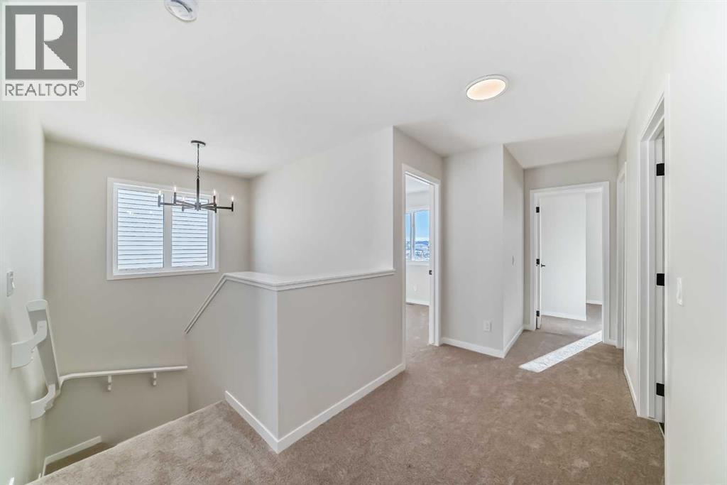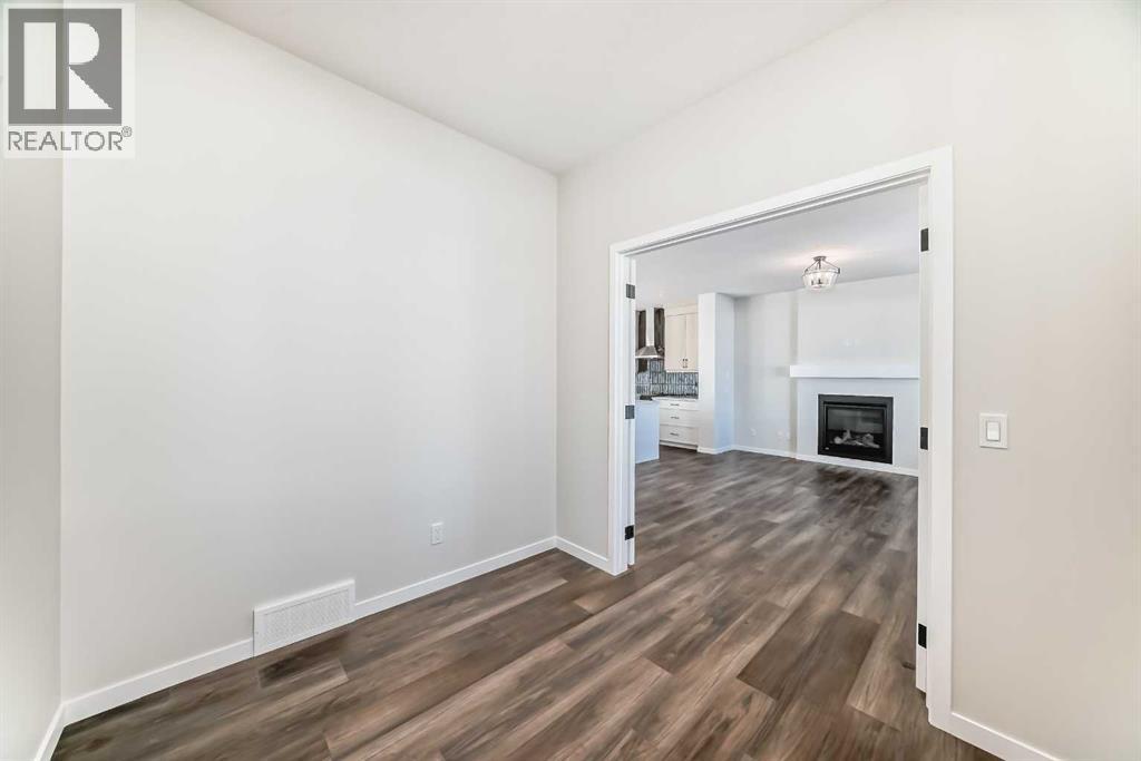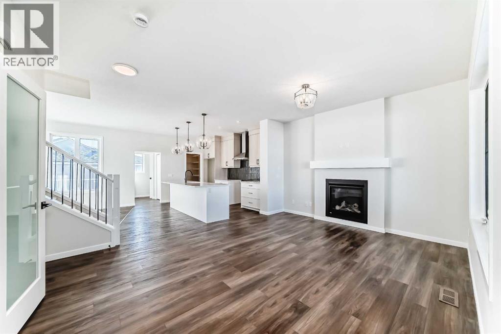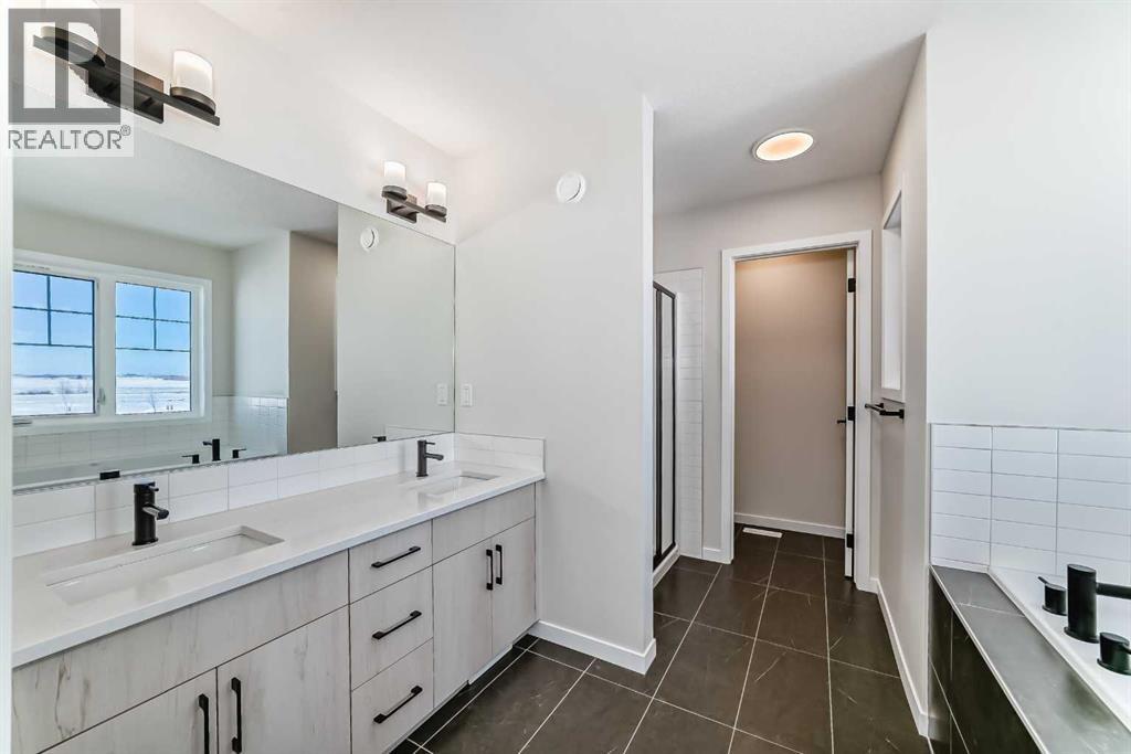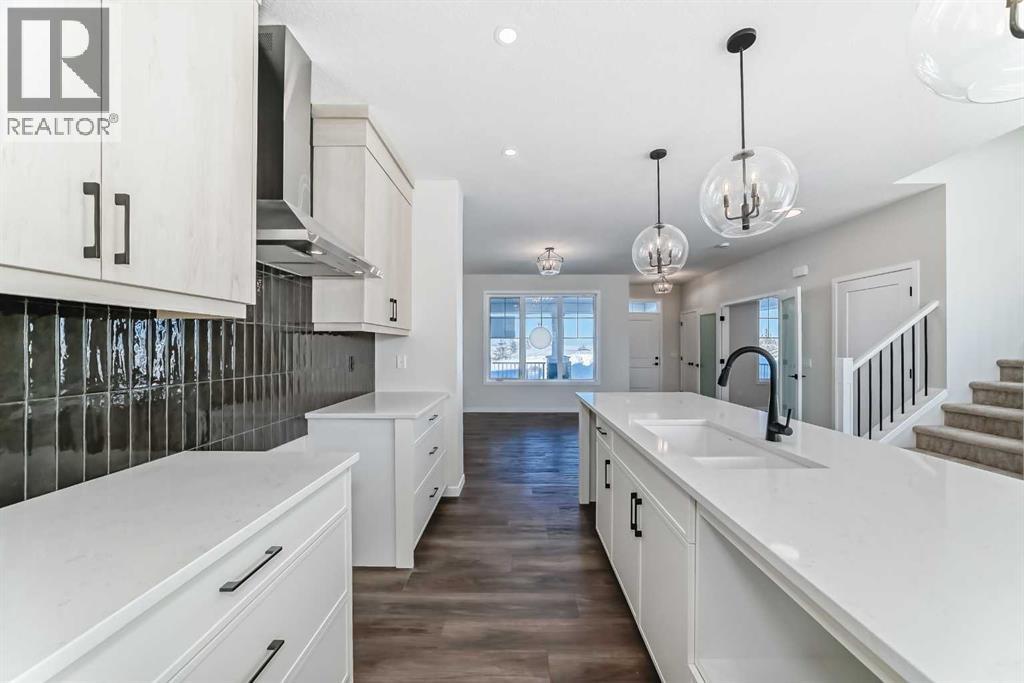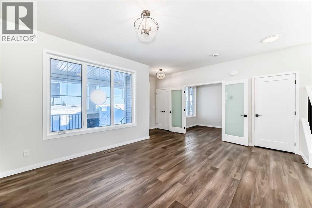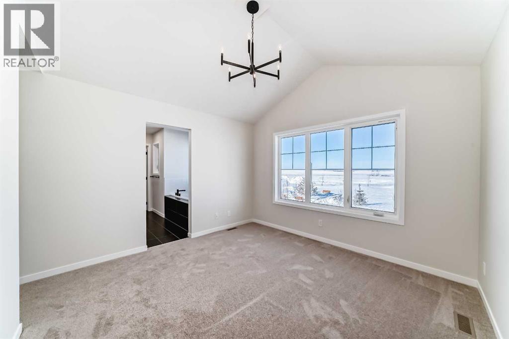 Welcome to the Forrester—a rare, family-friendly porchfront home fronting directly onto the park, paired with a triple detached garage and a driveway/parking setup that can accommodate up to six vehicles. This is the kind of combination that’s almost impossible to find, and it delivers a lifestyle that feels special from the moment you arrive. Start your mornings on the spacious 225 sq ft front porch, coffee in hand, watching the park come to life—perfect for playdates, dog walks, or simply enjoying an open view right outside your front door. Inside, the home is bright and welcoming thanks to large windows at both the front and back, carrying natural light deep throughout the day and every season. The main floor is designed for real life: a generous front living room and a flexible main-floor flex room (office, playroom, craft room—your call) lead into an open-concept layout anchored by a modern galley-style kitchen. You’ll love the elevated finish package here, including two-tone cabinetry, full-height upper cabinets, soft-close doors, quartz countertops, striking black hardware, and an upgraded chimney hood fan with built-in microwave. A large central island makes everyday meals and entertaining easy, while the oversized walk-in “Costco-ready” pantry keeps everything organized. Luxury vinyl plank flooring flows throughout the main level, tying it all together with a clean, contemporary feel. Off the rear entry, the mudroom adds practical function—complete with a private powder room that’s ideal for busy family routines. Cozy evenings are effortless in the open living space with a contemporary gas fireplace (cantilever-style feature), and the home is already set up for outdoor hosting with a gas line for the BBQ. For home chefs, you’ll also appreciate the gas line to the kitchen range—ready for your preferred cooking setup. Upstairs, you’ll find three bedrooms arranged for comfort and privacy, including winged secondary bedrooms that help keep everyone’s space thei r own, plus a convenient upper laundry room. The owner’s suite is a true retreat with no directly shared walls, a dramatic vaulted ceiling, large bright windows overlooking the park-facing front yard, a spacious walk-in closet, and a spa-inspired 5-piece ensuite with a soaker tub and dual vanities. Finishing touches like metal stair railings add to the home’s modern, upscale feel. Outside, the standout continues: a large triple detached garage, plus an exceptional amount of additional parking—whether it’s guests, toys, or a growing household, this is a game-changer. A park-front location, a triple garage, parking for up to six, and a well-curated interior finish package—this Forrester checks boxes that rarely come together in one home. Living in Vista Crossing means enjoying the best of both worlds: the convenience of city living just a short drive from Calgary, paired with the charm and slower pace of small-town life in Crossfield. This thoughtfully planned community fosters a strong sense of belonging. (id:63190)