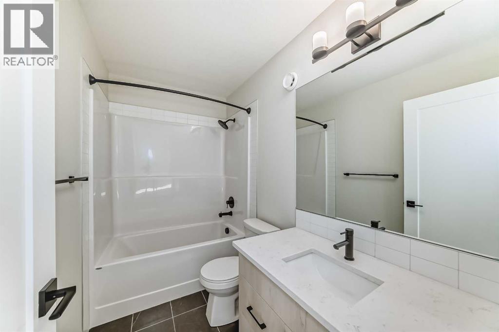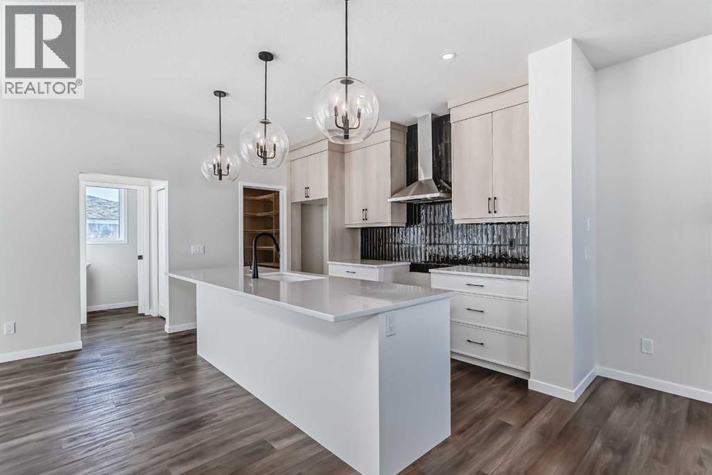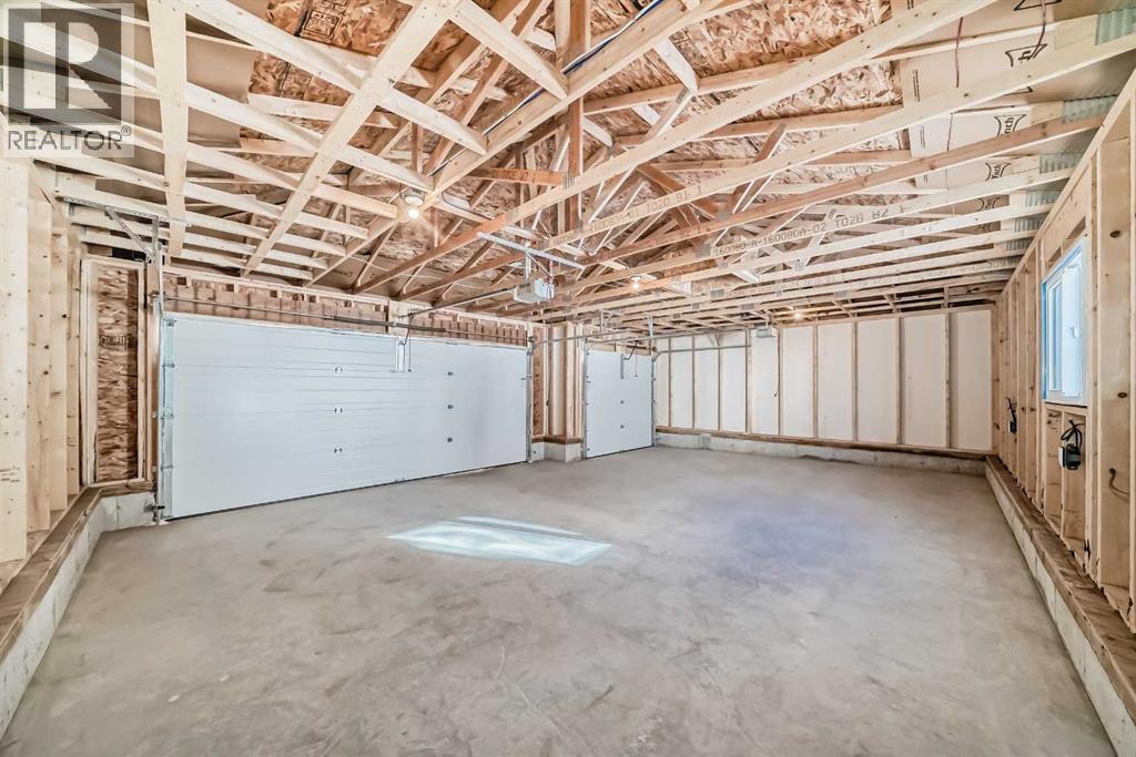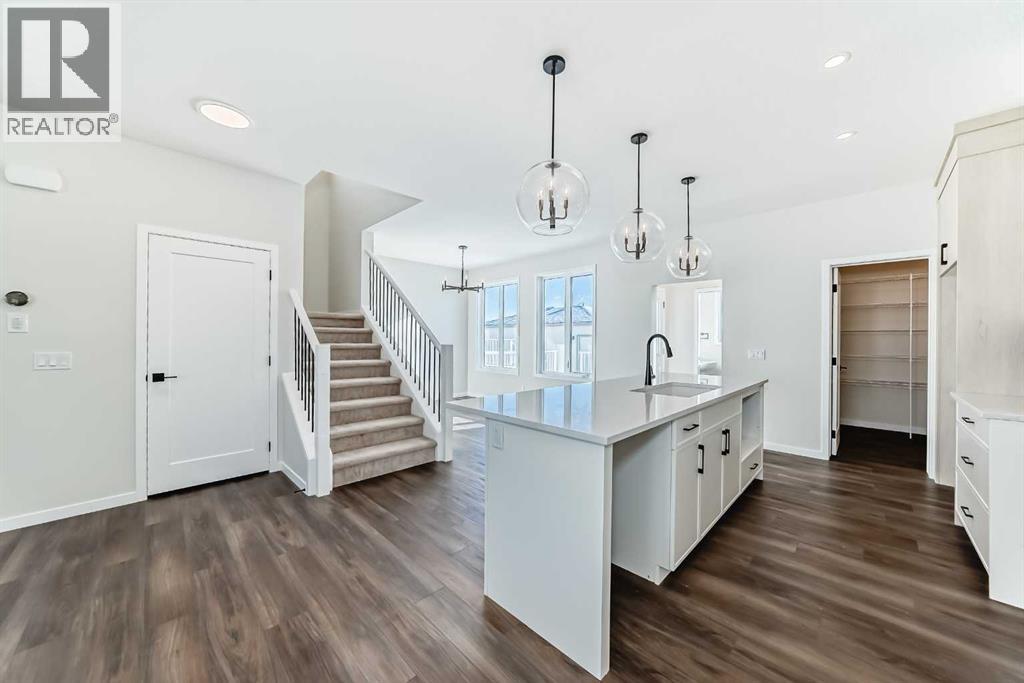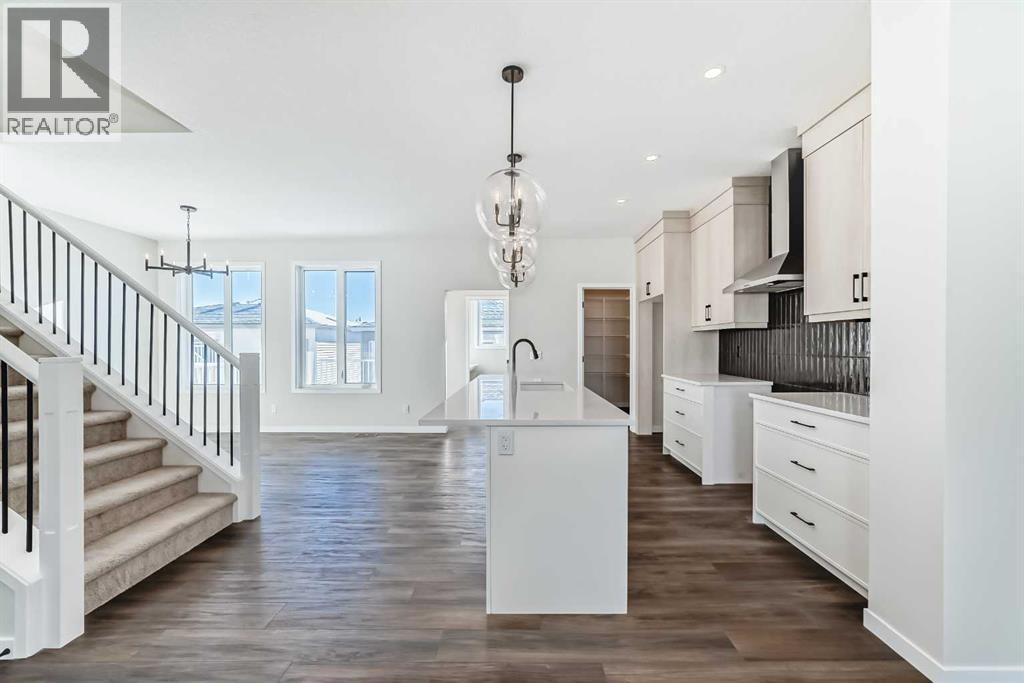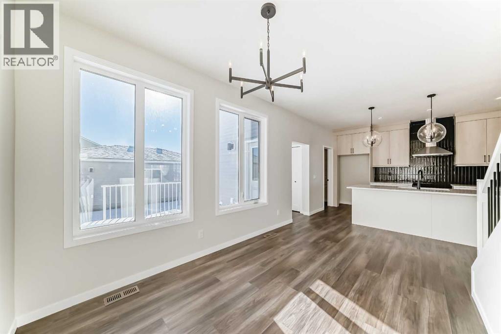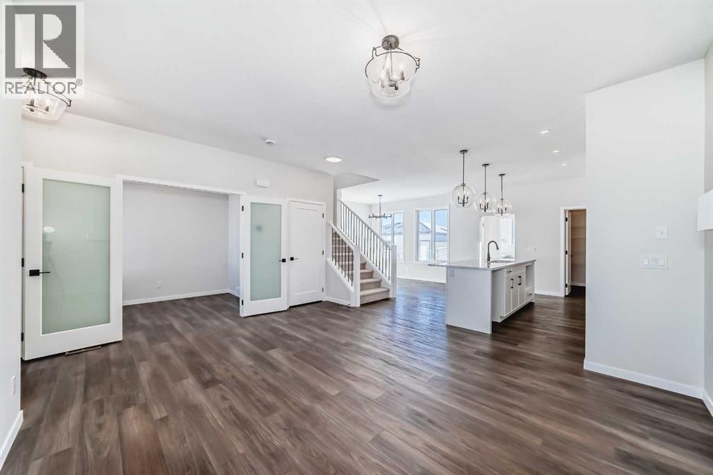 Welcome to the Forrester—a rare, family-friendly porchfront home fronting directly onto the park, paired with a triple detached garage and a driveway/parking setup that can accommodate up to six vehicles. This is the kind of combination that’s almost impossible to find, and it delivers a lifestyle that feels special from the moment you arrive. Start your mornings on the spacious 225 sq ft front porch, coffee in hand, watching the park come to life—perfect for playdates, dog walks, or simply enjoying an open view right outside your front door. Inside, the home is bright and welcoming thanks to large windows at both the front and back, carrying natural light deep throughout the day and every season. The main floor is designed for real life: a generous front living room and a flexible main-floor flex room (office, playroom, craft room—your call) lead into an open-concept layout anchored by a modern galley-style kitchen. You’ll love the elevated finish package here, including two-tone cabinetry, full-height upper cabinets, soft-close doors, quartz countertops, striking black hardware, and an upgraded chimney hood fan with built-in microwave. A large central island makes everyday meals and entertaining easy, while the oversized walk-in “Costco-ready” pantry keeps everything organized. Luxury vinyl plank flooring flows throughout the main level, tying it all together with a clean, contemporary feel. Off the rear entry, the mudroom adds practical function—complete with a private powder room that’s ideal for busy family routines. Cozy evenings are effortless in the open living space with a contemporary gas fireplace (cantilever-style feature), and the home is already set up for outdoor hosting with a gas line for the BBQ. For home chefs, you’ll also appreciate the gas line to the kitchen range—ready for your preferred cooking setup. Upstairs, you’ll find three bedrooms arranged for comfort and privacy, including winged secondary bedrooms that help keep everyone’s space thei r own, plus a convenient upper laundry room. The owner’s suite is a true retreat with no directly shared walls, a dramatic vaulted ceiling, large bright windows overlooking the park-facing front yard, a spacious walk-in closet, and a spa-inspired 5-piece ensuite with a soaker tub and dual vanities. Finishing touches like metal stair railings add to the home’s modern, upscale feel. Outside, the standout continues: a large triple detached garage, plus an exceptional amount of additional parking—whether it’s guests, toys, or a growing household, this is a game-changer. A park-front location, a triple garage, parking for up to six, and a well-curated interior finish package—this Forrester checks boxes that rarely come together in one home. Living in Vista Crossing means enjoying the best of both worlds: the convenience of city living just a short drive from Calgary, paired with the charm and slower pace of small-town life in Crossfield. This thoughtfully planned community fosters a strong sense of belonging. (id:63190)