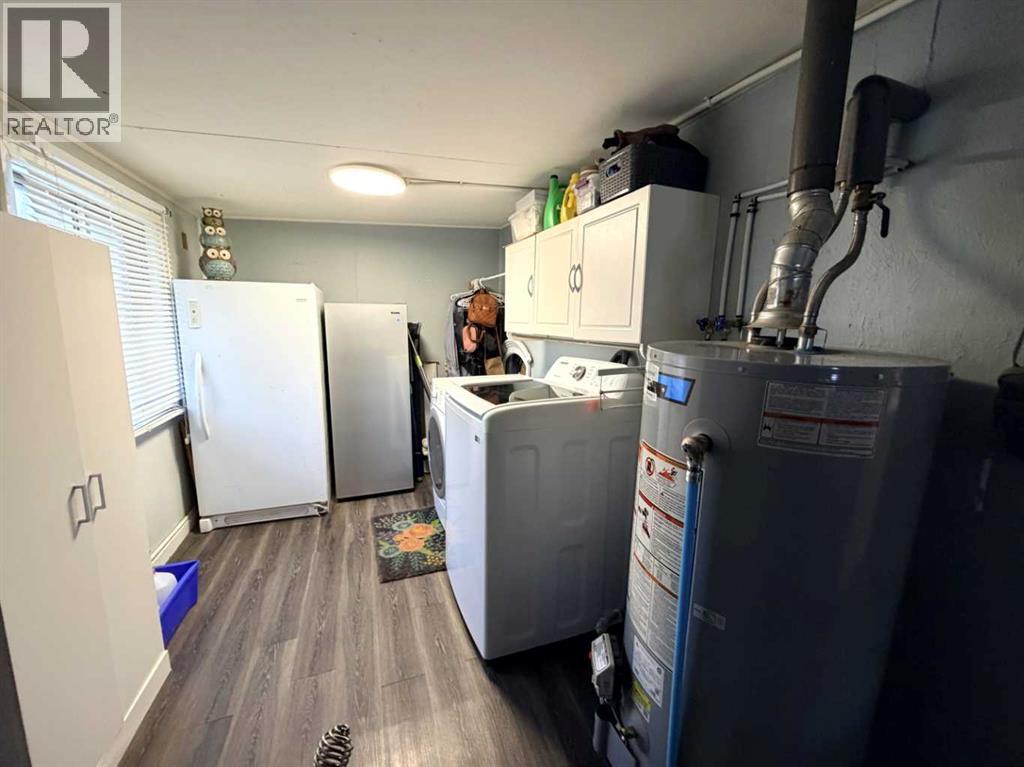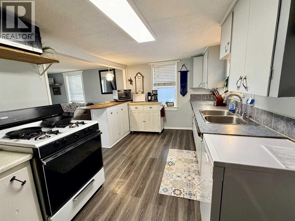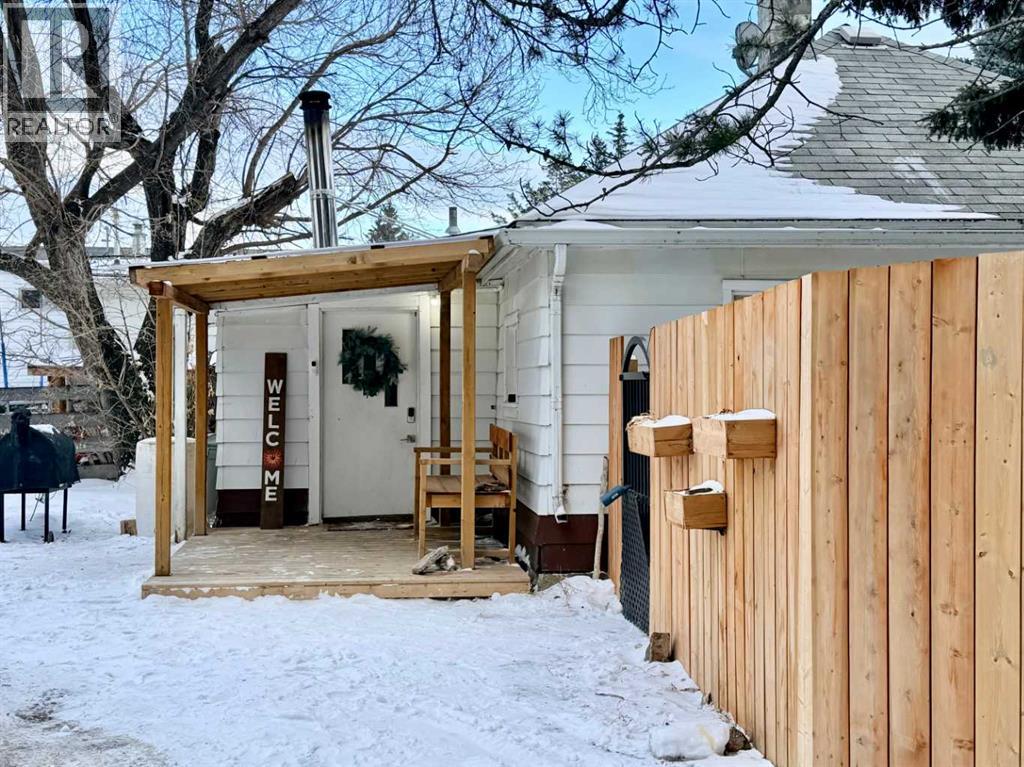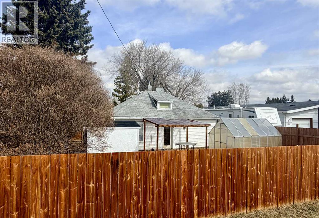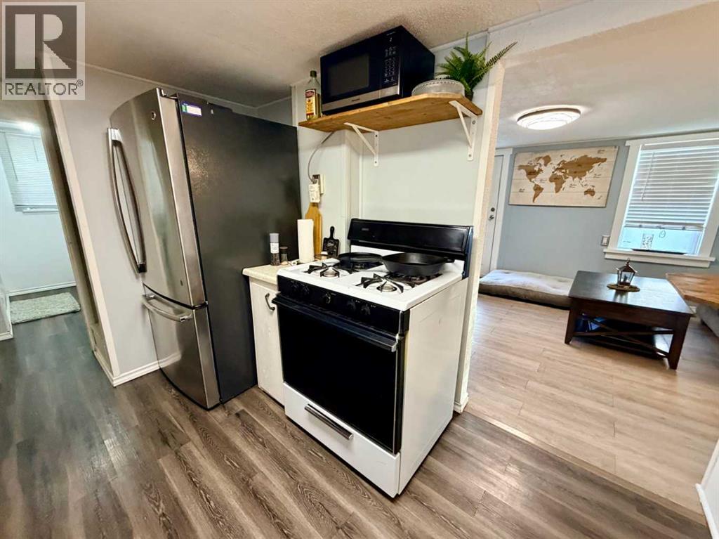 Affordable and cozy one bedroom home in the quiet community of Leslieville. You conveniently enter the home from the side entry way that has a newer covered front patio and once inside you'll find the oversized back porch with a free standing wood stove, laundry area and hot water tank that was replaced in 2024. Moving into the galley style kitchen there's a gas stove, large fridge, dishwasher and eating counter. The space opens up to the living room where a propane floor furnace helps keep it nice and cozy. A front door leads to the recently fenced front yard, another covered patio and small green house. The main level bedroom has room for a queen sized bed and built-in closet shelving plus there's a 3 piece bathroom just off the entry way. The attic area serves as additional storage or could make a craft room or home office. Towards the back of the lot is a single detached garage, insulated and wired with 220, a gravel floor and overhead door, rv parking pad and storage shed. Alley access and mature lilac trees run along the west side of the property. (id:63190)