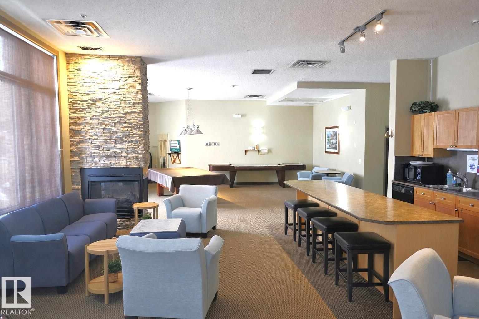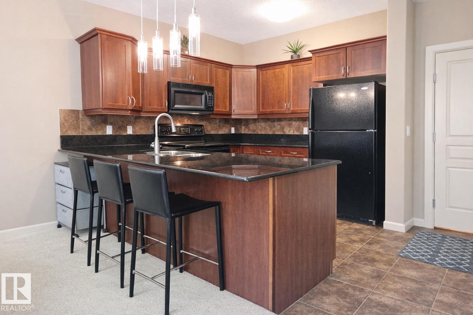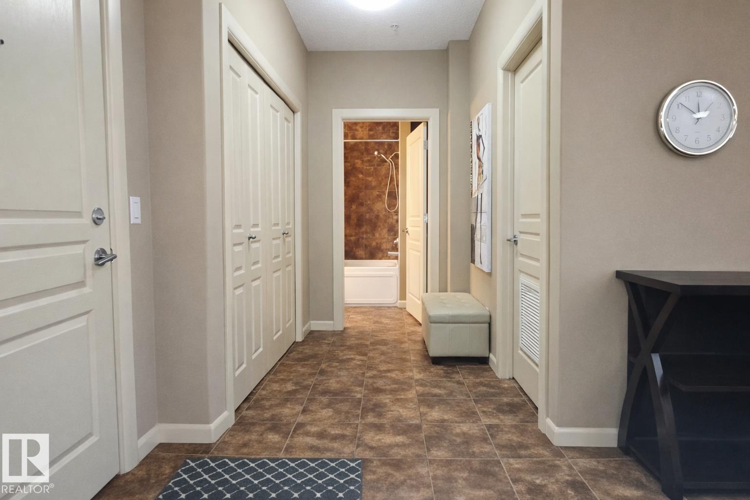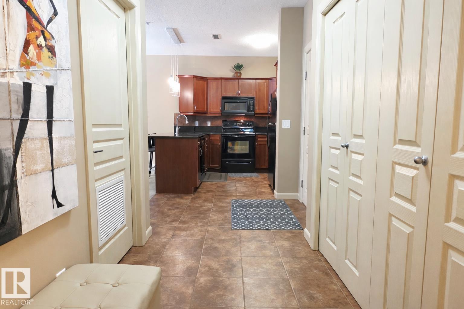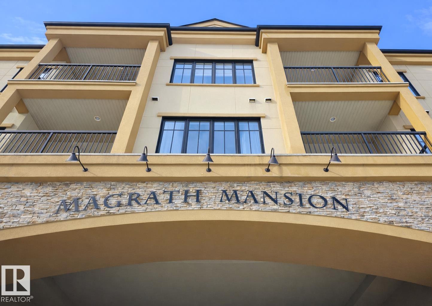 Welcome to Magrath Mansion, a prestigious 18+ residence constructed with steel & concrete for superior soundproofing & long lasting quality. This well maintained, move in ready 825 sqft open concept 1 bedroom unit offers 9’ ceilings, large windows, tile flooring & comfortable infloor heating. The bright living area opens to a covered west facing patio for year round enjoyment. Enjoy the chef’s kitchen which offers generous cabinet & counter space along with convenient insuite laundry. The 4pc bath is beautifully finished with tiled shower walls & a relaxing jetted tub. Featuring A/C, heated underground parking & storage cage, this unit checks all the boxes. Residents have access to an impressive amenity building with a theatre room, fitness center, hot tub, steam room & BBQ area. Ideally located just steps from the ravine, parks, walking trails, restaurants, shopping & transit with easy access to major roadways. An exceptional opportunity in one of Southwest Edmonton’s most sought after communities! (id:63190)
