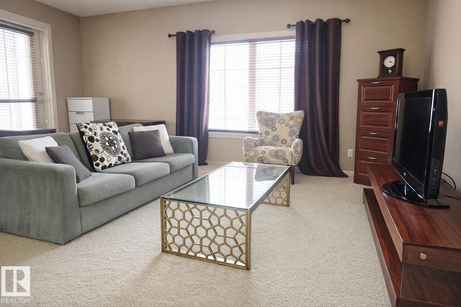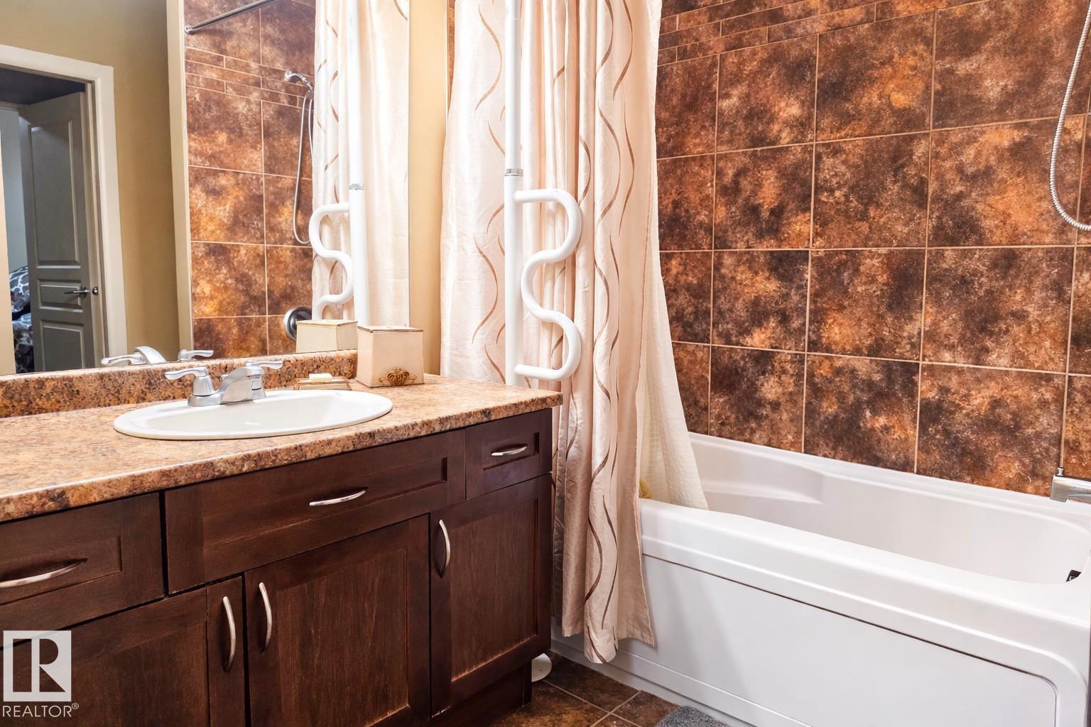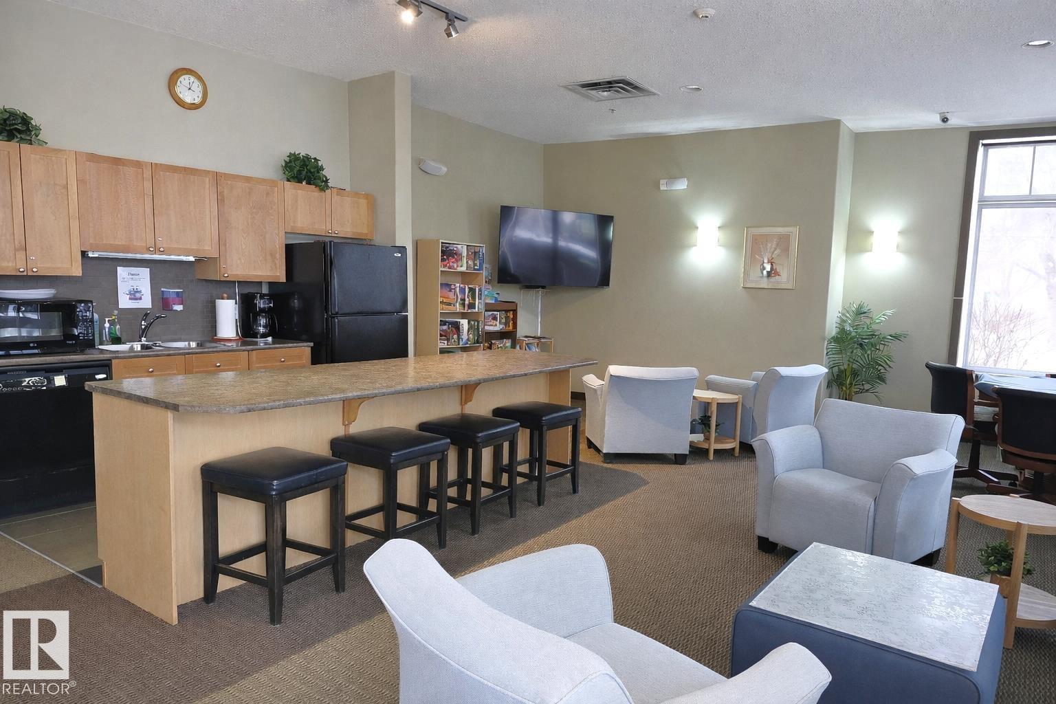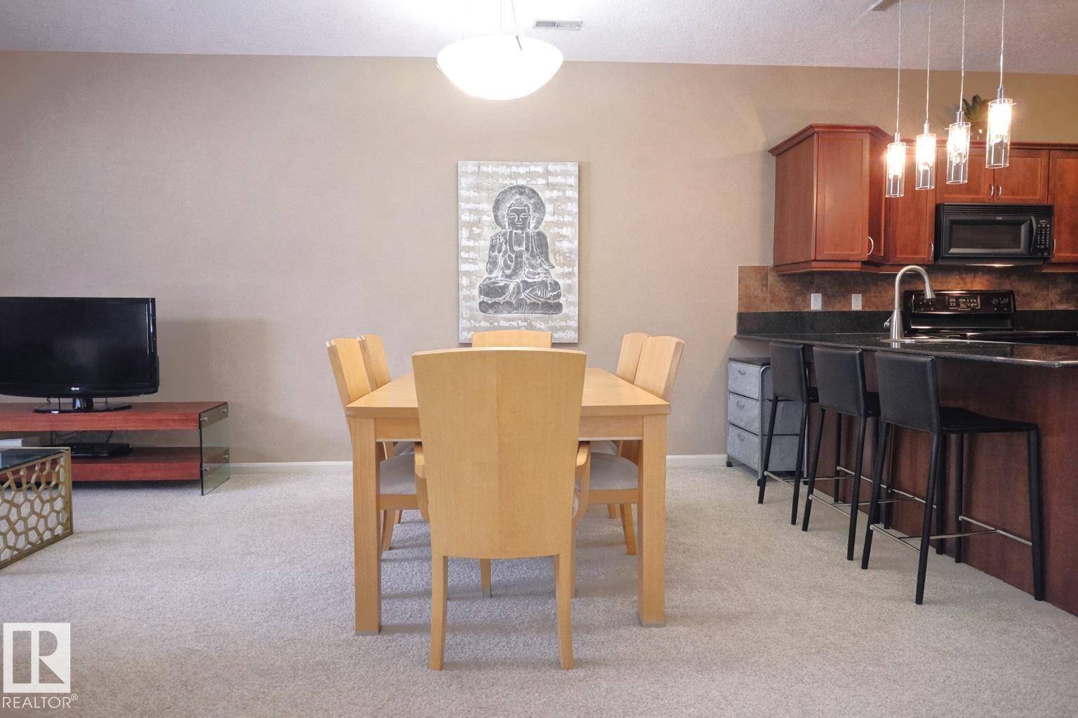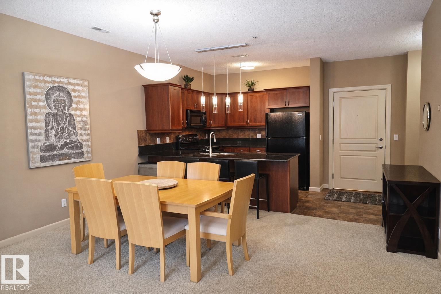 Welcome to Magrath Mansion, a prestigious 18+ residence constructed with steel & concrete for superior soundproofing & long lasting quality. This well maintained, move in ready 825 sqft open concept 1 bedroom unit offers 9’ ceilings, large windows, tile flooring & comfortable infloor heating. The bright living area opens to a covered west facing patio for year round enjoyment. Enjoy the chef’s kitchen which offers generous cabinet & counter space along with convenient insuite laundry. The 4pc bath is beautifully finished with tiled shower walls & a relaxing jetted tub. Featuring A/C, heated underground parking & storage cage, this unit checks all the boxes. Residents have access to an impressive amenity building with a theatre room, fitness center, hot tub, steam room & BBQ area. Ideally located just steps from the ravine, parks, walking trails, restaurants, shopping & transit with easy access to major roadways. An exceptional opportunity in one of Southwest Edmonton’s most sought after communities! (id:63190)