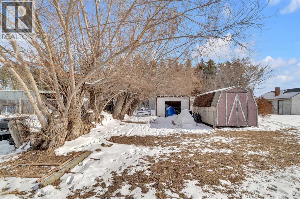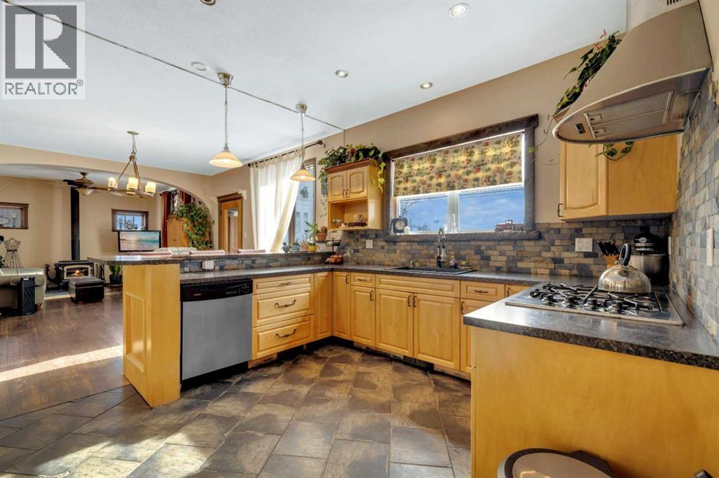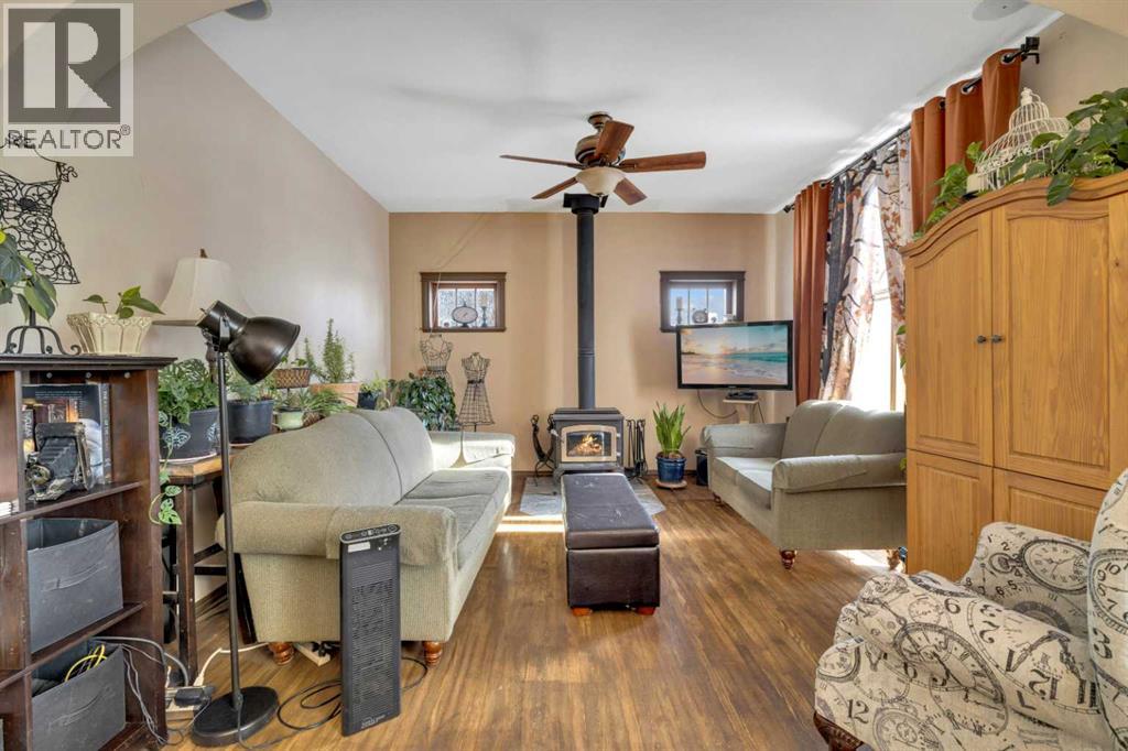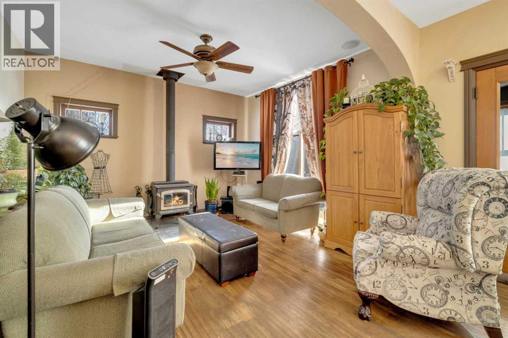 Country Charm meets Cozy comfort on this updated 0.82 Acre Mini-acreage. This 2 bedroom, 1 bathroom character home features and inviting open-concept layout, a stunning kitchen and a warm wood stove that anchors the living space. Outside you’ll find a MASSIVE detached garage – insulated, and boasting 10ft interior walls – perfect for a workshop, storage or all the toys. The fully fenced yard (7.5ft tall page wire) offers exceptional space and privacy, ideal for pets, kids or just space to relax. The paved front drive extends over 100ft, providing ample parking for trucks, RVs, trailers and more. Connected to town water with its own septic system, this property offers convenience with no neighbours behind – you truly get the best of both worlds. (id:63190)