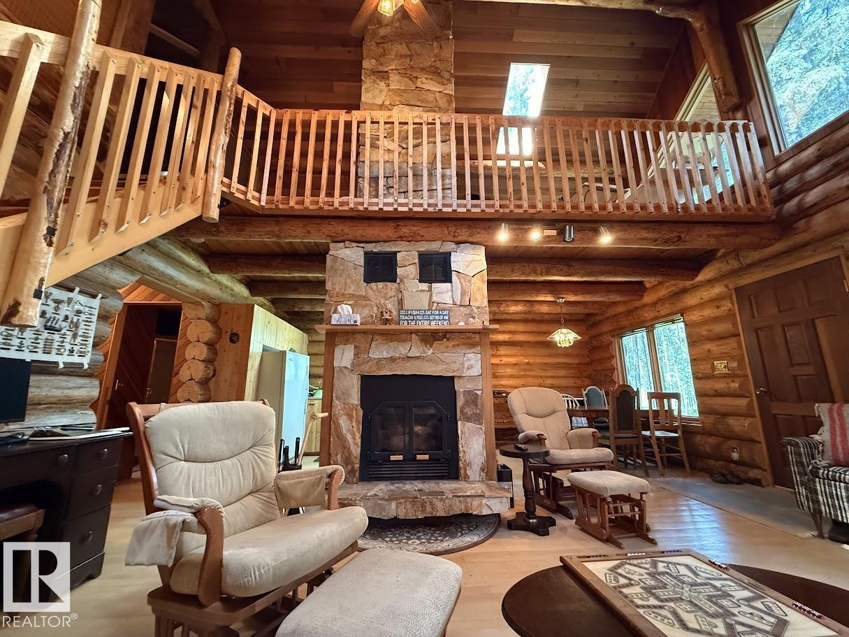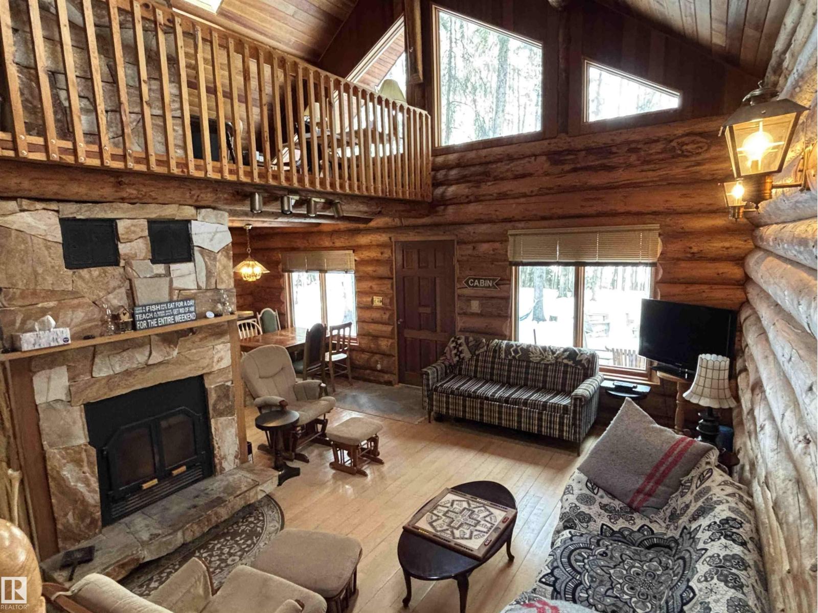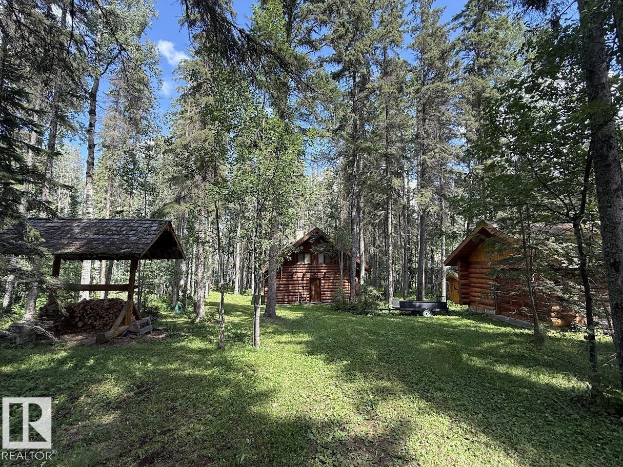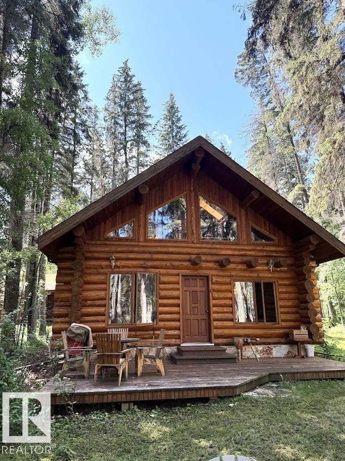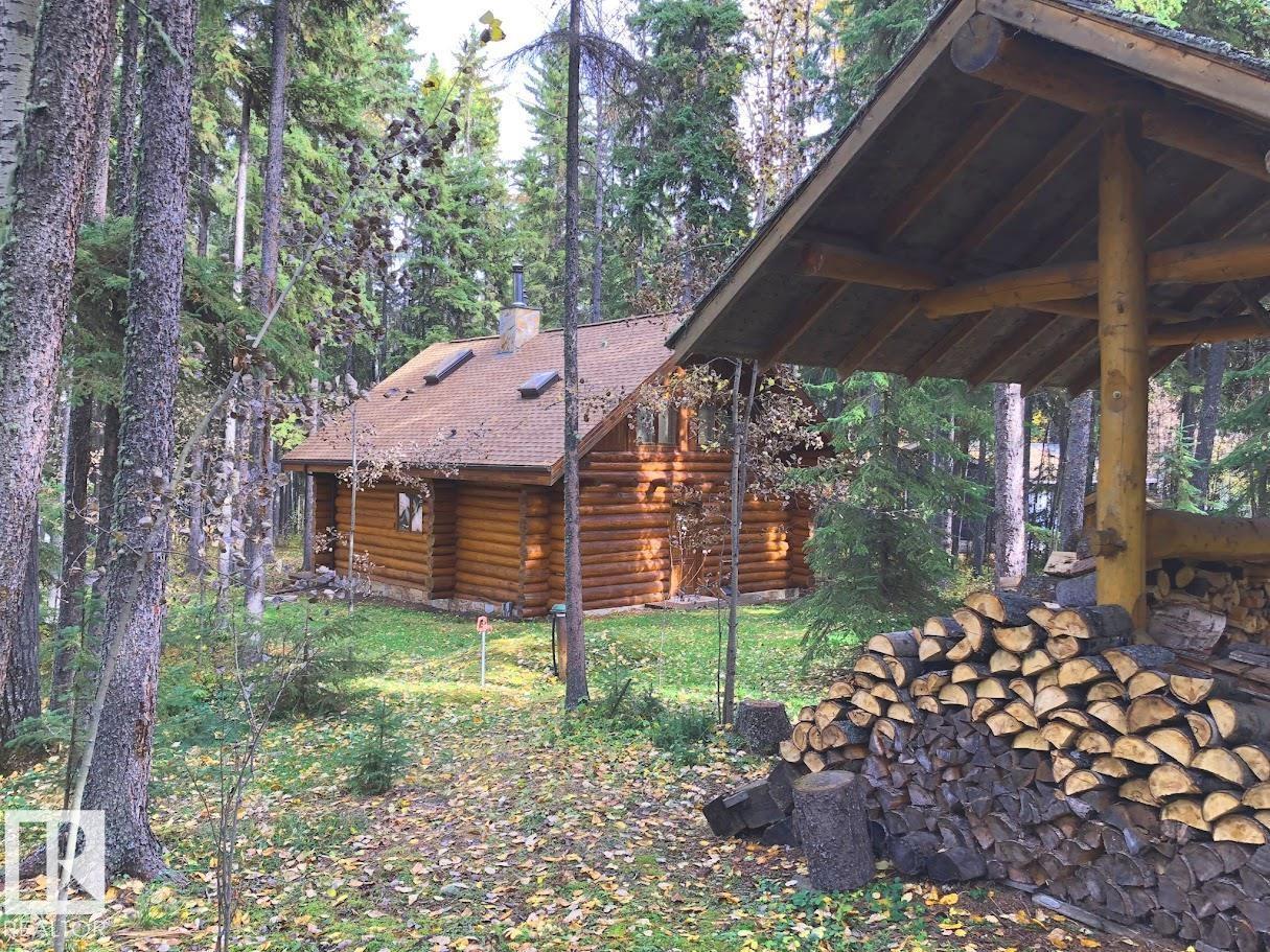 Tucked among the towering spruce on a scenic half-acre lot, this lakefront log cabin offers the perfect blend of rustic charm and peaceful privacy. The inviting cabin features a stone-faced wood-burning fireplace that provides natural warmth, complemented by two wall-mounted gravity furnaces. The kitchen, highlighted by a classic “Happy Thought” wood cook stove, is perfect for preparing meals the old-fashioned way or choose the microwave and countertop stove for modern ease. Inside, you’ll appreciate beech flooring, pine cabinetry, and generous lakeside windows that flood the home with natural light. The primary bedroom and 3-piece bath, are on the main floor with the loft offering two additional bedrooms plus an open bonus area, ideal for extra sleeping space or a games area. Furniture, household goods, shed, boat lift and 112 ft. dock are included. Adjacent lot #21, MLS#E4475321, is also available for sale providing a rare opportunity to own over 1 acre of lakefront property in Buck Lake Estates. (id:63190)