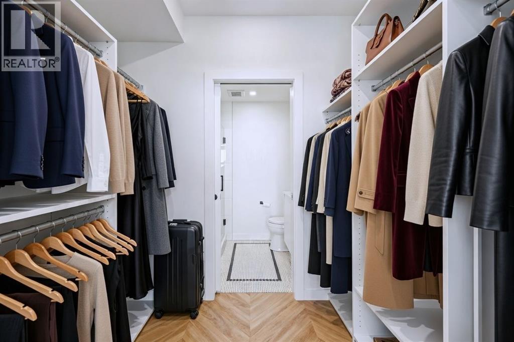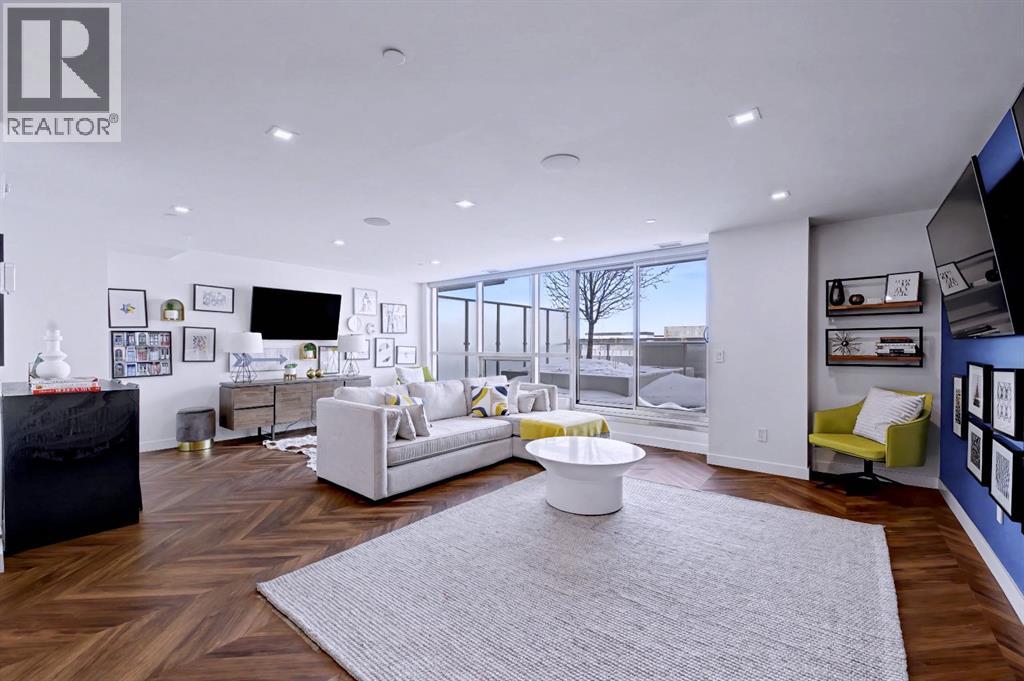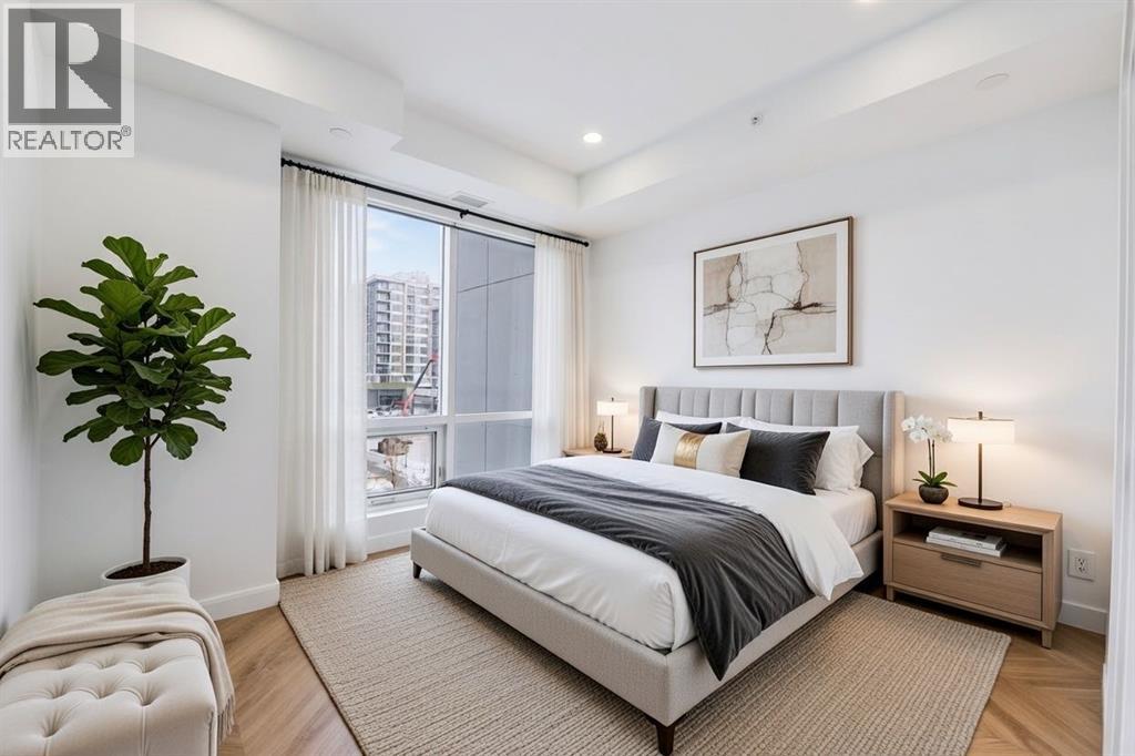 Welcome to unit 303, 8505 Broadcast Ave at the Gateway in West Springs. . Where elevated design meets everyday comfort in this beautifully crafted 2 Bed, 2 Bath condo with dedicated office space and additional storage. Located within one of Calgary’s most sought-after master-planned communities, this home delivers a refined living experience from the moment you step inside.You’re immediately greeted by soaring ceilings and striking chevron patterned wide plank luxury flooring that sets the tone for the sophisticated interior. The designer kitchen is a true showpiece, finished in a stunning super matte palette and accented with brushed gold hardware. Culinary enthusiasts will appreciate the premium appliance package, including a panelled 36” integrated Fisher & Paykel refrigerator, panelled dishwasher, gas cooktop, and built-in wall oven. Custom soft-close cabinetry, under-cabinet lighting, and quartz countertops paired with a full height quartz backsplash complete the upscale aesthetic.Expansive windows and a large sliding patio door flood the space with natural light while showcasing Calgary’s iconic big sky views. Step outside to a generously sized balcony with ample room for outdoor seating and dining, perfect for relaxing or entertaining.The spacious primary bedroom easily accommodates larger furnishings and features a walk-through closet that leads to a beautifully appointed ensuite with a separate oversized shower, quartz counters, and elegant flooring. The second bedroom is also well proportioned and located near the stylish four-piece main bath, complete with a deep soaker tub, quartz counters, and custom finishes. A convenient in-suite laundry room adds to the functionality of the home.Residents of Gateway enjoy exceptional amenities, including an Owner’s Lounge on the same level, a heated underground parkade with one titled parking stall and electric vehicle charging stations, and energy-efficient construction with advanced mechanical systems. The building also features a rooftop patio, social room, secure bike storage, main floor concierge service, and vibrant ground-level retail including restaurants, shops, and health and wellness studios.Families will appreciate being just steps from Calgary French & International School and only minutes to respected institutions such as Webber Academy, Rundle College, and Ernest Manning High School. With quick access to Stoney Trail, commuting is seamless and weekend escapes are effortless. (id:63190)