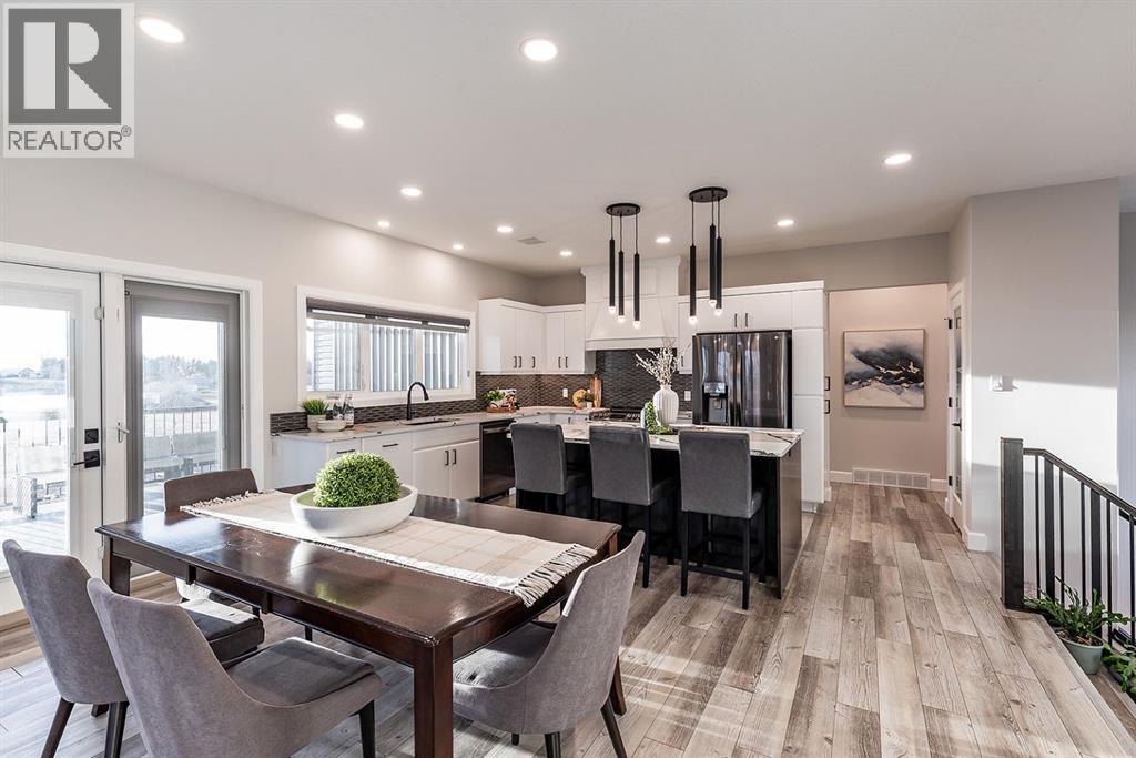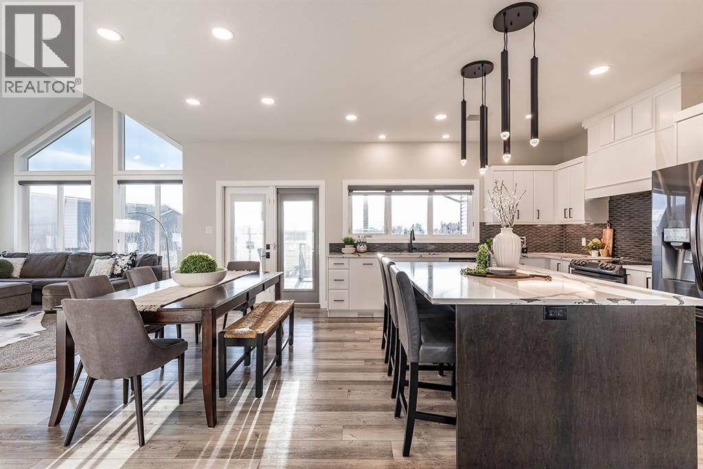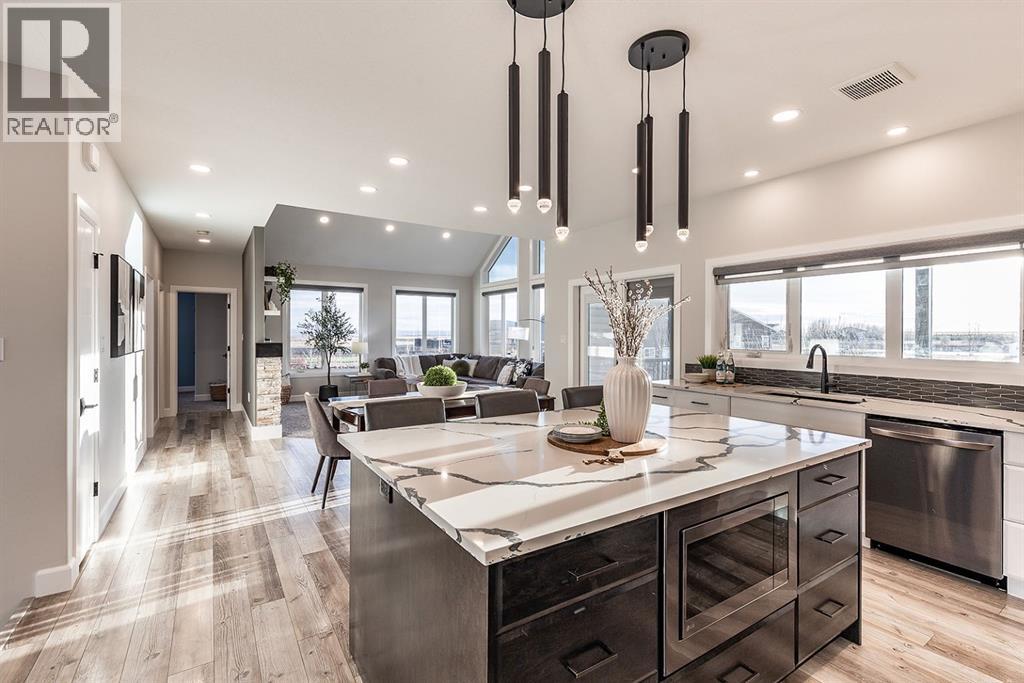 Rare Lake Community Home!!! Welcome to the kind of lakefront lifestyle most people only dream about!! Tucked along the peaceful shores of Klaudt’s Dam and only 15 minutes from town, this 2.17-acre property isn’t just a home — it’s a place where families grow, gather, and make memories all year long. From summer mornings spent on the water to winter evenings skating under prairie skies, this is a lifestyle that invites you to slow down, breathe deeper, and truly enjoy where you live. At the center of it all is a beautiful custom bungalow that blends thoughtful design with timeless style. The main floor welcomes you with an open-concept layout that frames those incredible lake views from every angle. The kitchen is built for connection — a large island for kids to perch at, quartz countertops, high-end appliances, and plenty of space to cook, gather, and celebrate!! Vaulted ceilings and a cozy fireplace make the living room the heart of the home, whether you’re hosting friends or winding down after a day on the lake. Step out onto the covered deck to take in the calm water, the huge yard, and the simple joy of having nature as your backdrop. The primary suite feels like a private retreat with its own lake views, a spa-inspired ensuite, and a clever pass-through walk-in closet connected directly to the laundry room — the kind of everyday convenience you won’t know how you lived without. Two more bedrooms and a full bath round out the main floor. The fully finished lower level adds even more room for living and playing. A spacious family area, rec room, and a flexible space perfect for a gym, playroom, home office, or hobby room make it easy for everyone to have their own corner of the home. Two additional bedrooms (the flex space could become a 6th if needed) and another full bath create the ideal setup for kids, guests, or multigenerational living. And then there’s the garage — oversized, heated, a dog run, hot & cold water, and built with both practicality and possib ility in mind. Park multiple vehicles, set up a workshop, or store all the gear that comes with true acreage and lakefront living. With city water from West Side Water Co-Op and pressurized for irrigation, caring for the property is effortless. The expansive yard is ready for family barbecues, outdoor adventures, and long, relaxed evenings under the open prairie sky. And with the lake just steps away, every season brings something to look forward to — swimming, fishing, paddleboarding, skating, or simply sipping your morning coffee by the water.Whether you’re searching for a full-time family home or a place to escape and reconnect, this lakefront acreage in this special community offers something rare: luxury that feels liveable, nature at your doorstep, and a lifestyle designed for connection, adventure, and joy. This home is in immaculate condition; all that is to do is move in and start enjoying! *Photo 1 is enhanced* (id:63190)