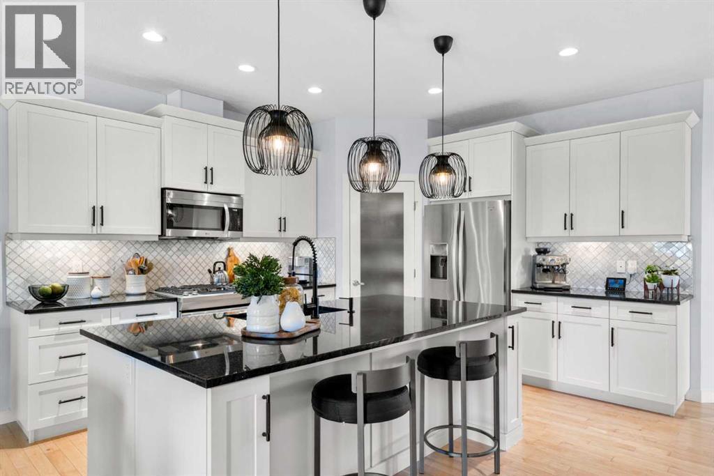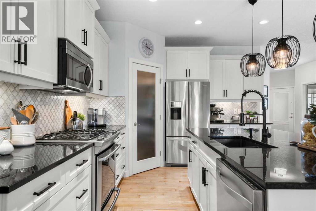 * PRICE IMPROVEMENT = EXCEPTIONAL VALUE * End-unit, low-maintenance, bungalow villa in a rarely available complex * Presenting 25 Fireside Landing anew with a fresh perspective and standout upgrades, this home truly stands out and is one you won’t want to miss! This stellar 3-bed + den, 3-bath Calbridge Home by La Vita Land is timeless with its stone and grey exterior siding façade, set on a 5,974 sq ft lot. Greeted by a thoughtfully recessed front porch, this tucked-in design offers a private sheltered entry from the elements and a welcoming curb appeal, and into an inviting foyer with maple hardwood flooring, modern baseboards, fresh paint tones, and elevated finishes throughout the home’s interior. Just off the entry, a sunlit den, currently occupied as an art studio, offers a versatile space ideal for a home office, creative retreat, or quiet flex room, and down the hall, smart living unfolds with a powder room and a mudroom-laundry combo with access from the insulated double-attached garage. The home opens beautifully into a bright kitchen, dining, and living room layout designed for effortless everyday living and when entertaining guests, where the kitchen shines with shaker cabinetry, sleek hardware, granite counters, s/s appliances, a centre island with seating, and a walk-in pantry. From there, the dining area flows into the living room, where a cozy fireplace anchors the room and large windows draw you toward the backyard. Privately positioned for rest and retreat, the king-sized primary bedroom is enhanced by a striking paneled feature wall, creating a serene sanctuary, with a spa-inspired 5-piece ensuite with dual vanities, soaker tub, walk-in shower, and water closet, all complemented by a large walk-in closet. Downstairs, the fully-finished lower level turns up the volume with a spacious family room ready for movie nights, playlists, and lively gatherings. Large enough to create two distinct zones, it’s styled with a home office but could easily transf orm into a games or bar area when hosting parties. Completing the lower level are two additional bedrooms, one which is staged as a home gym, offering flexible space for family, guests, or hobbies, along with a convenient 4-piece bathroom and extra-large, organized storage utility room providing practical space for seasonal items and overflow. 30 mins to the Rockies, with 63 acres of parks, green space, shops nearby, and quick Highway 1 access to Calgary, life balances ease and adventure. The beauty of villa living makes for a snowbird’s dream, where monthly condo fees include lawn maintenance and snow removal for peace of mind. That freedom means more time to travel, rightsize, or simply embrace a lock-and-leave lifestyle without sacrificing or compromising comfort or space. At Clearbook Villa of Fireside, you’re not just buying a home; you’re choosing a lifestyle designed for ease, connection, and enjoying what matters. (id:63190)