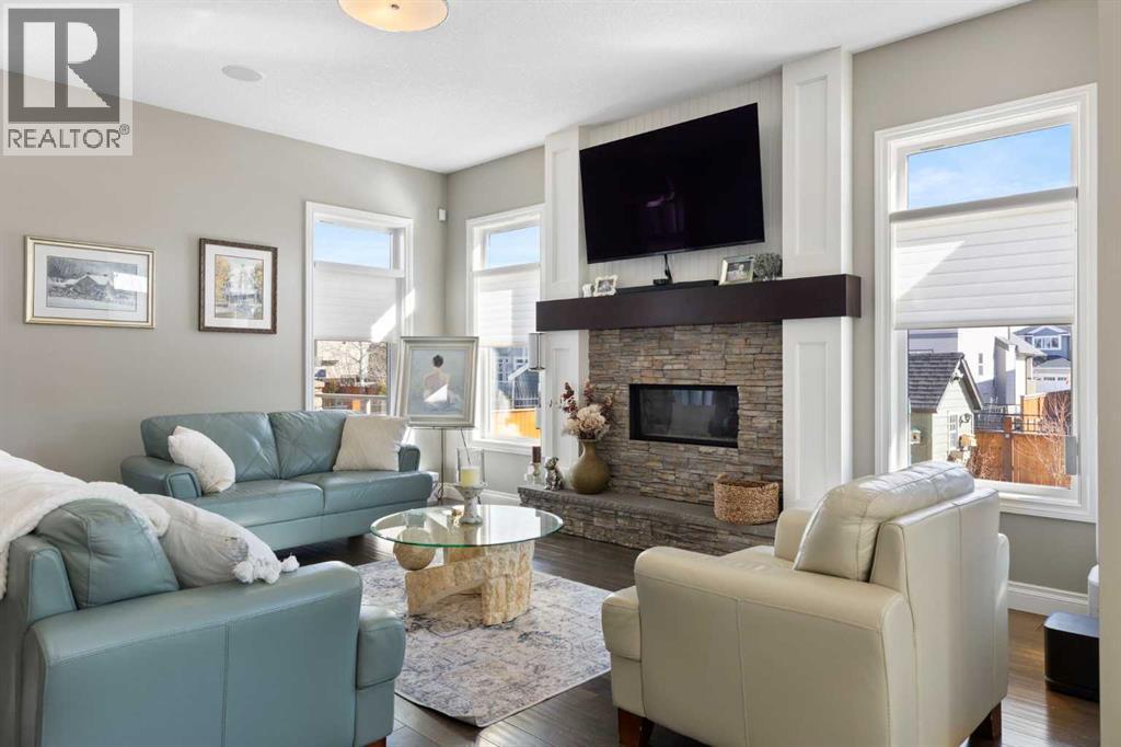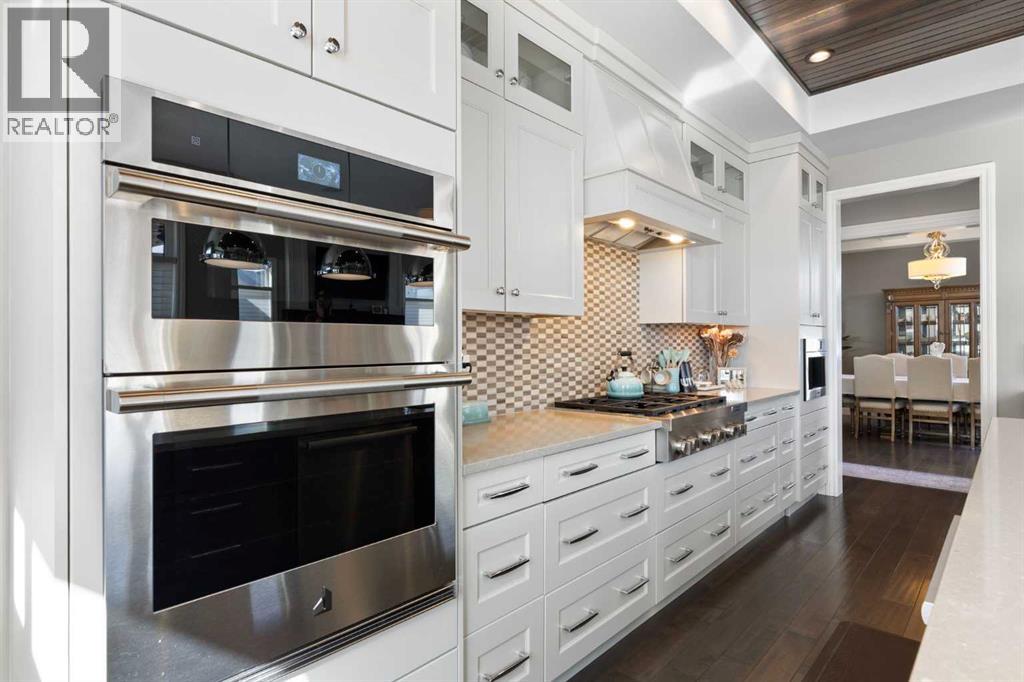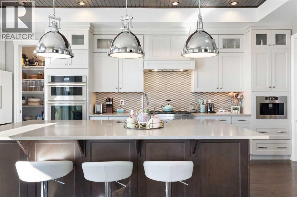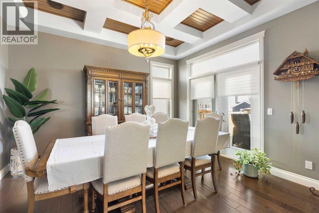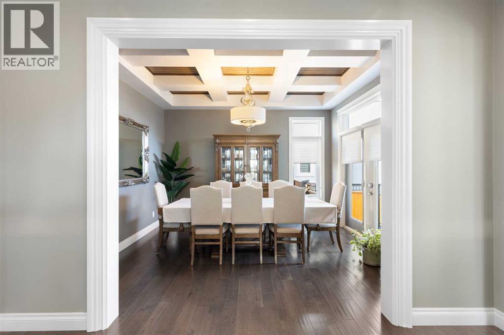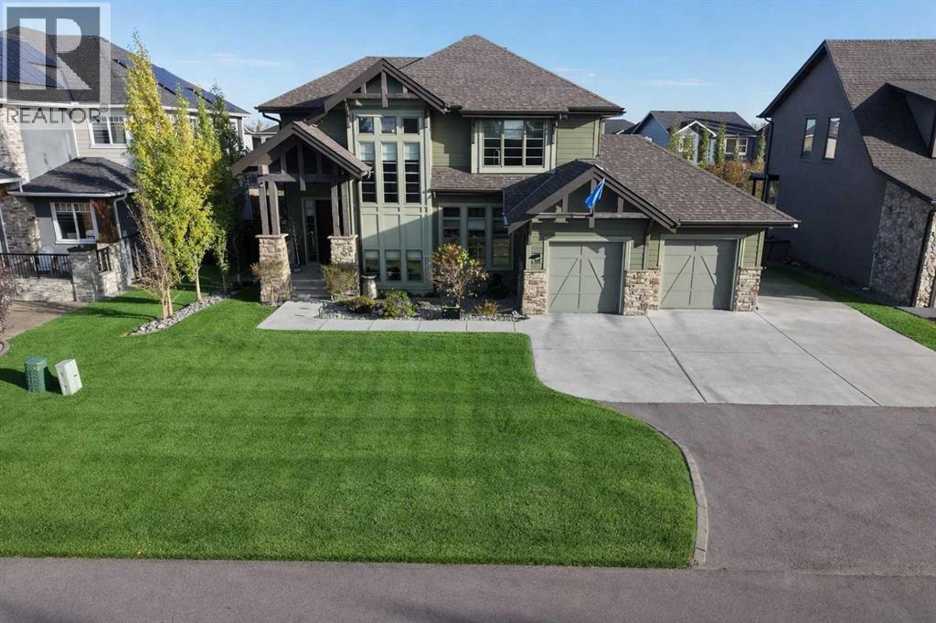 Welcome to this exceptional custom-built residence where timeless architecture, elevated craftsmanship, and advanced technology come together to create a truly remarkable home. Offering 4,343 sq ft of developed living space, this property delivers an outstanding blend of luxury, comfort, and thoughtful design. From the moment you arrive, the striking curb appeal sets the tone with rich timber accents and elegant stone detailing. Inside, soaring 10-foot ceilings, expansive windows, and rich hardwood flooring create a bright, open atmosphere filled with natural light. The heart of the home is the stunning chef-inspired kitchen, designed for both entertaining and everyday living. Anchored by an oversized quartz island, this impressive space features extended pantry storage, custom cabinetry, and high-end appliances. The kitchen flows effortlessly into the dining nook and living room, where a gas fireplace creates a warm focal point. Step outside to one of two decks and enjoy seamless indoor-outdoor living. The formal dining room showcases custom coffered ceilings and direct access to the second deck, offering a refined setting for hosting family and guests. A private home office and a stylish powder room featuring a heated bidet complete the main level. Upstairs, 9-foot ceilings and a thoughtfully designed layout provide both comfort and privacy. A spacious bonus room offers the perfect space for relaxing or movie nights. The luxurious primary suite is a true retreat, featuring large windows, a generous walk-in closet, and a spa-inspired ensuite complete with a freestanding soaker tub, dual sinks, oversized walk-in shower, and heated bidet toilet. Two additional bedrooms, a beautifully finished full bathroom with dual sinks and separate shower and toilet space, along with convenient upper-level laundry, complete this floor. The fully developed basement expands the home’s entertaining potential with a large recreation room featuring a second gas fireplace and a custom bar highlighted by a striking stone wine feature wall—perfect for displaying your collection. This level also includes an additional bedroom, a full bathroom, and a hidden secure safe room. Modern comfort is seamlessly integrated throughout with Control4 smart home automation, built-in speakers throughout, fully automated window coverings, and Nest thermostats, allowing effortless control of lighting, sound, climate, security and privacy. The oversized 2.5-car garage features three garage doors (two front and one side) and includes a workshop area, ideal for hobbies or additional storage. Also, set up for two charging stations. Outside, the beautifully landscaped and fully fenced yard offers the perfect balance of relaxation and entertaining. The fence was custom -built with stone corner pillars to match the house. Also complete with underground sprinklers, a custom-built shed, two decks, and a pergola. Upgrades include two furnaces, tankless hot water, and a water softener all 4 years old. (id:63190)